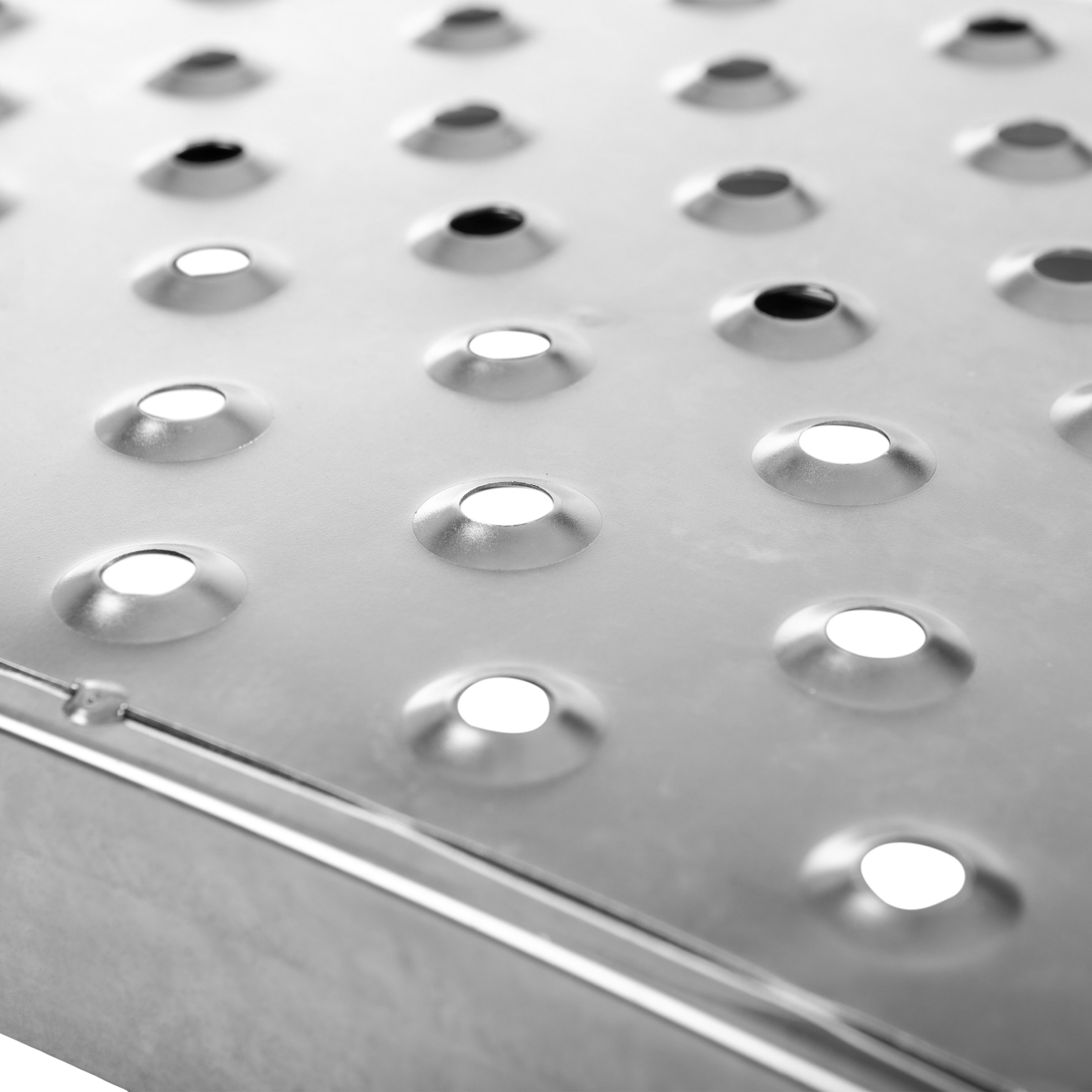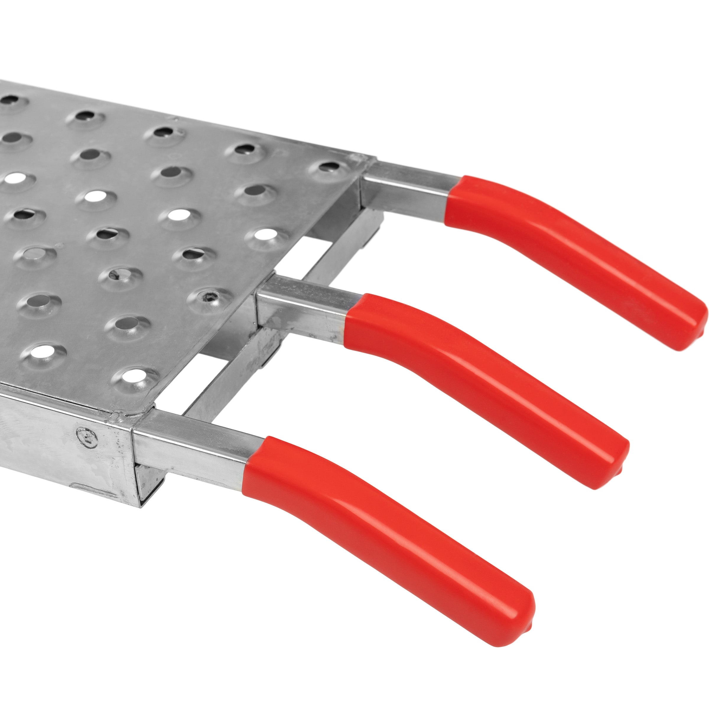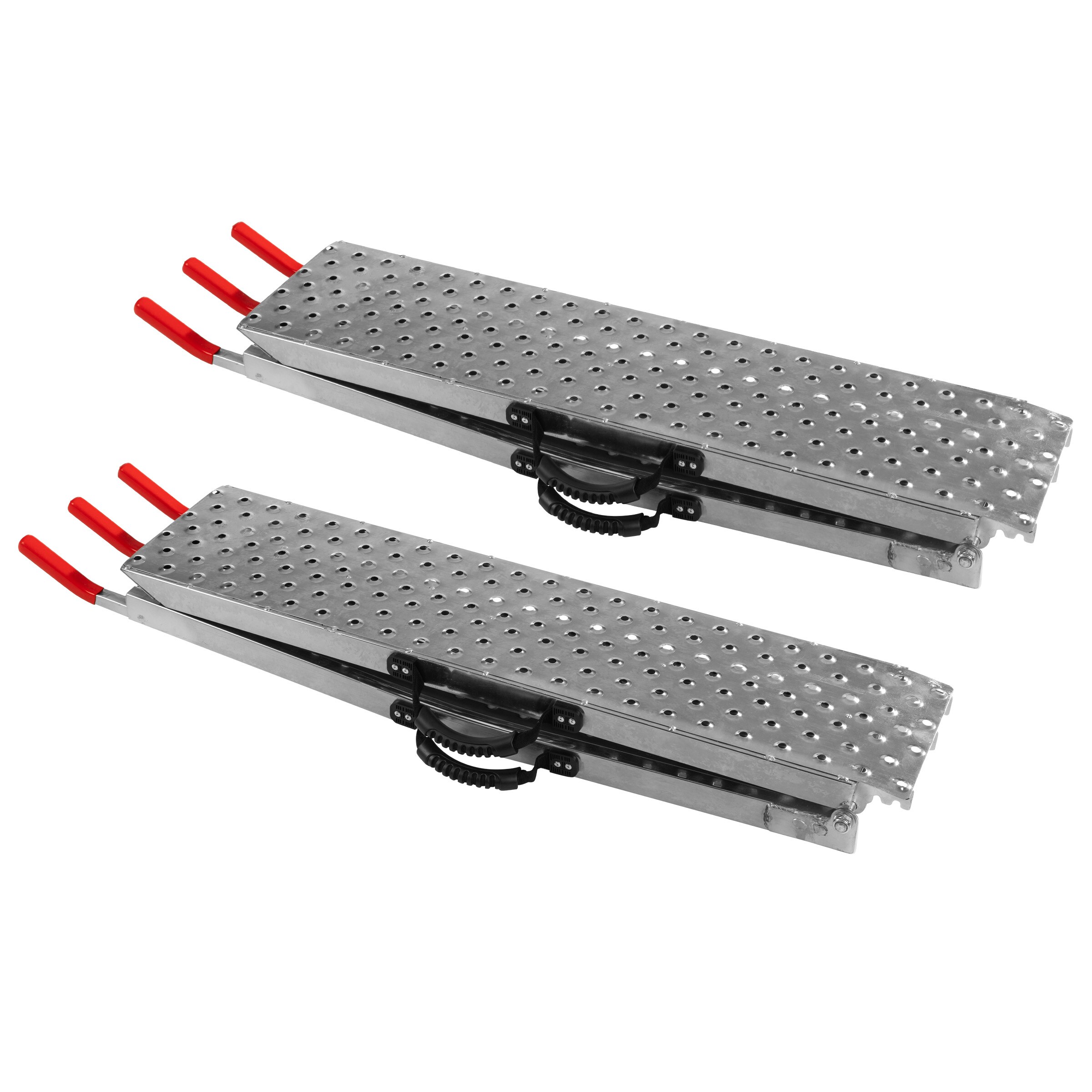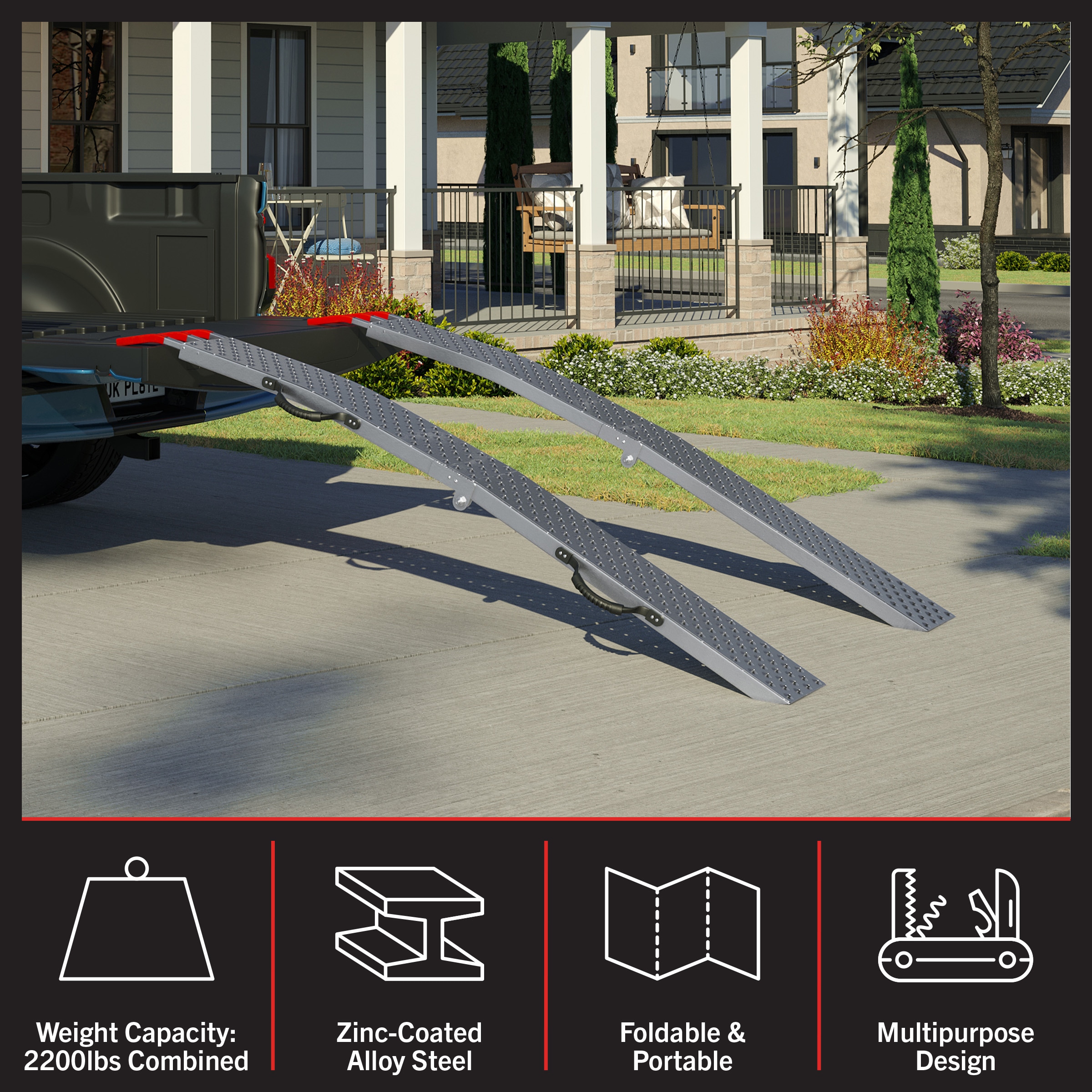 The Set of 2 Car Ramps by Stalwart is the perfect solution for getting your ATV, motorcycle, golf cart, or mower safely into a trailer, shed, pickup truck, or moving van. Each motorcycle ramp has a 1100-pound weight capacity for motorcycles or dirt bikes or use them together for 4-wheeler vehicles up to 2200lbs. Made of high-quality steel with an anti-skid design, the ramps for pickup trucks provide traction for tires of any kind while allowing water to drain through each ramp. Our shed ramps feature twice the load bearing capacity compared to competitors’ aluminum ramps and have a higher recommended usage height at 34-inches-tall.