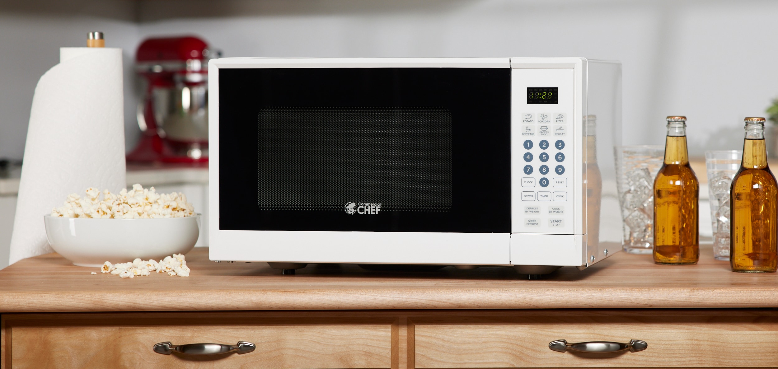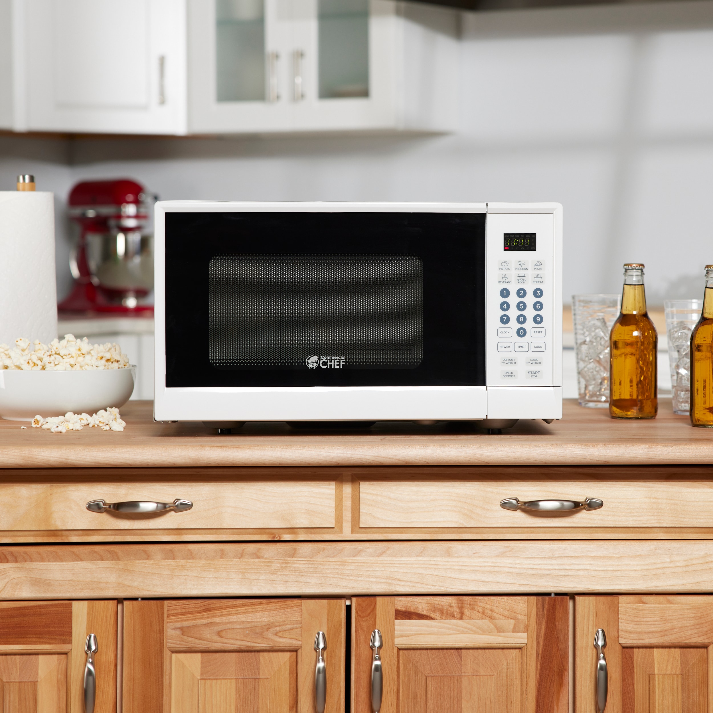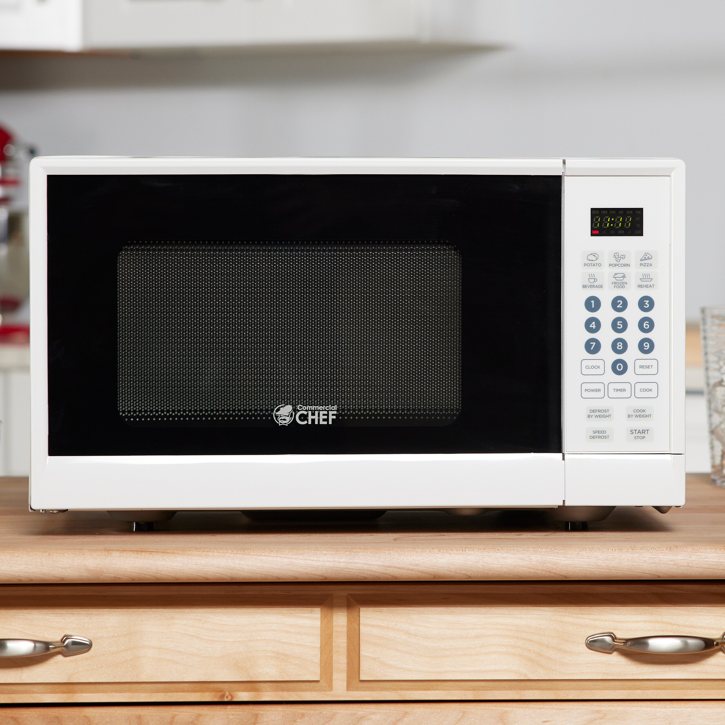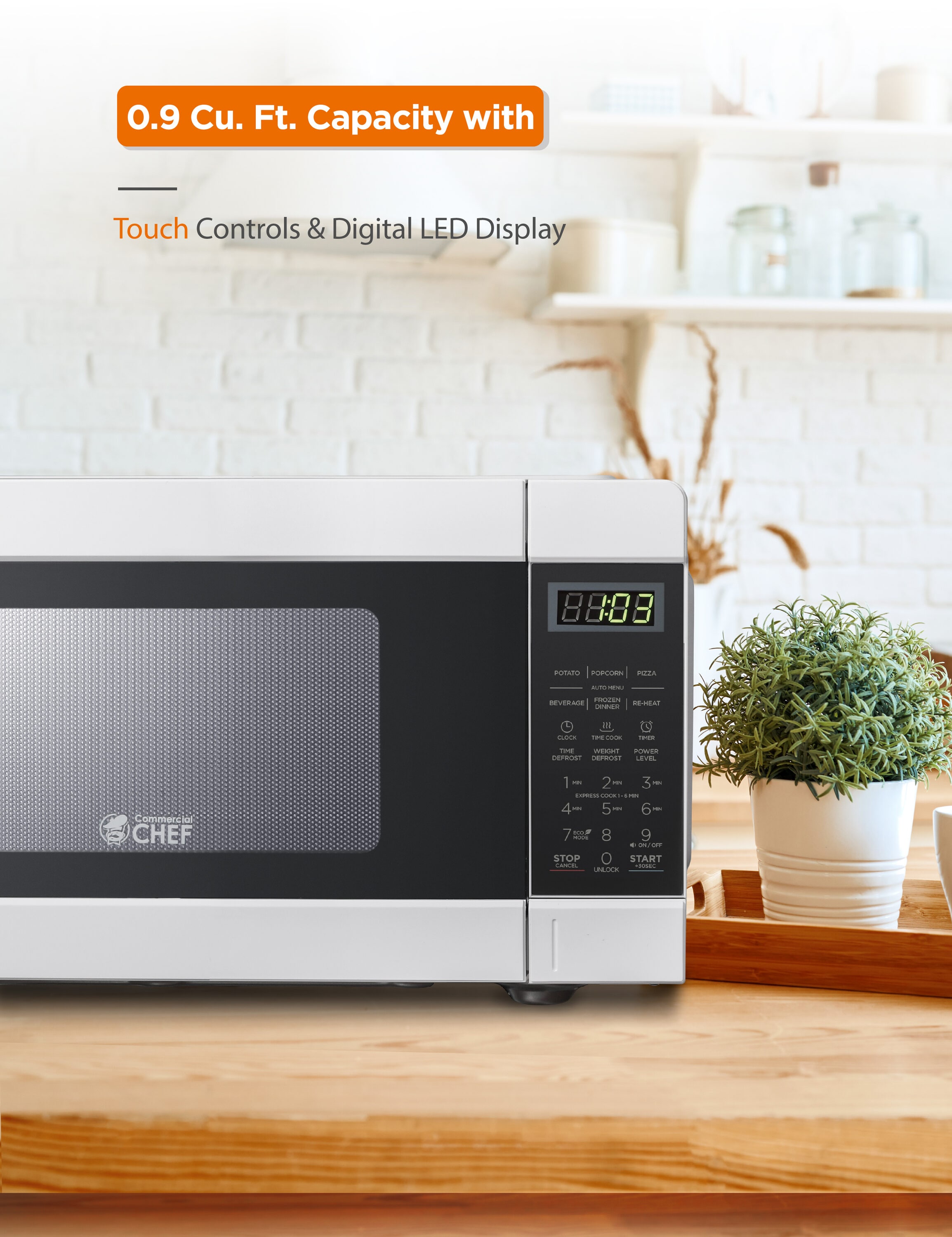 With the Commercial Chef CHMH990W you get all the right features. This countertop microwave delivers 900 watts of power and the quality that the Commercial Chef name is known for. 10 power levels let you cook or reheat a variety of foods just right. The keypad controls give you the option of inputting precise cooking times, and the clear LED display lets you know exactly how much time is left. Six one touch quick cook buttons for items like popcorn and frozen dinners add to the convenience, and the child safety lock ensures the microwave is not used without supervision. A great addition to any busy family’s kitchen.