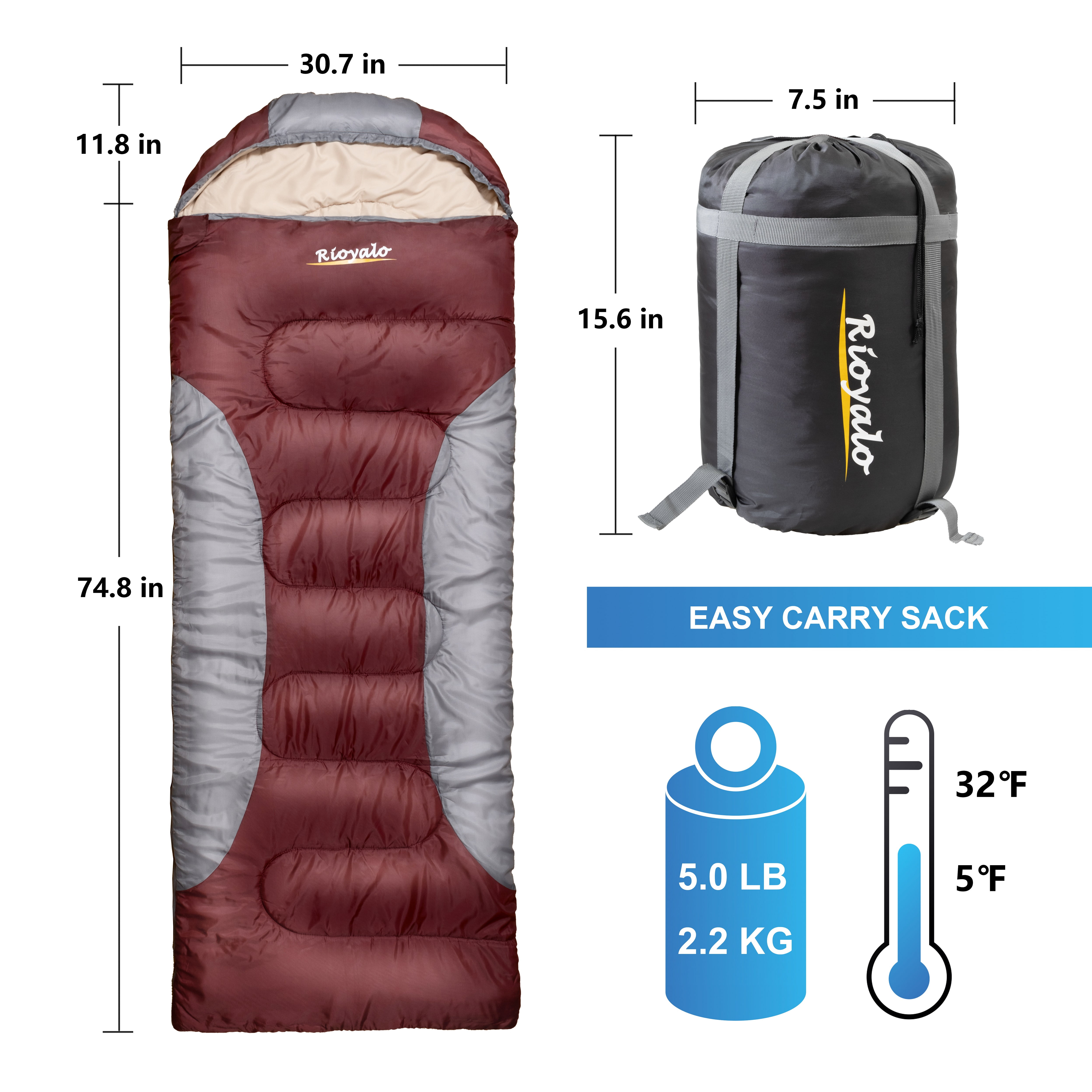 % Lightweight and Highly Portable: Top Line 100 percent polyester fiber 450GSM aligned with top-notch shell provide extra warm comfort during outdoor activities without adding extra weight to already sore shoulders (only 5 lbs). Easy Fold-able design along with a compression sack with straps makes it extremely convenient to carry, store and reuse. A perfect travel mate for camping, hiking, backpacking, as well as other outdoor activities % Ultra Comfortable and Design for COLD/WARM Weather (temperature range from 5F – 32F degree): Rioyalo sleeping bags are designed to ensure you get a good and relaxing night’s sleep after a tiring day of trekking, hiking, travel or any other exploration. It is not only good for warm weather, but also good for extremely cold weather. Thoughtful design of Wind Buffer prevents heat losing, while the detailed anti-pinch Grosgrain Ribbon prevents zipper from snags % Skin Friendly and Super Comfy: The first-rate 190T Pongee lining is skin-friendly. What a soft silky and awesome cozy feeling you will have when completely immersing yourself into this warm, comfy peapod. % High Quality and super Durable and Waterproof: Top quality 210T Nylon ripstop on the shell, 190T Pongee Lining in 100% Polyester, as well as premium 450GSM 100 percent polyester fiber filling. The ingenious workmanship precisely emerged all of these seamlessly to boost the durability to a higher level without compromising heat lost. The waterproof design keep you warm in even extreme weather and prevent you from dampness % 100% Satisfaction: Your satisfaction is our ultimate goal. With 30 days’ hassle-free return policy, we want to ensure our determination and attitude of happiness toward you.