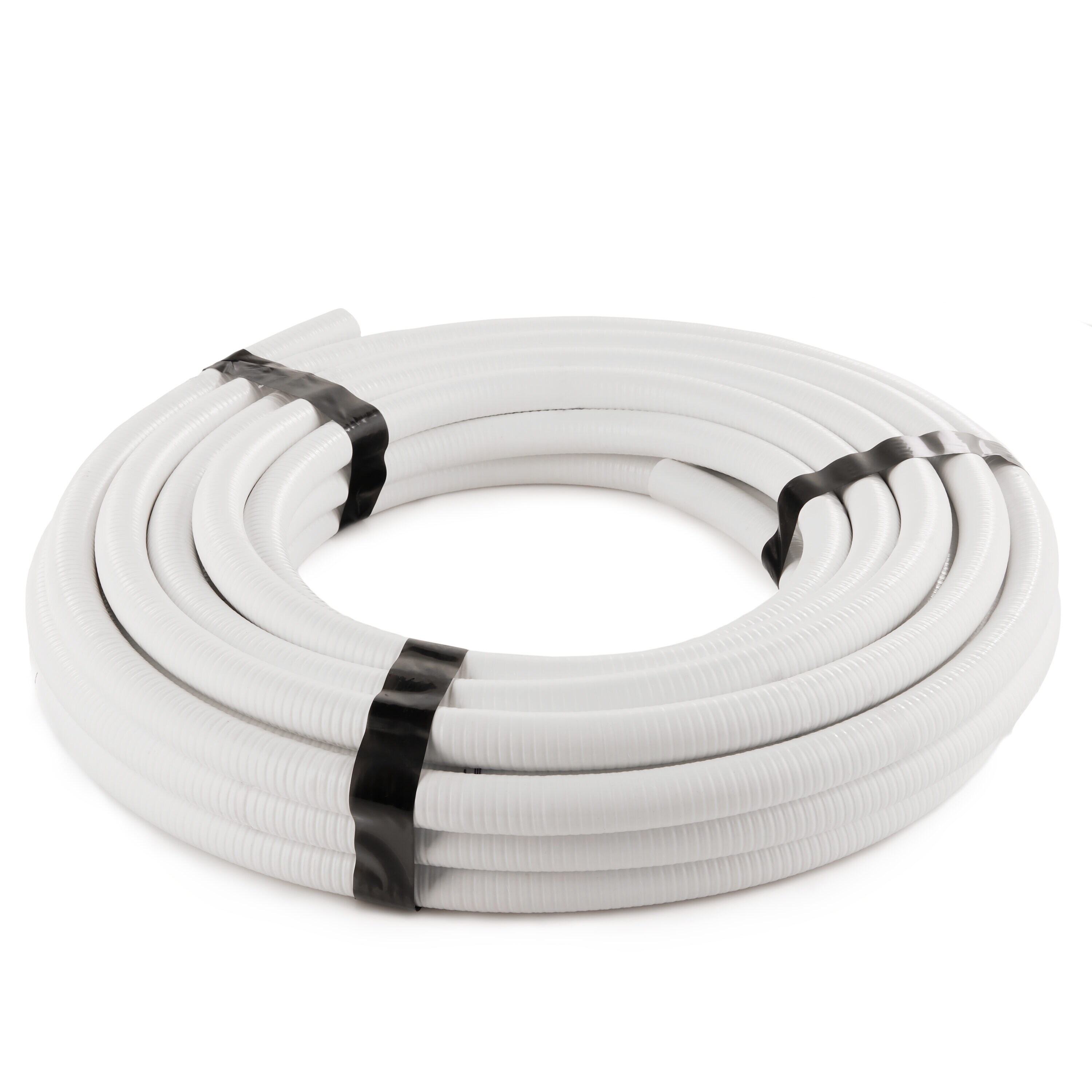 Our white flexible PVC pipe, commonly referred to as flex tubing, spa tubing, flexible PVC, and spa flex is perfect for use with pools and spas, drains, aquariums, irrigation, sprinkler lines and other applications where the utilization of rigid pipe is either not practical or not desirable. Strong and long lasting this hose is extremely flexible, and can easily be routed in any direction necessary without the use of multiple fittings, thus simplifying plumbing layouts and the installation of your job. It can be used in areas where space (for fittings) is limited and or in situations that simply will not accommodate rigid pipe. Our flexible PVC pipe easily conforms to almost any contour, and experiences less heat loss than comparable copper or steel pipe. A rigid internal PVC spiral (helix) resists crushing and impact issues, and this PVC pipe can be used for above-ground or under ground installations (with proper cushioning). It can also be used as a protective liner for softer hoses or tubes, or for smaller diameter hoses or tubing. Our white flexible PVC pipe is easy and economical enough for almost anyone to use. Trimming or cutting is much simpler than with rigid PVC pipe (it can be cut with PVC pipe cutters, a standard hack saw, a carpenters saw, etc.). With a precision controlled outside diameter, it can be easily glued using standard schedule 40 plumbing fittings and any good, commercially available PVC glue (we recommend the gorilla brand cement) for flexible or rigid PVC. It eliminates back pressure caused by sharp turns created by multiple fittings, which increases the efficiency of your system and lowers your overall operating/energy cost.