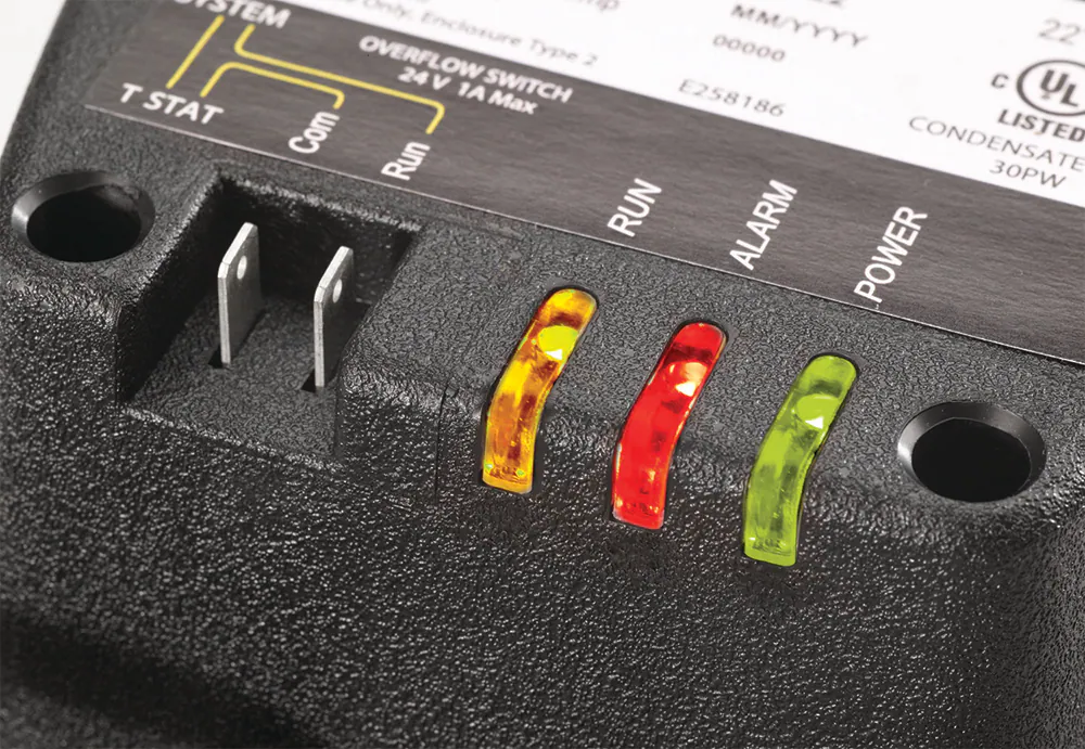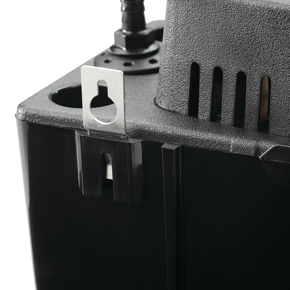 Suitable for use with condensate from air conditioning applications. Features include vibration dampening feet and motor mounts, metal hang tabs, four inlet holes, a clear indicator display, a float switch and check valve.