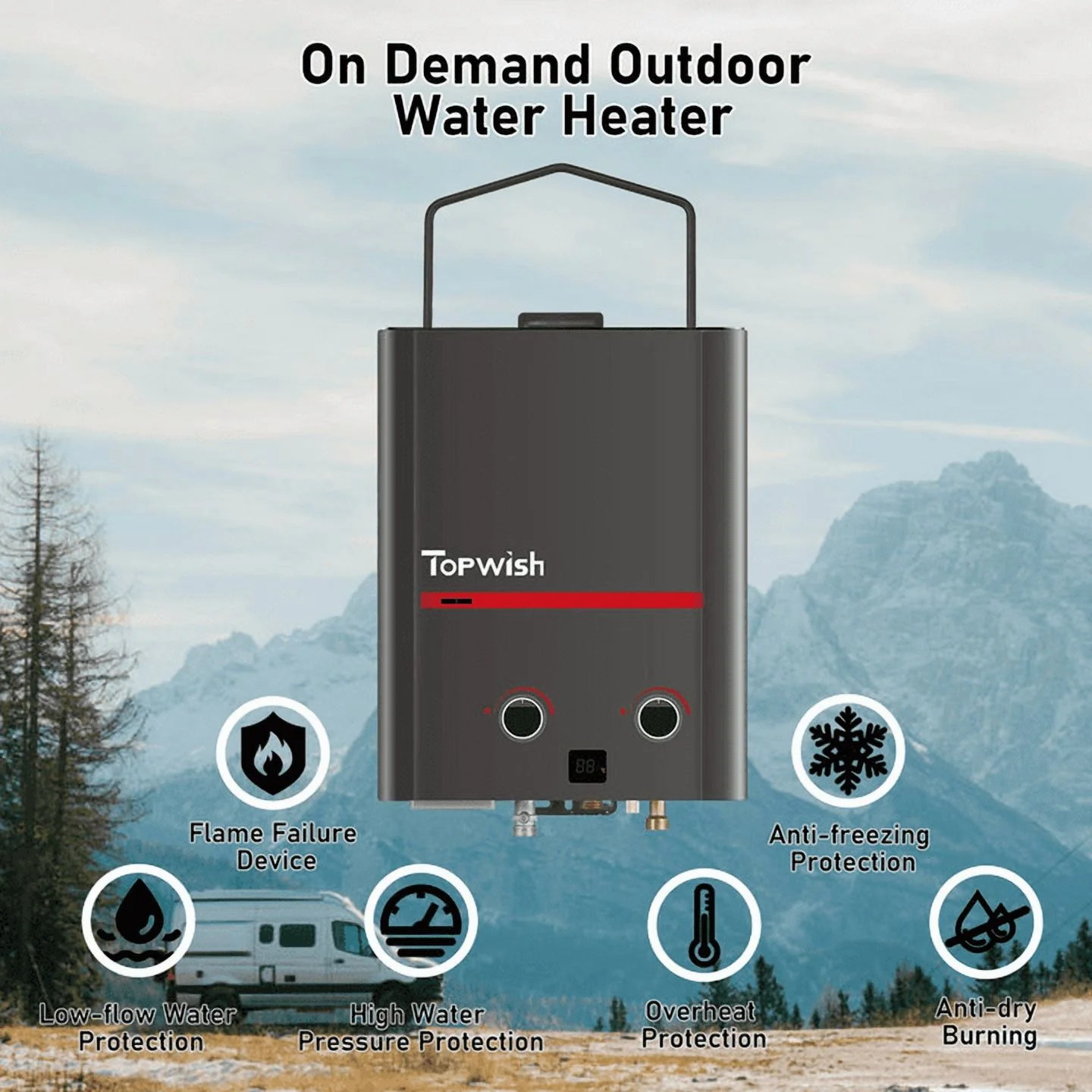 ON-DEMAND HOT WATER FOR OUTDOOR – With a maximum power output of 39,000 BTU/hr, TOPWISH portable water heater provides instant and endless hot water wherever you are. No preheating required; simply turn on the tap, and the water flows at your desired temperature. Low water pressure startup, requiring only 3 PSI to operate, delivering 1.45 GPM with fully adjustable heat and water flow. SAFE TO USE – TOPWISH propane water heater is CSA certified, meeting both Canadian and American safety standards. It is equipped with multiple protection features, including overheating prevention, low water flow, dry combustion, freezing, high water pressure, and flame failure protection. The IPX5 waterproof casing is designed specifically for outdoor use LED DISPLAY & 3-MODE SHOWER HEAD – TOPWISH Water Heater features an LED temperature display and comes with a 3-mode shower head, allowing you to precisely control the water temperature and enjoy a relaxing shower anytime, anywhere PORTABLE HANDLE → WIDE APPLICATION | Design a easy fold up handle, which is easy to hand up or take away, providing a safe and comfortable hot shower at anytime and anywhere. Our gas water heater compact for outdoors, RV shower, camping, pet washing, pool shower, car wash and beach bathing LIGHTWEIGHT AND COMPACT DESIGN – Weighing only 11 lbs, TOPWISH 5L water heater with portable handle is compact and easy to install outdoors. Dimensions: 11.4″ x 4.9″ x 14.8″.