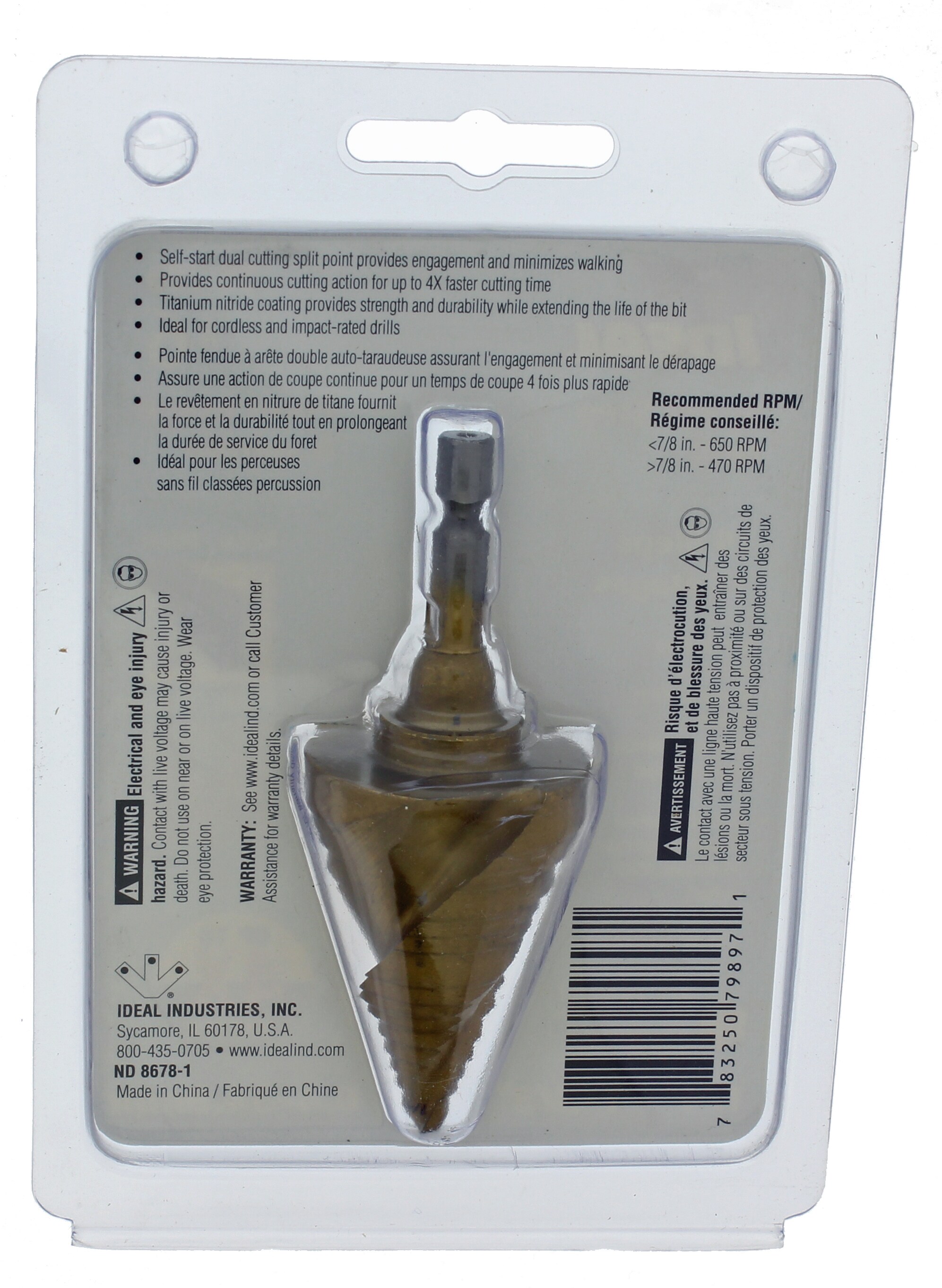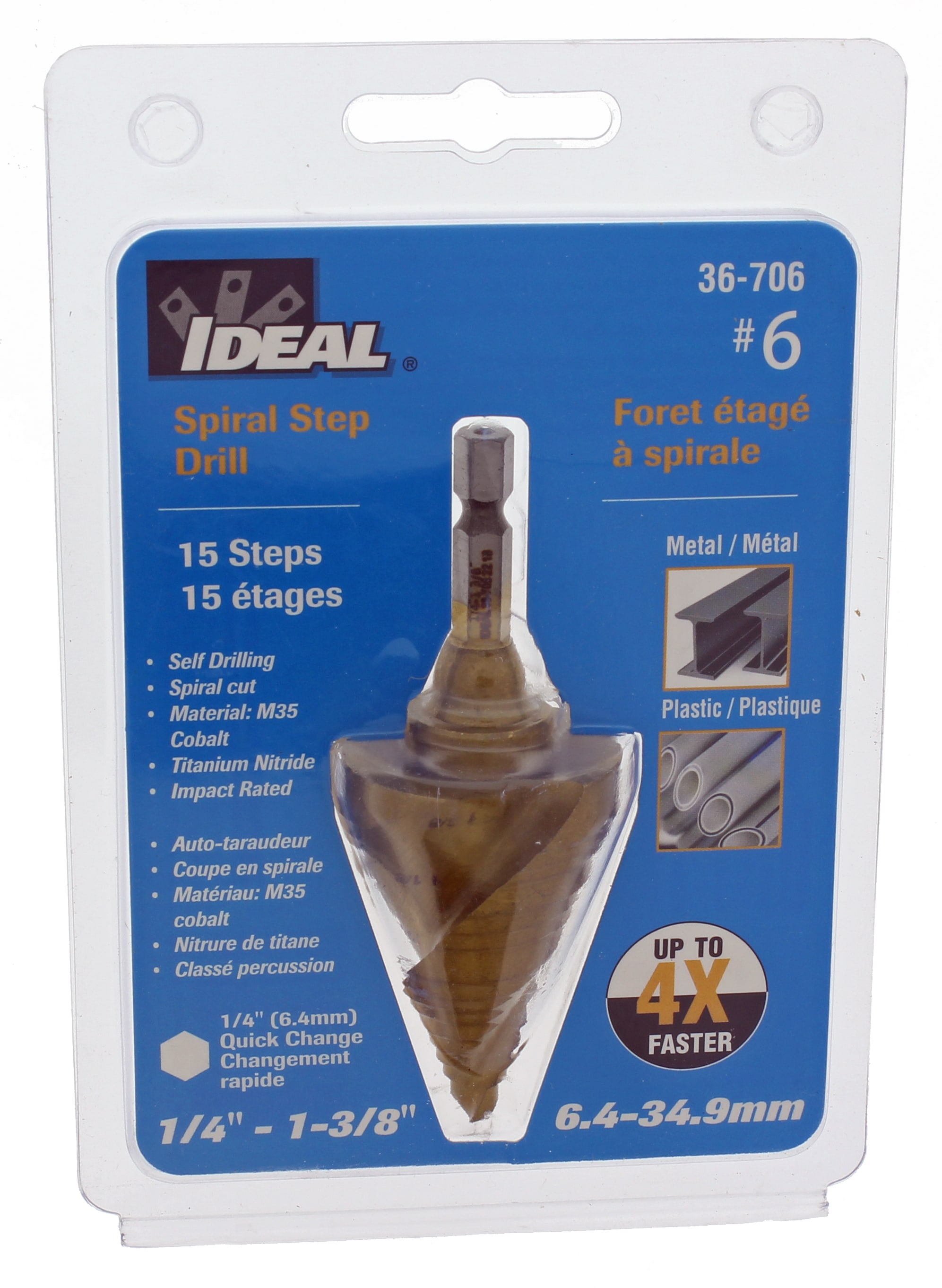 The IDEAL line of spiral step bits enables you to save time with titanium nitride spiral cutting action. Each step has a gradual relief that eases into each cut reducing the need to change drill bits. This provides an economical way to save you valuable time on the project. Manufactured out of M35 high speed steel with cobalt, providing strength and durability, the bit design has balanced hardened edges and 1/4 in. hex shank that makes them compatible not only with cordless drills but also optimized for impact drivers. The split point tip eliminates the need for a starter pilot hole and minimizes walking on the material for quick startup on any project. Titanium nitride coating lowers the cooling time, extending the life for repetitive drilling through the toughest of materials. IDEAL step drill bits feature a spiral cutting action providing faster chip removal, less vibration and faster drilling rate which minimizes binding while drilling.