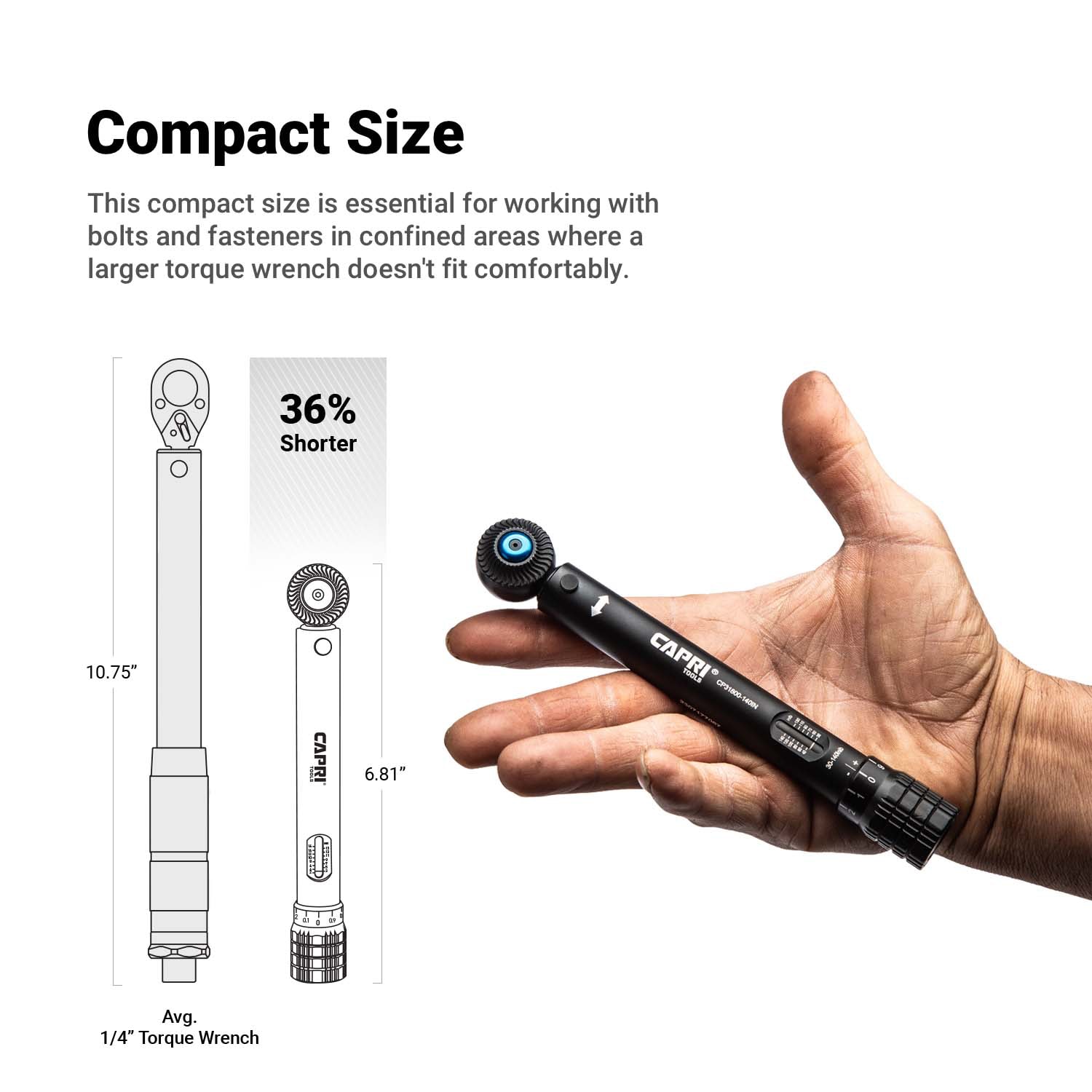 The Capri Tools 1/4 in. Drive Mini Torque Wrench is essential for working with bolts and fasteners in confined areas where larger torque wrench doesn’t fit comfortably. The 30-140 in. lbs. torque range (in 1 in. lb. increments) and +-4% CW/CCW accuracy give you the precision you need in the lower torque range. It has a light and durable matte black anodized aluminum body and weighs just 1.7 lbs. It has a certified +-4% CW/CCW accuracy and a Certificate of Conformance with individualized traceable serial number is included. Set includes (1) hex socket adapter, (1) extension bar, (5) slotted screwdriver bits: 3, 4, 5, 5.5, 6 mm, (4) Phillips screwdriver bits: PH0, PH1, PH2, PH3, (6) hex screwdriver bits: 3, 4, 5, 6, 8, 10 mm, and (4) star screwdriver bits: T10, R15, T25, T30, organized in a premium custom carry case.