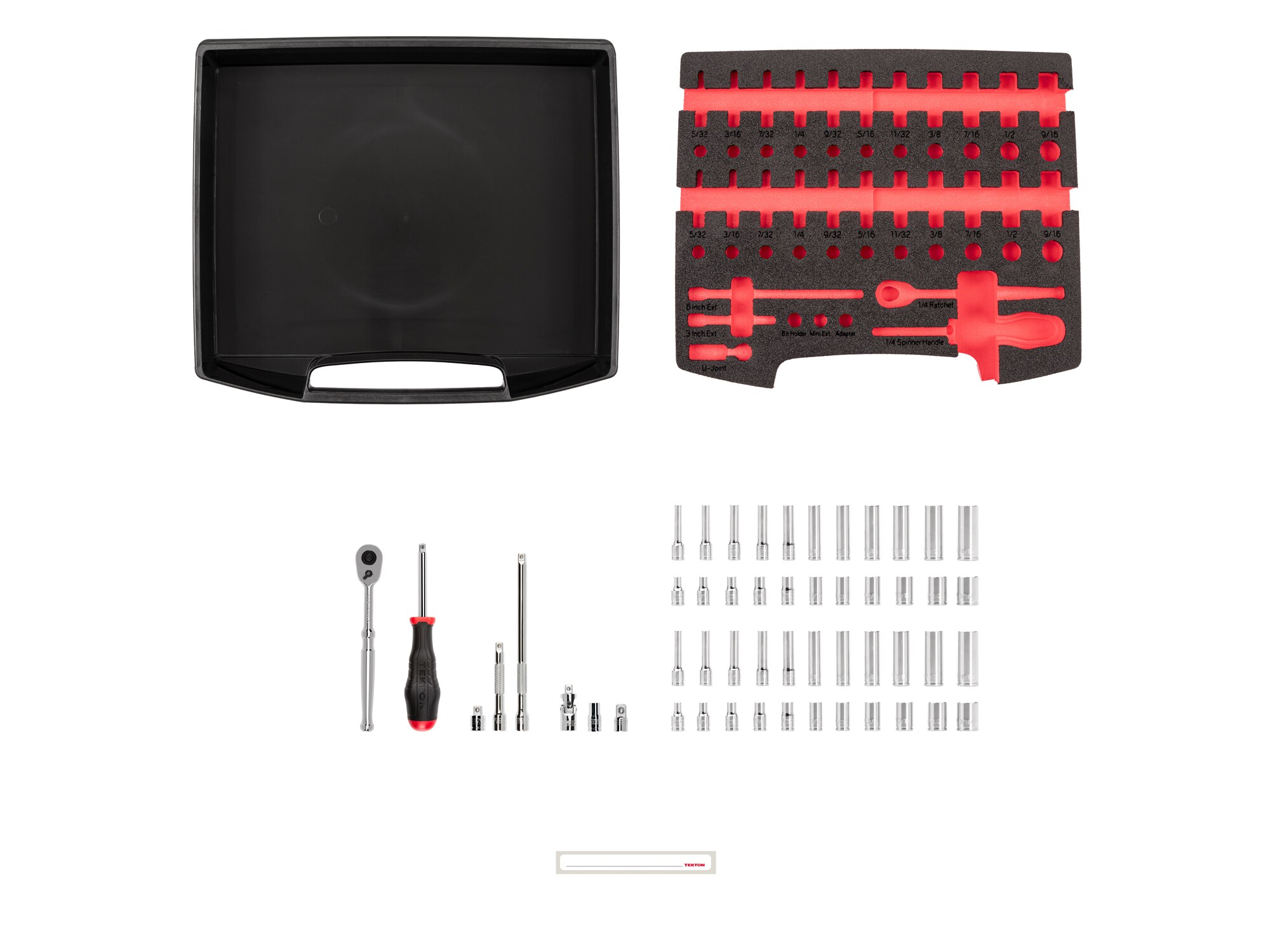 This Tekton socket and ratchet set is part of the L-BOXX® Stacking Organization System and connects with all other components in the L-BOXX family of products, providing virtually infinite options for configuring your own custom organization system. The set includes 1/4 inch drive 6-point and 12-point sockets in standard and deep lengths with a 90-tooth ratchet and other accessories in an open top drawer and a stacking drawer rack. The handles on the side of the stacking drawer rack provide stability when latching components together. Press both side handles in and lift up to remove the drawer rack from the stack. The open top drawer offers quick access to drawer contents without taking apart your organization stack. To remove the drawer from the rack, lift up to pull the drawer out. Included write-on labels allow for easy identification of drawer contents. The laser-marked foam layouts are designed and cut in our Grand Rapids, Michigan manufacturing facility to optimize for high density, easy access, and secure fit. The foam is made of two color-contrasting layers that are permanently bonded together with a heat lamination process, making any missing tools immediately visible.