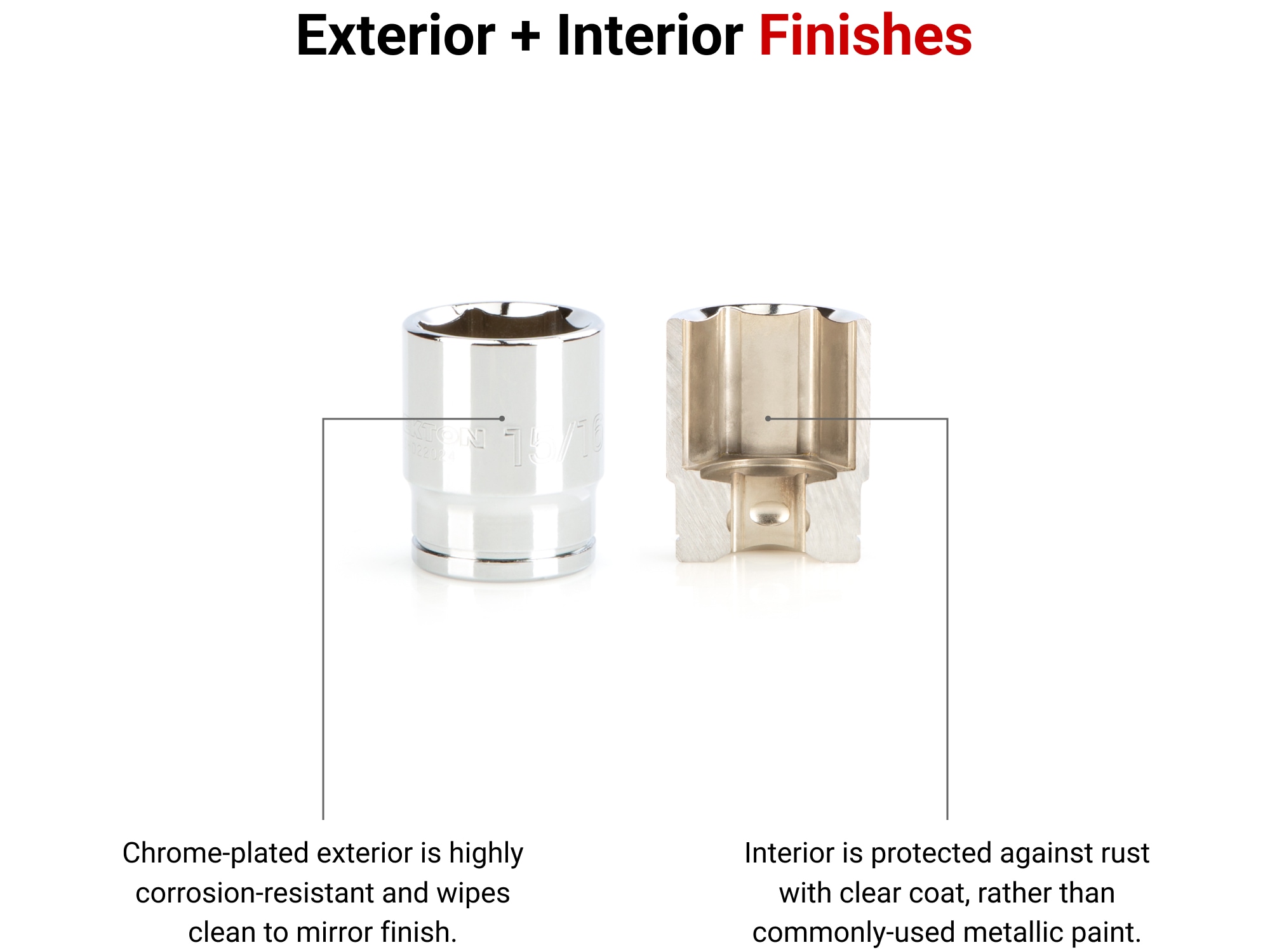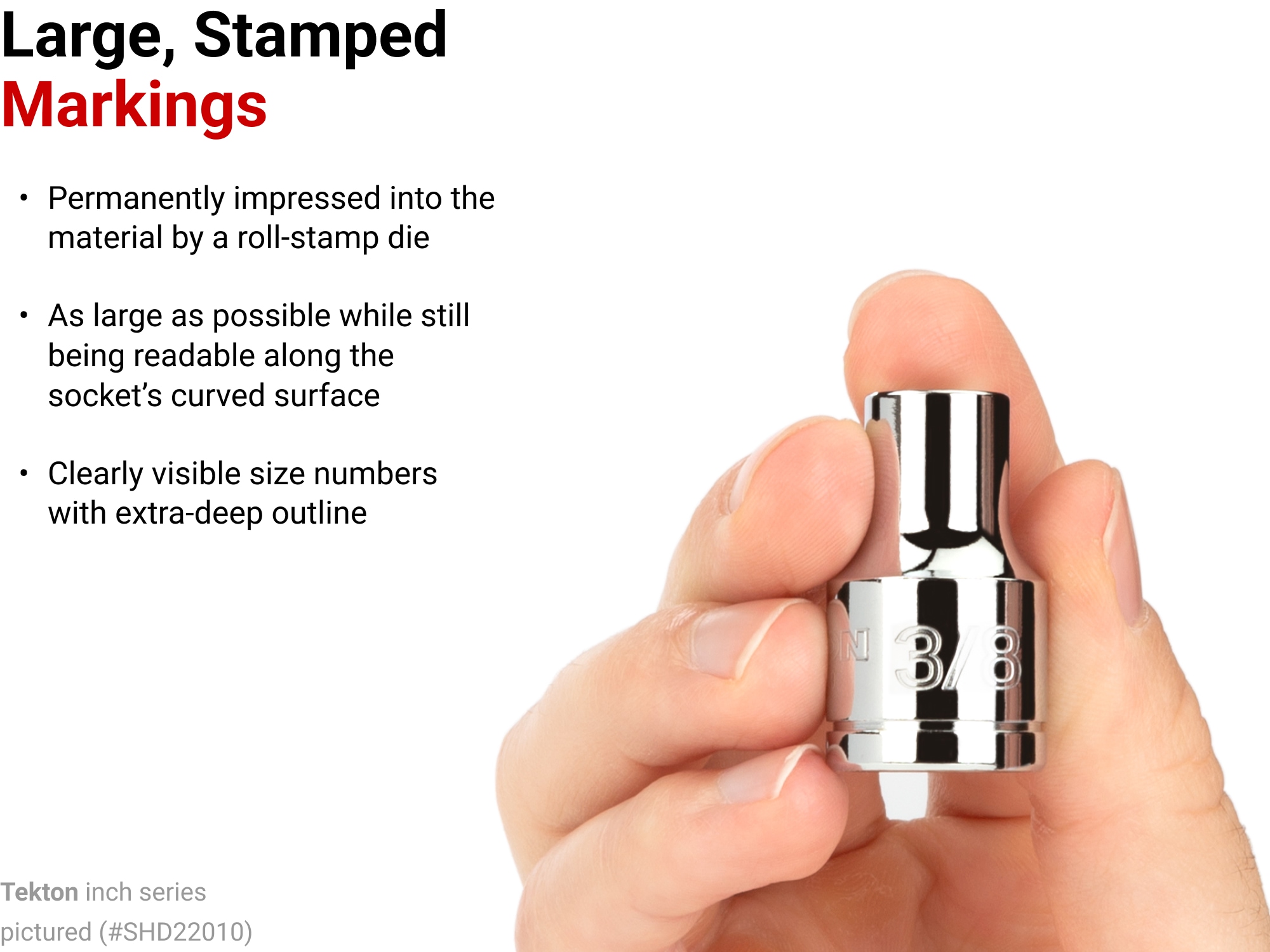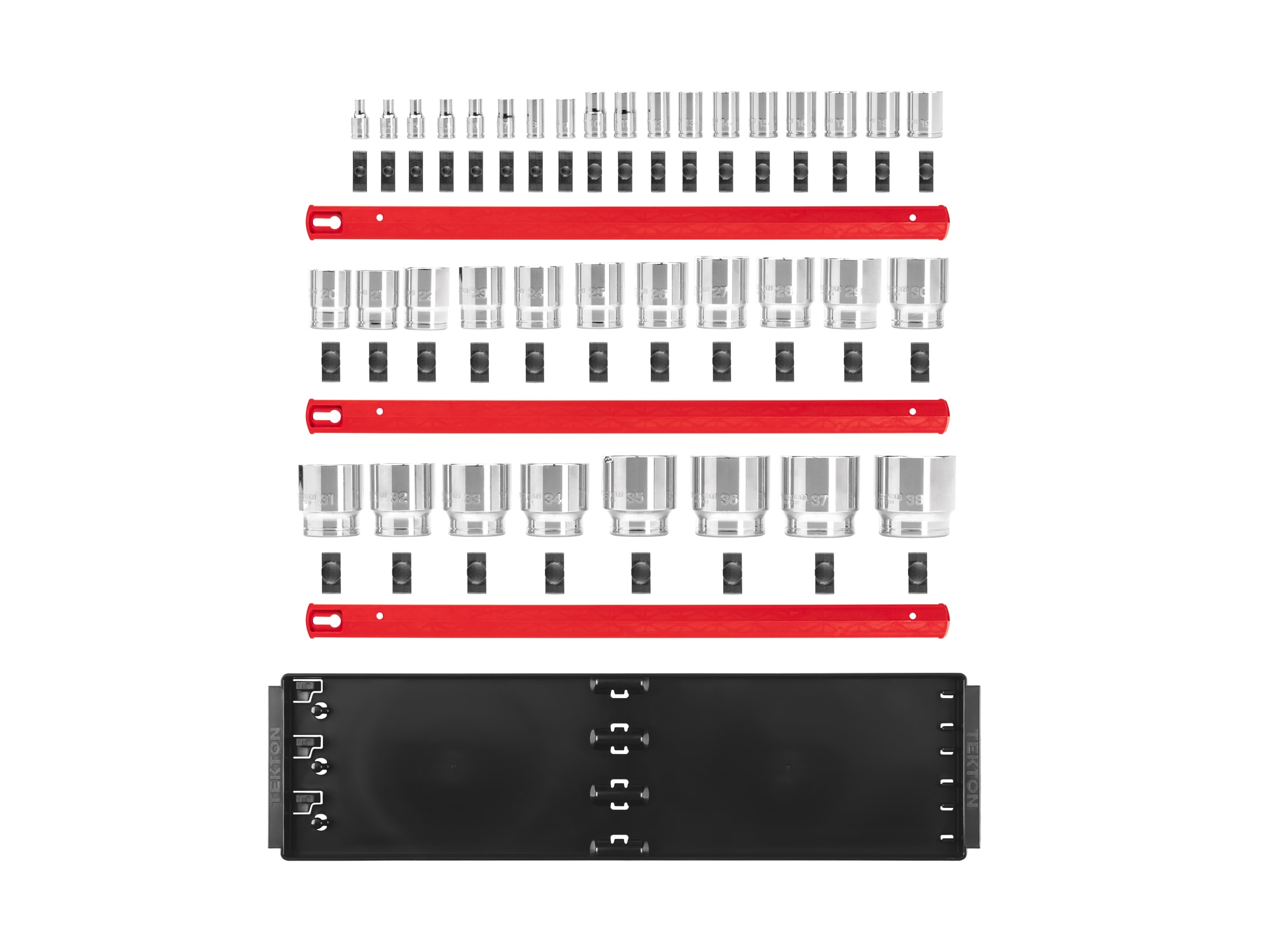 Tekton 6-point sockets have an opening that provides an exact fit and maximum contact for hex fasteners. Each socket is marked with large stamped markings that are permanently impressed into the material by a roll-stamp die and are clearly visible due to their deep outline. Detent grooves and beveled edges provide a smooth and secure connection with the drive tool. Place sockets onto the clips to store them loosely, or twist them clockwise to lock them into place. Detent bumps on the socket clip tabs engage with the sockets to keep them secure, even when on-the-go.