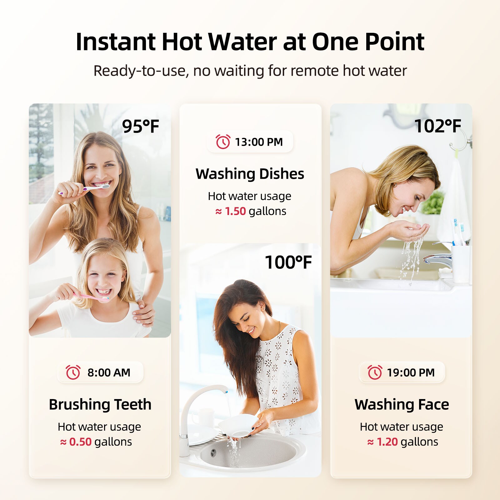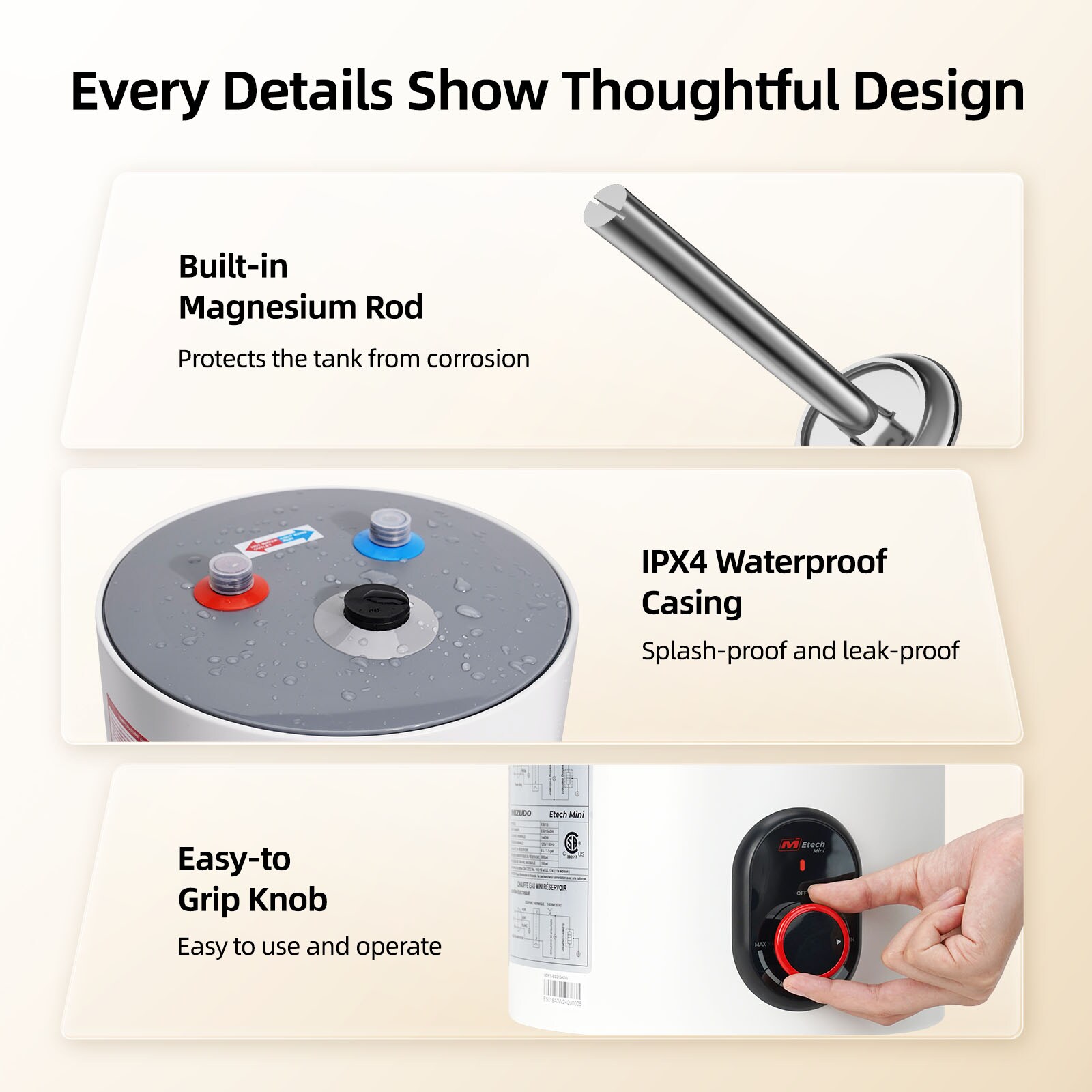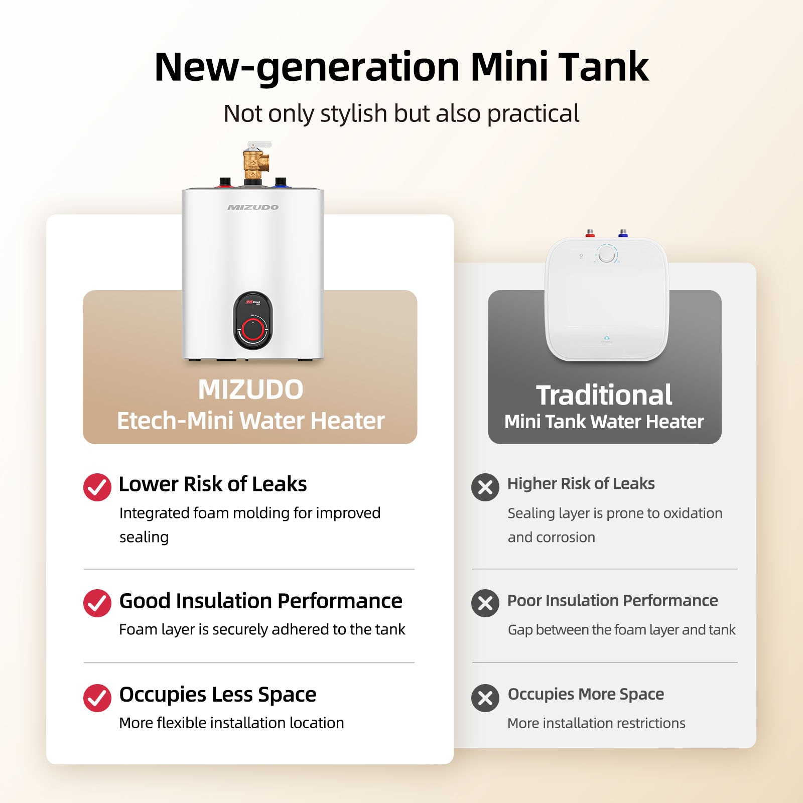 MIZUDO 1.5 Gallon Electric mini-tank water heater is perfect for laundry room, kitchen, bathroom, garage or RVs. When it reaches 190 F, the high temperature limiting device will shut off the heat and provide protection.