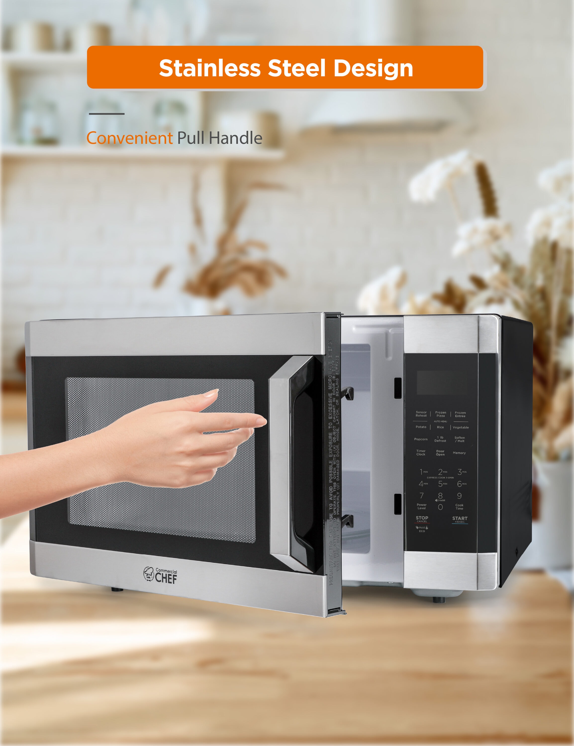 Heat and re-heat your favorite foods and beverages with this COMMERCIAL CHEF microwave oven countertop. With an capacity of 1.6 cubic feet, this 1100 watt countertop microwave oven ensures you can grab and go with delicious meals. Our stainless steel microwave countertop (18.9” × 19.5” × 12.9”) will fit easily on kitchen countertops in homes, apartments, RVs, dorms, and more. Weighing 39.7 lbs., you can transport this portable microwave so heated food and drink is within reach