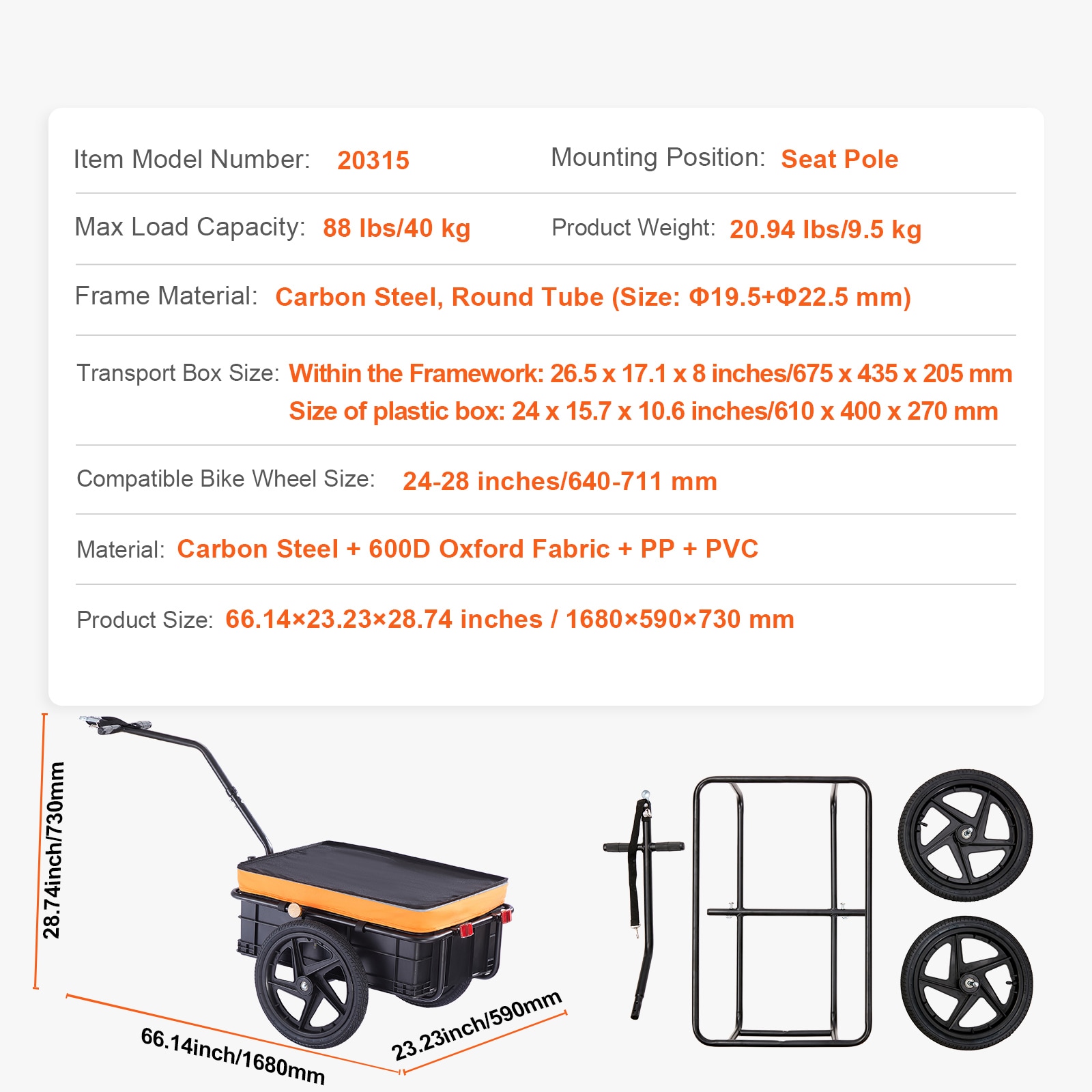 Carry More, Ride Farther with VEVOR Bike Cargo Trailer: Packed with strength, space, and durability, this bicycle trailer is your ticket to hassle-free adventures; Stay safe, stay stylish, and stay ready for anything, whether you’re hitting the trails or cruising the city streets; Let’s make every ride a blast!; [Package Content] 1 x Bike Cargo Trailer