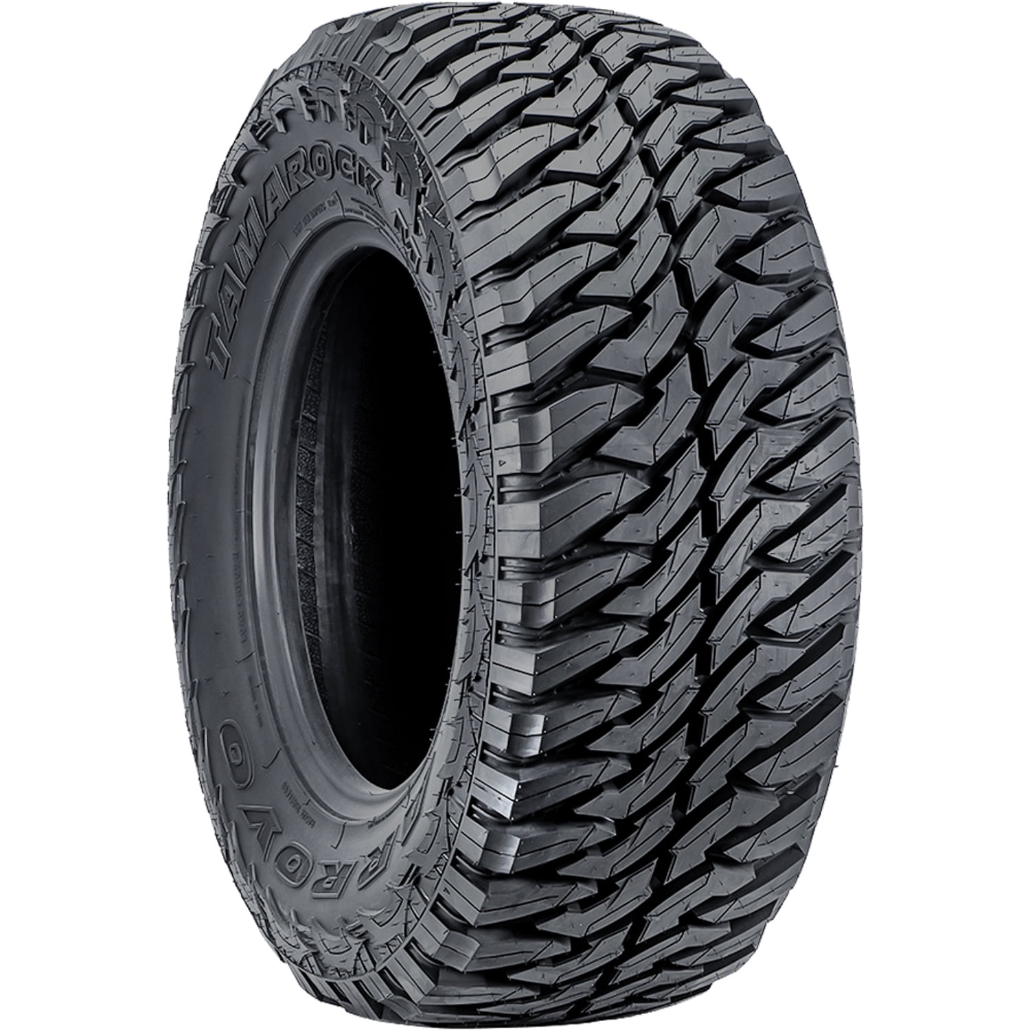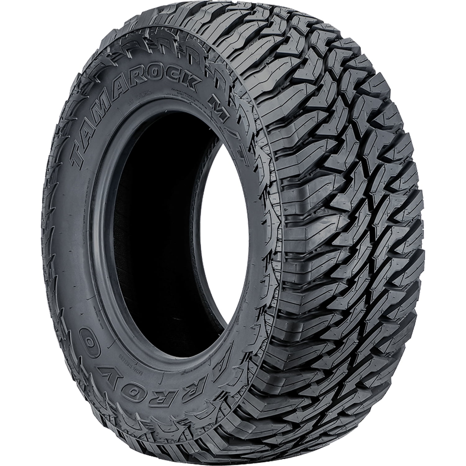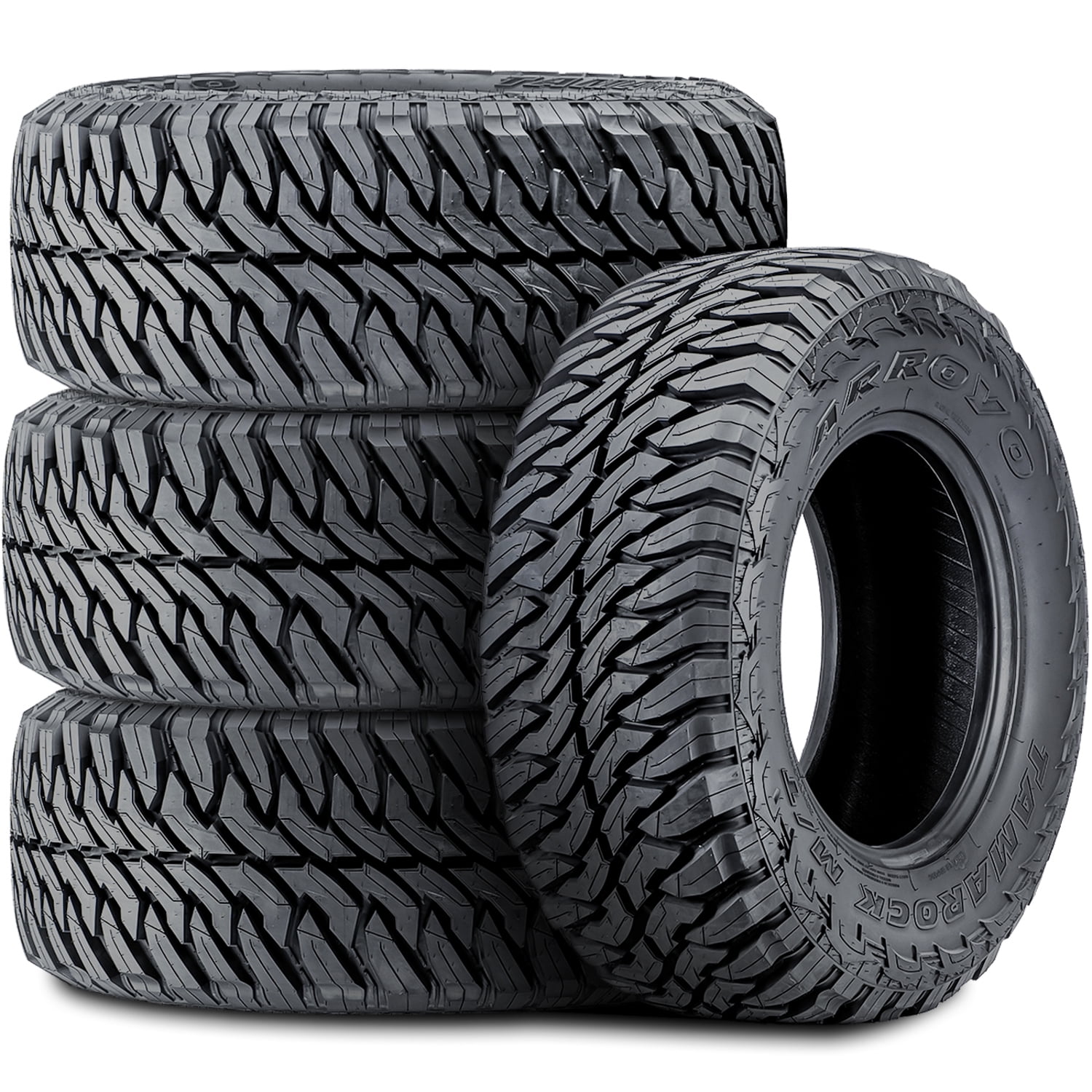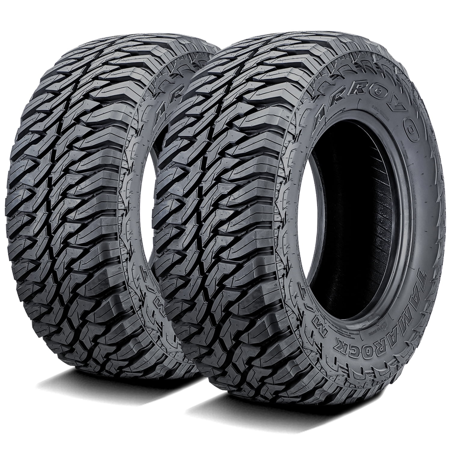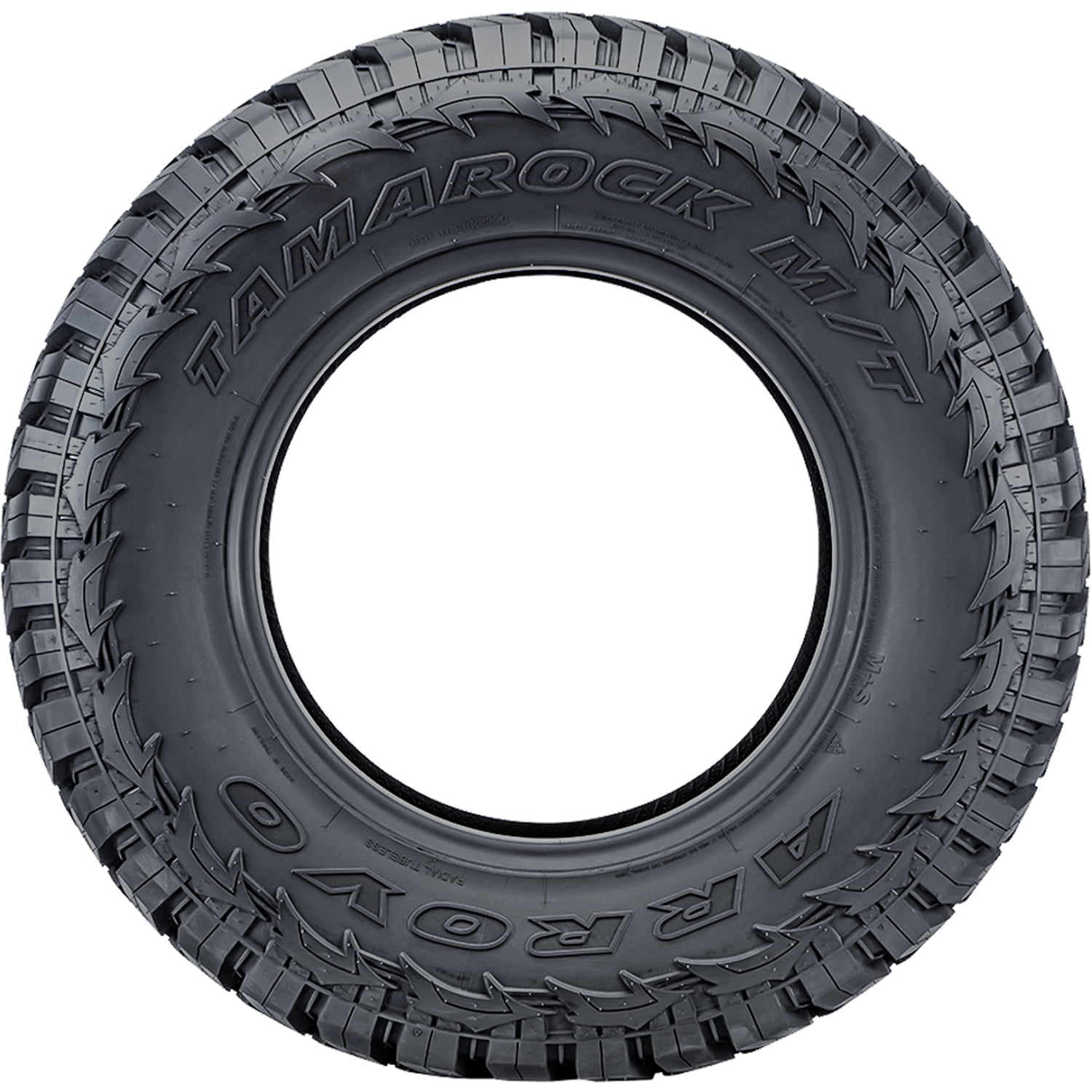 Arroyo Tamarock M/T FEATURES AND BENEFITS Mud terrain traction Enhanced controllability All season traction Better damage resistance OVERVIEW The Arroyo Tamarock M/T is a mud terrain, all season tire manufactured for light trucks and SUVs. Arroyo offers a 40,000 mile treadwear warranty with this tire model. Excellent mud terrain traction is guaranteed thanks to the aggressive footprint. The tread’s staggered block pattern and optimal void ratio greatly enhance the soft, loose and uneven terrain grip, ensuring the tire’s forward motion at all times. Better off-road traction improves the tire’s performance through deep mud and on loose dirt. The self-cleaning tread design allows the tire to disperse mud and snow from the footprint. In this manner, they cannot pack between the tread elements and block the tire’s surface contact. This results in the tire’s overall off-road terrain performing safety. The flat footprint ensures the tire’s constant surface contact, which increases the controllability. The tread allows the tire to enhance the steering responsiveness and the driving stability. As a result, the tire upgrades the steering response time and accuracy to the driver’s commands, while the structure is secured against the driving pressure during the performance. The tire also features a reinforced internal structure, which significantly boosts the tire’s load capacity. Since the construction does not deform, the tire is able to securely increase the load carrying and withstanding power. This guarantees the tire’s overall load capacity. This model provides a secure all weather traction. The aggressive tread design with the optimal siping placement and the silica compound enhance the dry, wet and winter weather grip. The silica elements of the compound keep the rubber flexibility while the tires are in motion, while the tread design optimizes the surface grip. This combination guarantees the tire’s exceptional year round performing ability. The Tamarock M/T guards its tread area and casing from damage. This is achieved with the tread design, the stronger structure, and the tread’s self-cleaning nature. The stabilized tread elements with the rigid center elements avoid tread damage, such as the tread’s chipping, cracking, and tearing. The reinforced construction protects the casing from punctures, cuts, and impact damage. The tread’s self-cleaning ability eliminates rocks stuck between the tread elements, effectively preventing stone retention from shortening the service life. Manufacturers recommend changing tires every 10 years. As long as tires are properly stored before they are sold, the year of their manufacture will not shorten their service life.