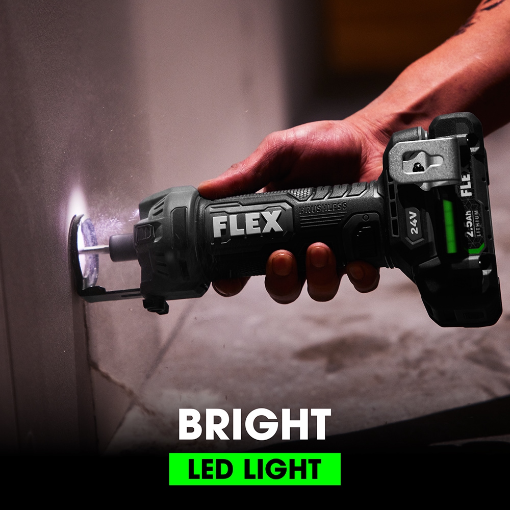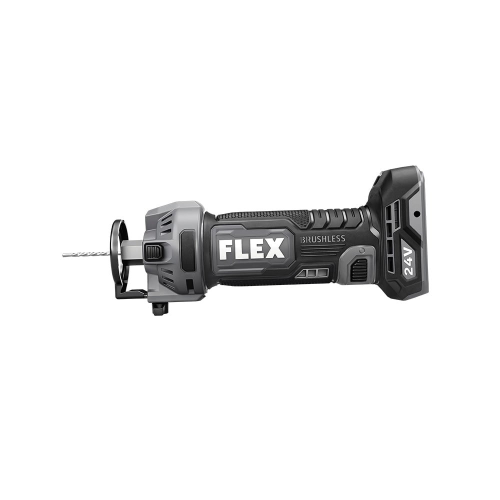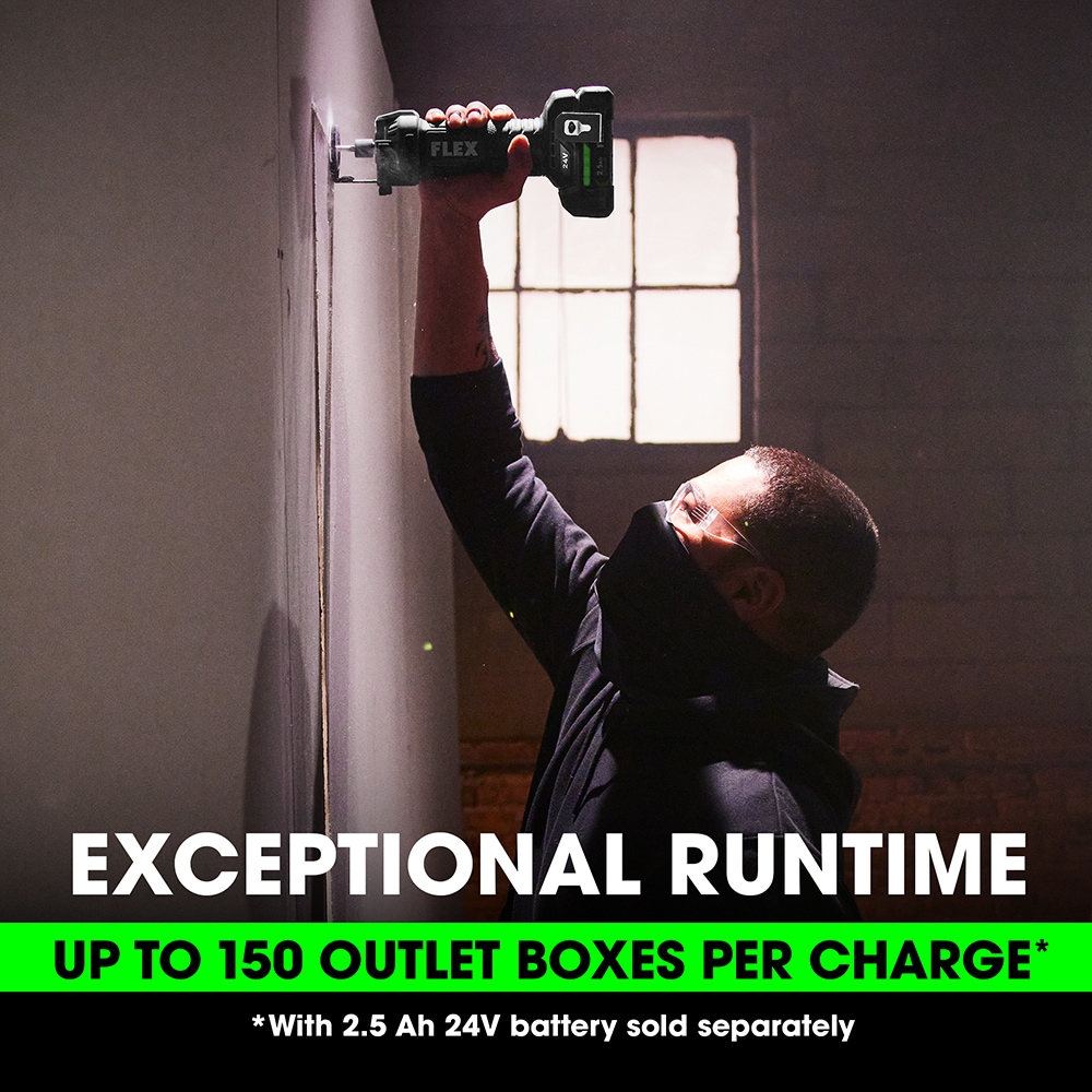 The FLEX 24V Drywall Cut Out Tool powers through the entire day with its exceptional runtime—up to 150 outlet boxes per charge. Adjustable airflow directs the dust away from the work in the direction desired. Built-in LED lighting illuminates in dark conditions. This cut out tool also delivers the FLEX Advantage of unmatched FLEX 24V battery power, runtime, and faster charging (battery and charger sold separately). Protected by the FLEX Limited Lifetime Warranty when registered within 30 days of purchase at registermyFLEX.com through December 31, 2025.