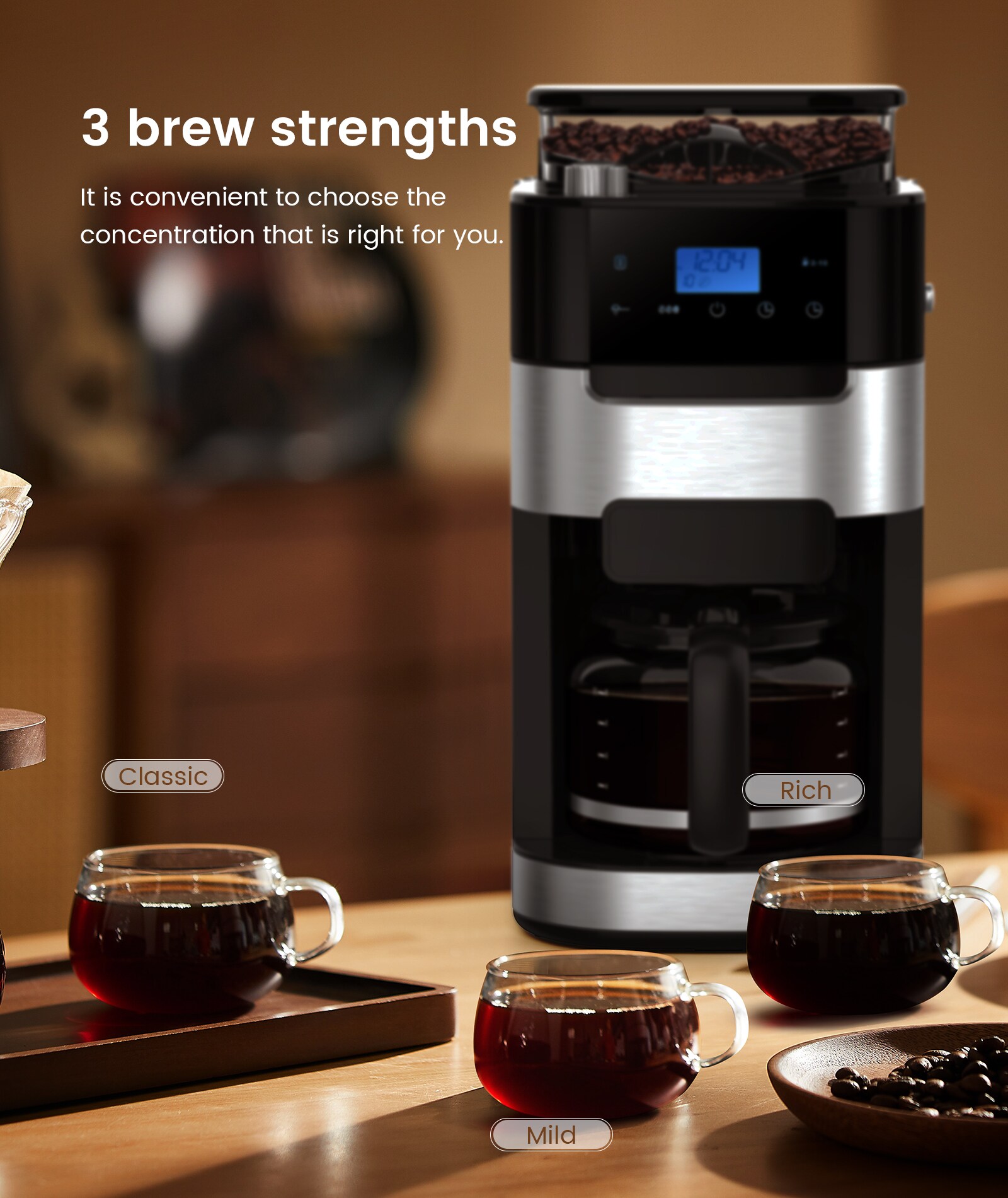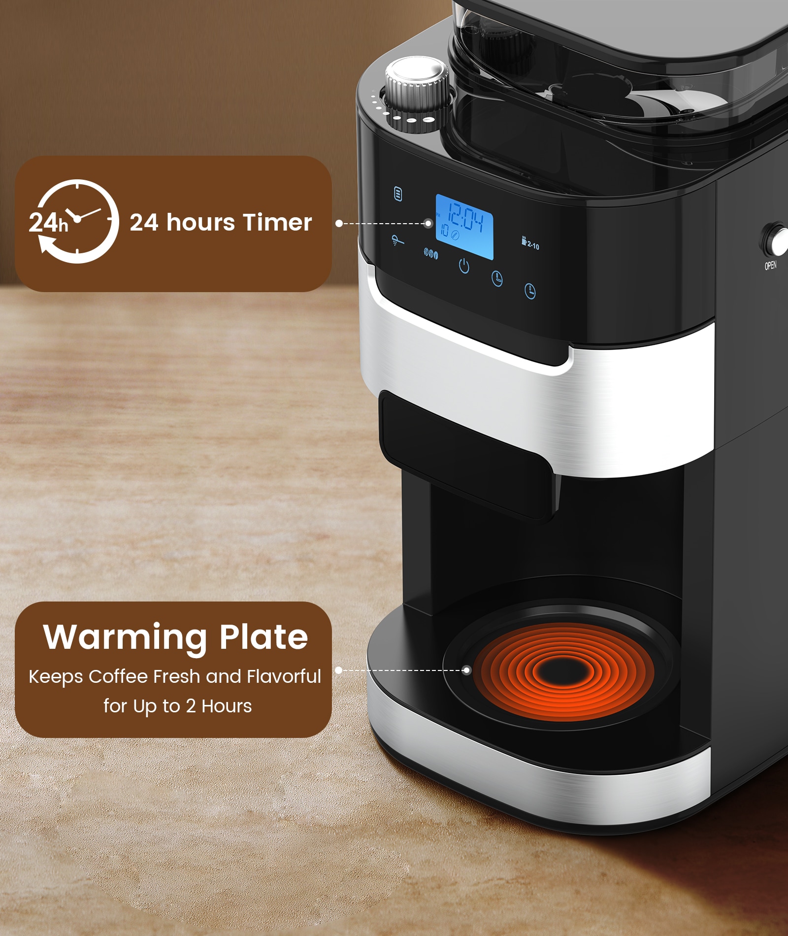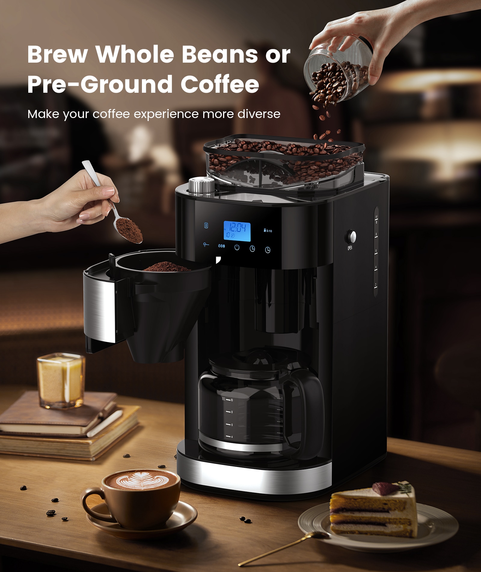 The All-in-One Grind & Brew Coffee Maker delivers barista-quality coffee at home. Featuring a built-in grinder with 8 grind settings and 3 brew strengths, it lets you customize every cup. Enjoy freshly ground beans or use pre-ground coffee for convenience. With a 10-cup glass carafe, 24-hour programmable timer, and 2-hour auto keep-warm, it’s perfect for homes or offices. The 50.7oz transparent water tank ensures easy refills, while the drip-free design keeps your counter clean. Ideal for coffee enthusiasts who crave customization without the hassle!