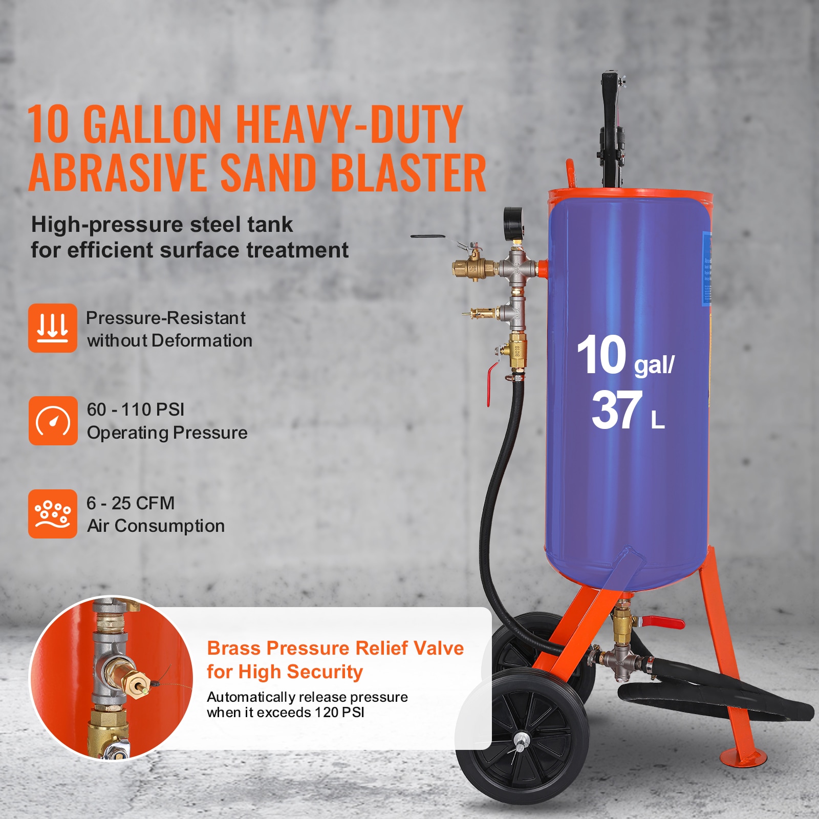 VEVOR 10 Gallon Heavy-Duty Sand Blaster: Choose VEVOR 10-gallon heavy-duty sandblaster and experience a simpler, more efficient, and precise surface treatment; It enables high-pressure surface treatment, effortlessly removing rust, paint, stain and polishing large areas, also performing perfect sandblasting for curved surfaces and gaps;; [Package Content] 2 x Ceramic Nozzles (1/8″ (Pre-installed), 3/32″); 1 x Sandblasting Face Mask (FF-Q914); 3 x Rubber Pads; 5 x Washers ( Ø24 x 1.2 ); 5 x Small R-type Pin; 1 x User Manual