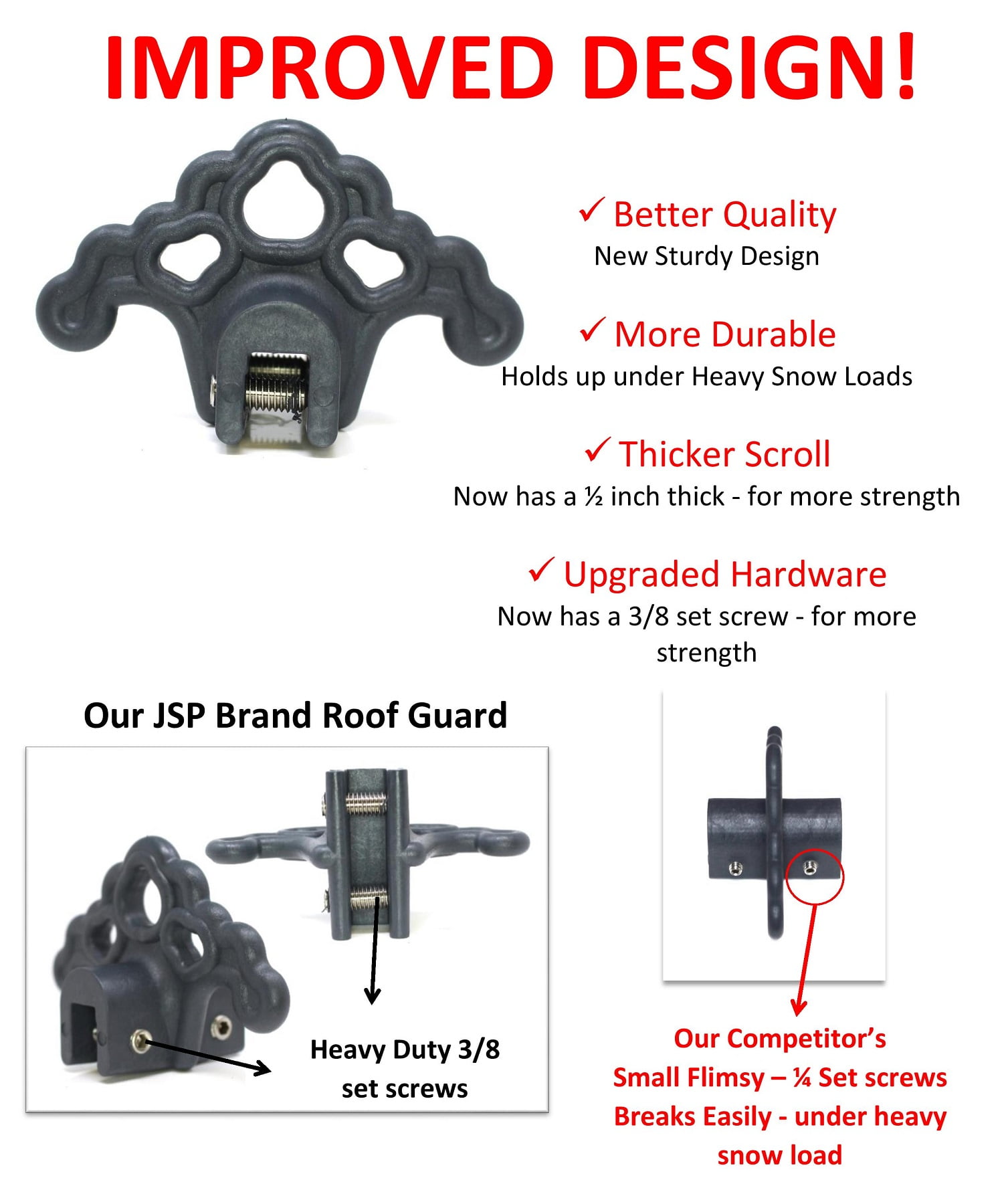 JSP Manufacturing®® Grey Standing Seam Roof Snow and Ice Guards – 10 Pack Our JSP Brand Standing Seam Roof Snow and Ice guards have a New & Improved design. Our new design are Stronger and more durable, these heavy duty guards are designed to last! They are designed to keep snow and ice off standing seam metal roofs. Featuring upgraded hardware, that will hold up better under the pressure of snow and ice. These strong and durable guards will protect your property and people from injury and liability claims from injury. Prevent Sliding Snow Ice Buildup. Grey Standing Seam Roof Snow and Ice Guards Prevents sliding snow and ice buildup Protect your property and people from damage and injury For use on standing seam metal roofs New Improved Design / Upgraded Hardware Attaches with the (2) New upgraded 3/8 stainless steel set screws provided Easy Installation – uses 3/16″ allen wrench No drilling required Improved Design is Stronger and more durable, designed to last. Made in USA Brand: JSP Manufacturing® MPN: RFGD-SS-GREY-10-Pack Style: Standing Seam Roof Guards Colors Available: Grey Quantity: 10 Pack Material: Glass Filled Polymer Manufacturer: JSP Measures Approximately: Width: 5-1/4 inches Length: 2-1/2 inches Height: 3-1/2 inches Slot Width: 9/16 inch Slot Height: 15/16 inch WE HAVE ANY QUANTITY YOU NEED, SO PLEASE LET US KNOW. Bulk order discounts are available, please contact us for pricing for bulk orders. *Please Note: Photo colors may vary slightly from the actual product due to lighting and monitor settings.