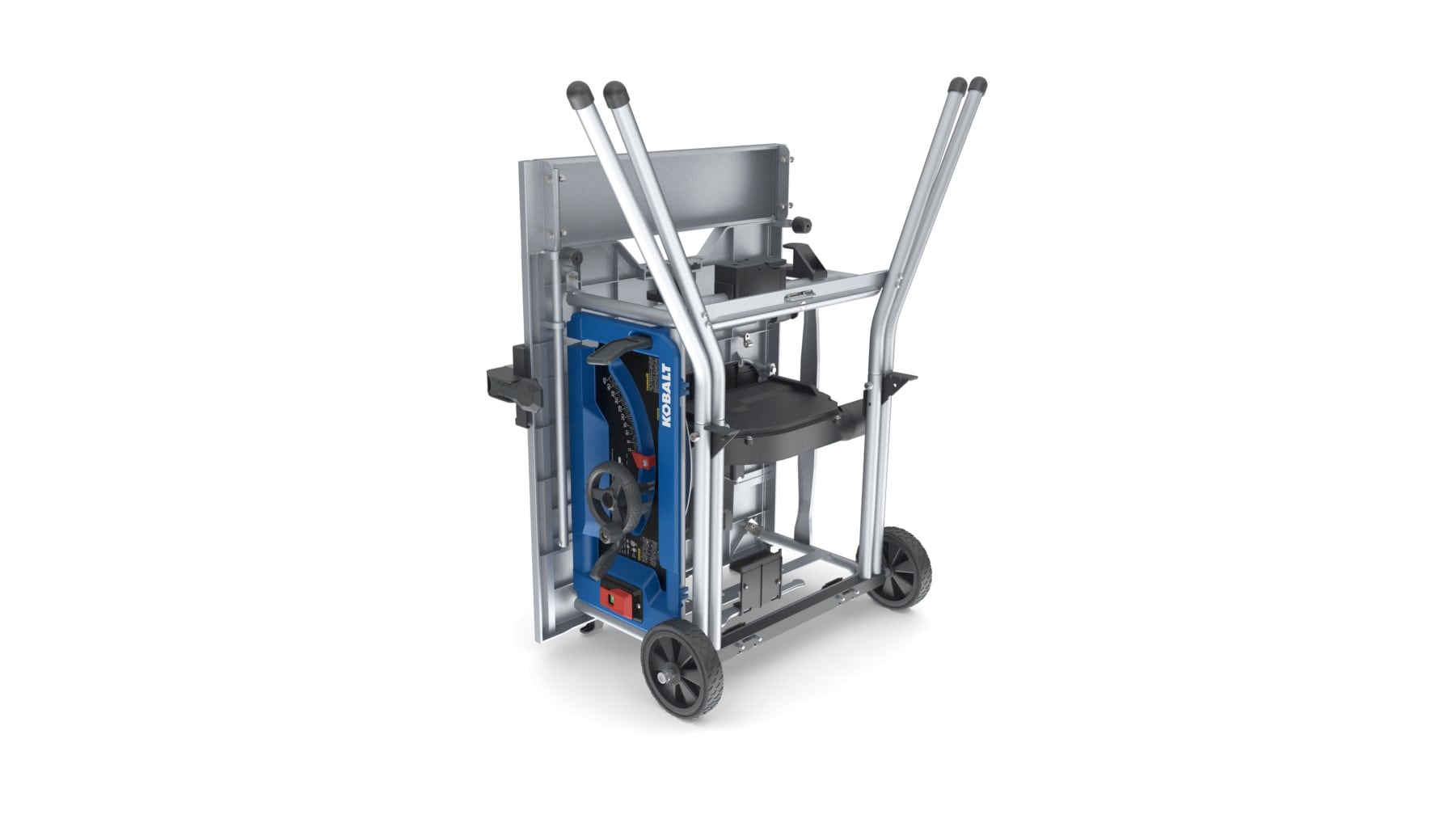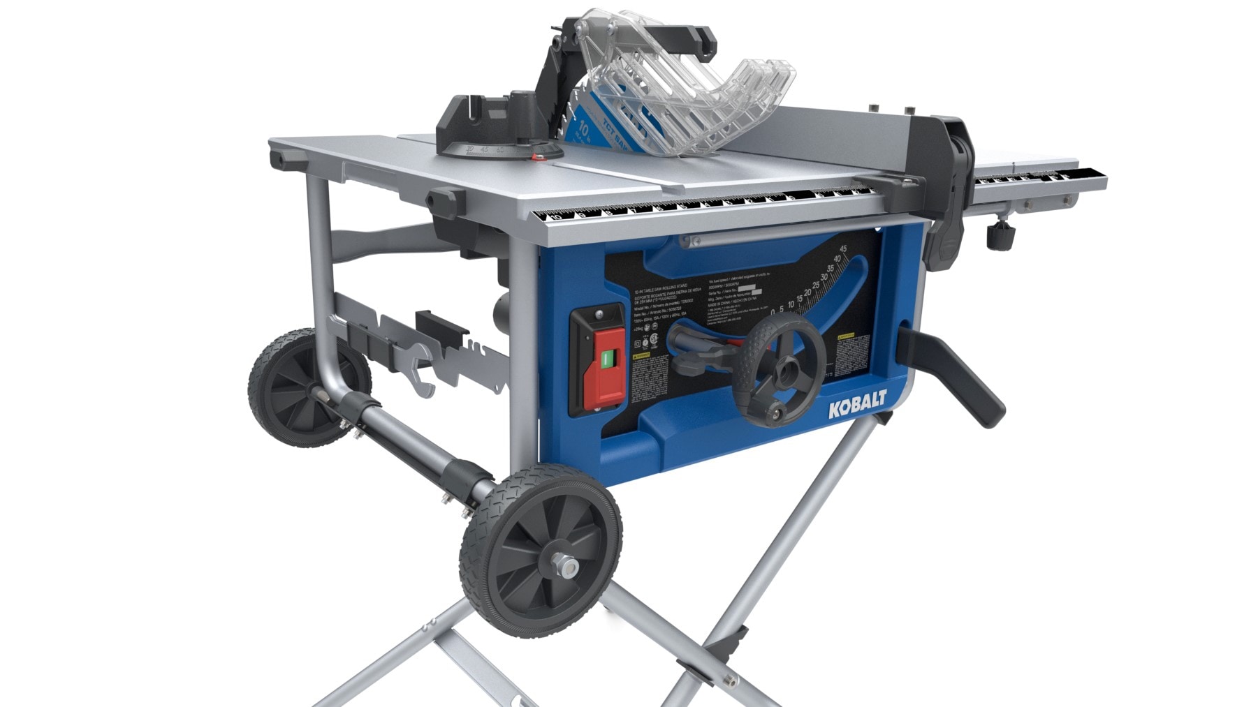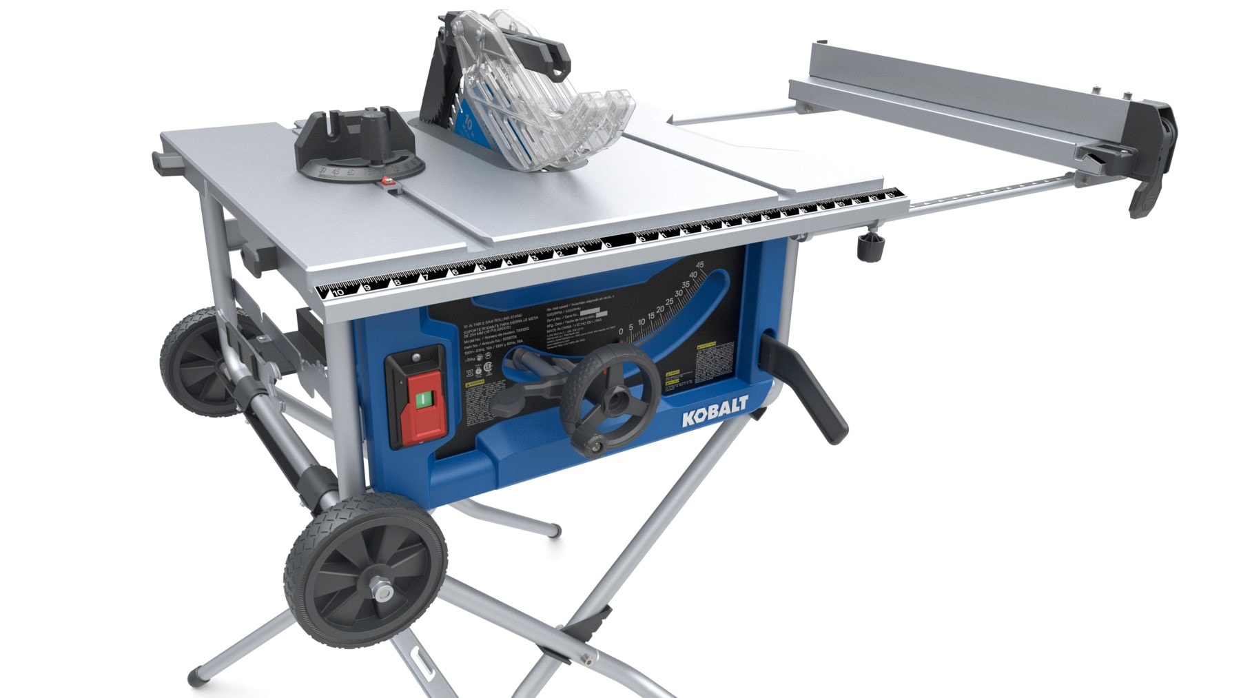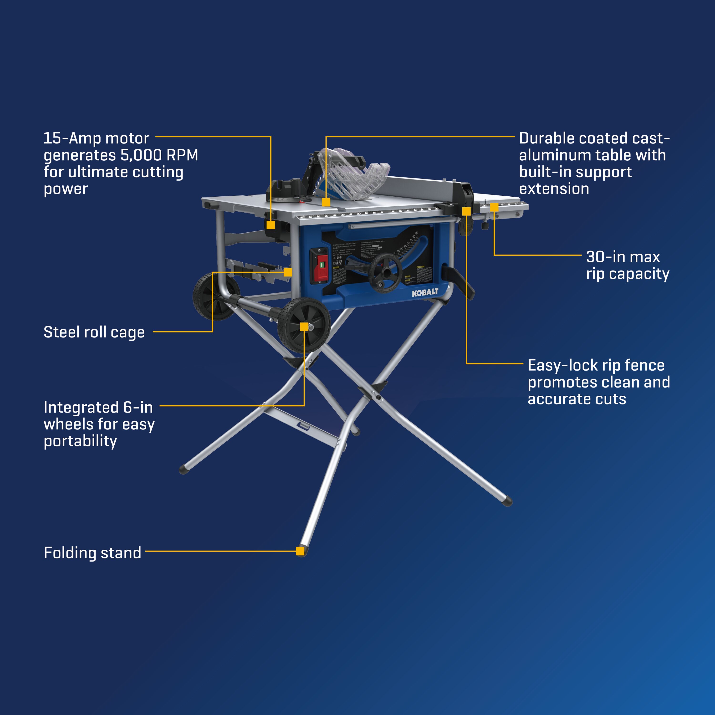 Kobalt 10″ table saw with folding stand has a powerful 15-amp motor that generates 5,000-RPM for precise cuts of jobsite and workshop task. The steel roll cage design is for added durability and strength. The saw has integrated 6 inch wheels for ease of transportation and storage along with a folding stand. The cast-aluminum table provides 30 inches right and 10 inches left rip capacity. The max cutting depth is 3 -1/8 inches at 90 degrees and 2- 1/4 inches at 45 degrees.