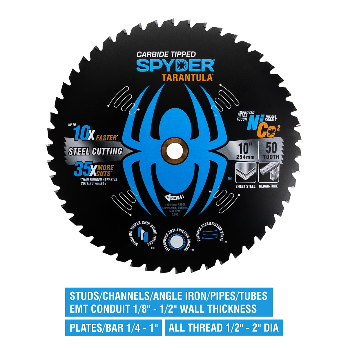 Spyder Tarantula™ metal-cutting circular saw blades are the ideal choice for clean cutting steel and other metal profiles. This high-performance blade lasts up to 35x longer than standard bonded abrasive cutting wheels and makes those cuts up to 10x faster. Ultra tough NiCo2 carbide cutting teeth, made with upgraded nickel cobalt, feature a modified triple chip grind for unsurpassed cutting speed, life, and cleanliness – expelling larger chips with less cutting heat, dust, and debris. An interfused anti-friction coating prevents blade binding and polymer-filled stabilization vents reduce noise and vibration for ultra-precise burr-free cuts. Tarantula™ metal-cutting saw blades are compatible with cordless and corded circular saws and can be used to cut steel and metal profiles of various thicknesses. Ideal for steel bar, sheet, extrusions, studs, channel, angle iron, conduit, pipe, rebar, rods and more.