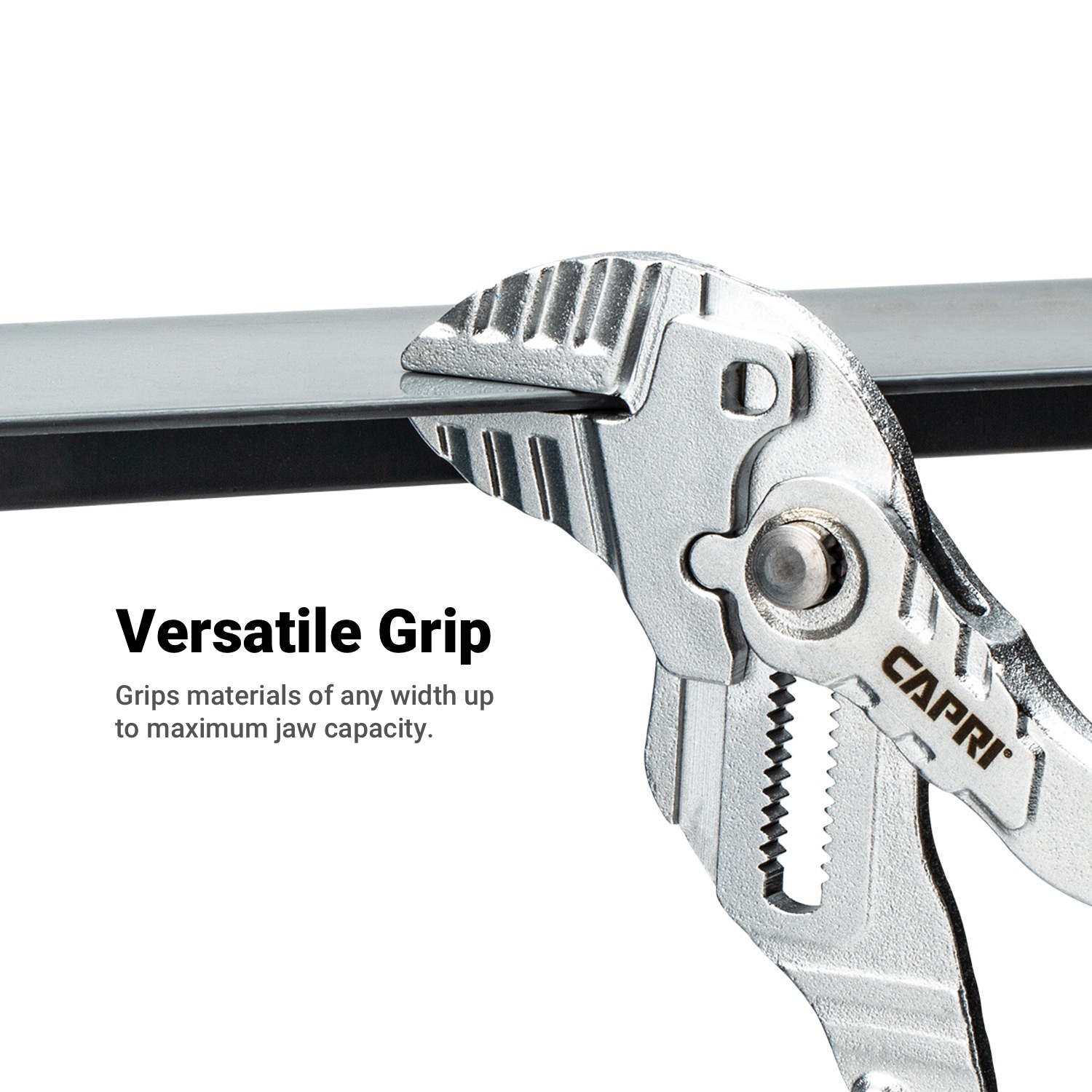 The Capri Tools Pliers Wrench combines powerful gripping action with an adjustable jaw, letting you work on any fasteners and work pieces up to the pliers wrench’s jaw capacity. The adjustable jaw also self-adjusts while you work, letting you ratchet around the fasteners and turn the fasteners continuously without needing to remove and readjust the tool after each turn. The perfectly parallel smooth jaws provide a secure and non-marring grip. It is made with premium Chrome Vanadium steel and features and ergonomic soft grip non-slip handles. Set comes with a 7 in. pliers wrench with 1-7/16 in. jaw capacity, and a 10 in. pliers wrench with 2 in. jaw capacity. Set completes with our own Mechanic’s Tray which fits comfortably in most tool chests and cabinets.