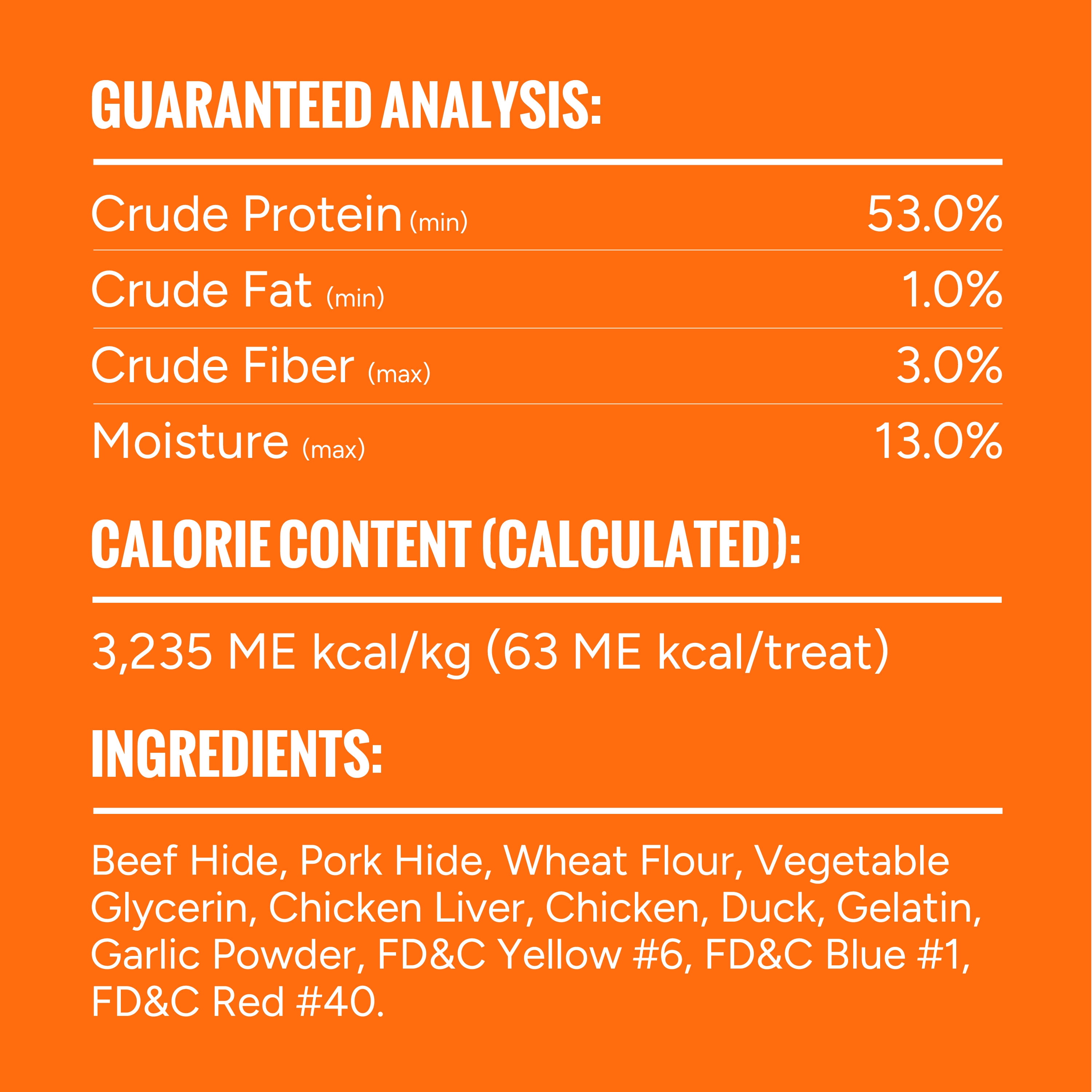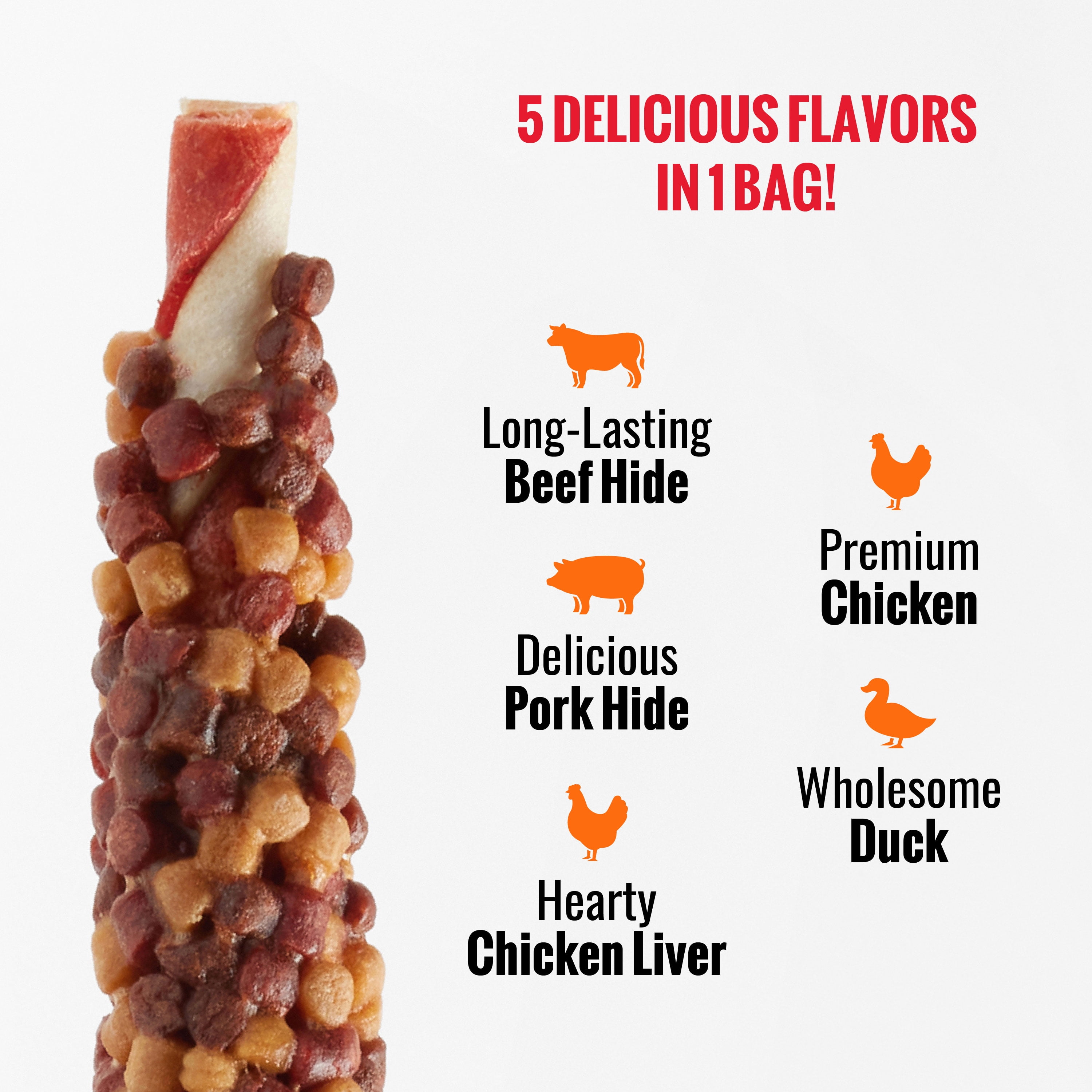 DELICIOUS RAWHIDE CHEW: Made with long-lasting beef hide and delicious pork hide. TASTY FLAVORS: Made with hearty chicken liver, premium chicken and wholesome duck. GREAT SOURCE OF PROTEIN: Wrapped with premium cuts of real chicken. SATISFIES YOUR DOG’S NATURAL URGE TO CHEW: The natural chewing action helps reduce tartar buildup and remove plaque. SNACK FOR ALL DOGS: Your dog is sure to love this truly delightful, long-lasting treat.