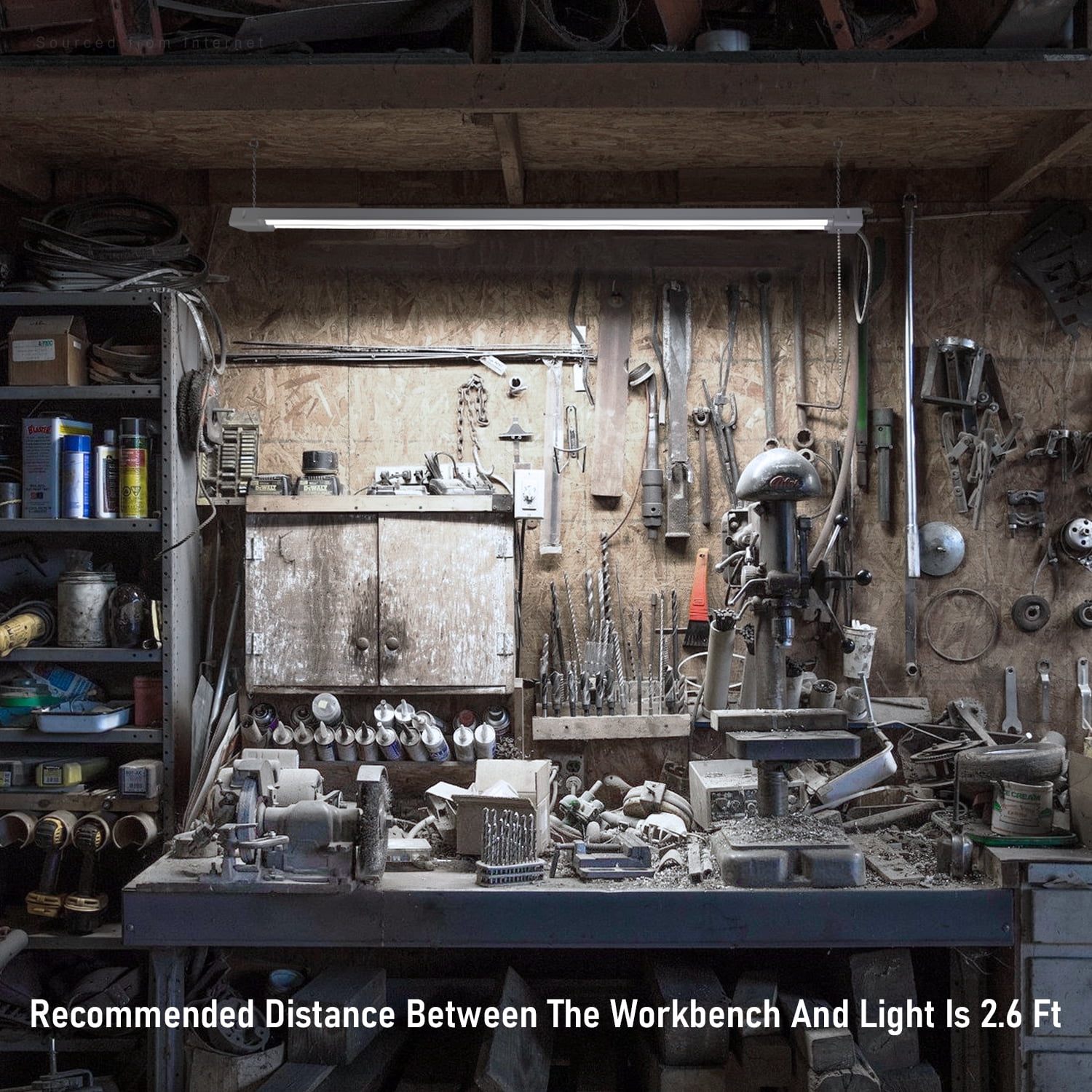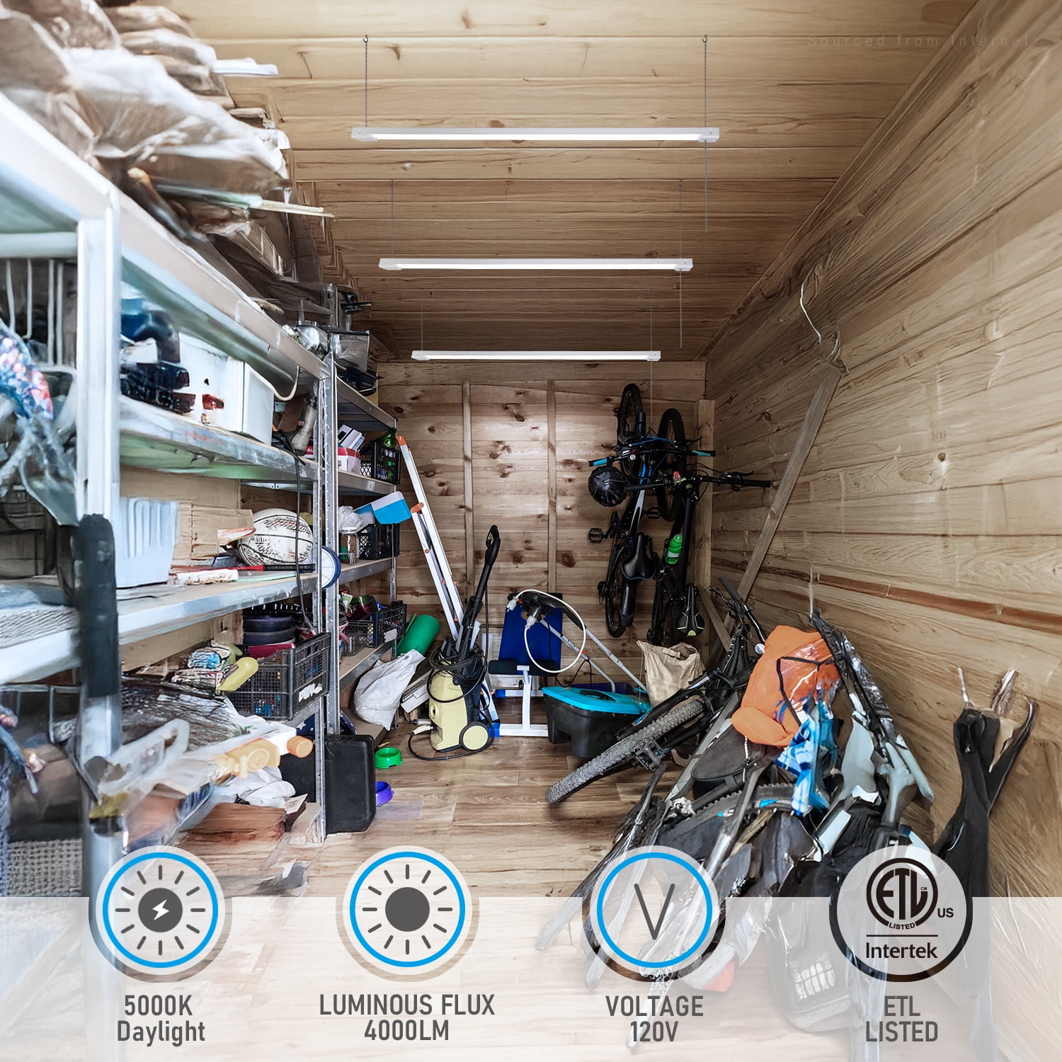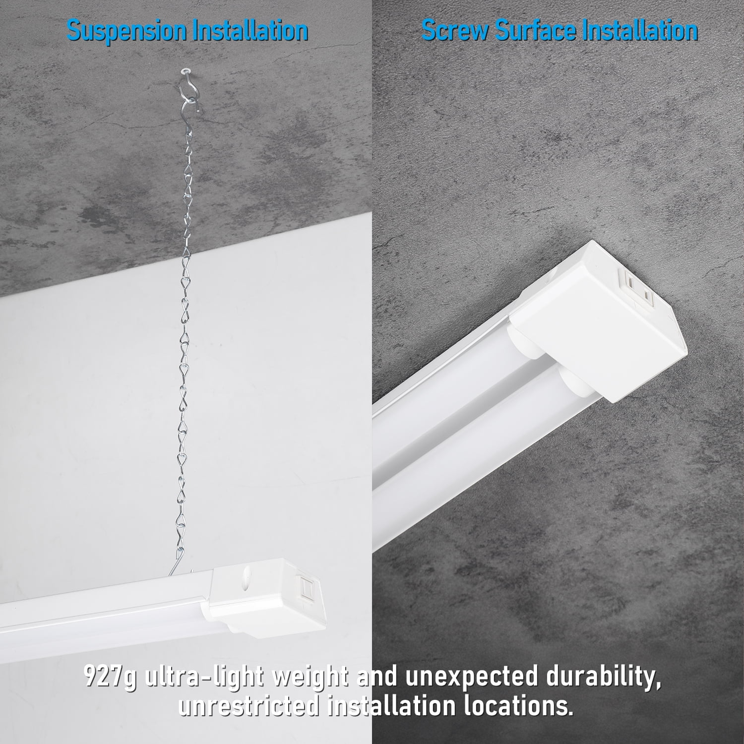 Low Power Consumption Despite its lower wattage, this 4ft LED shop light still delivers ample brightness. The 5000K natural daylight emitted is neither blue nor dazzling, ensuring a more pleasant and comfortable lighting environment for your work. Enhanced Reflective Design Our innovative deep reflector design offers superior performance by minimizing glare and reducing light loss. Additionally, it provides improved dustproof capabilities, protecting the lamp body and extending its lifespan for prolonged usage. Easy-to-Use Linkable Design Each light comes with a 59-inch power cord featuring a 1-15P plug, allowing you to effortlessly connect up to four lights using just one power supply. Our product comes with all the necessary accessories, making it easy for you to choose between surface mounting or suspended mounting according to your requirements. This versatility makes it perfect for various settings such as garages, stores, fast-food restaurants, gyms, and more. Certified for Safety and Quality ETL, FCC and ROHS listed, ensuring its compliance with rigorous safety and quality standards. Additionally, it comes with a generous 3-year warranty, providing you with peace of mind and assurance of its reliability. Specifications Wattage: 40W Voltage: 120V Luminous flux: 4000LM CCT: 5000K Daylight Lifespan: 35,000hrs Waterproof: Damp Working temperature: -4°F-104°F Dimmable: No Beam Angle: 115°