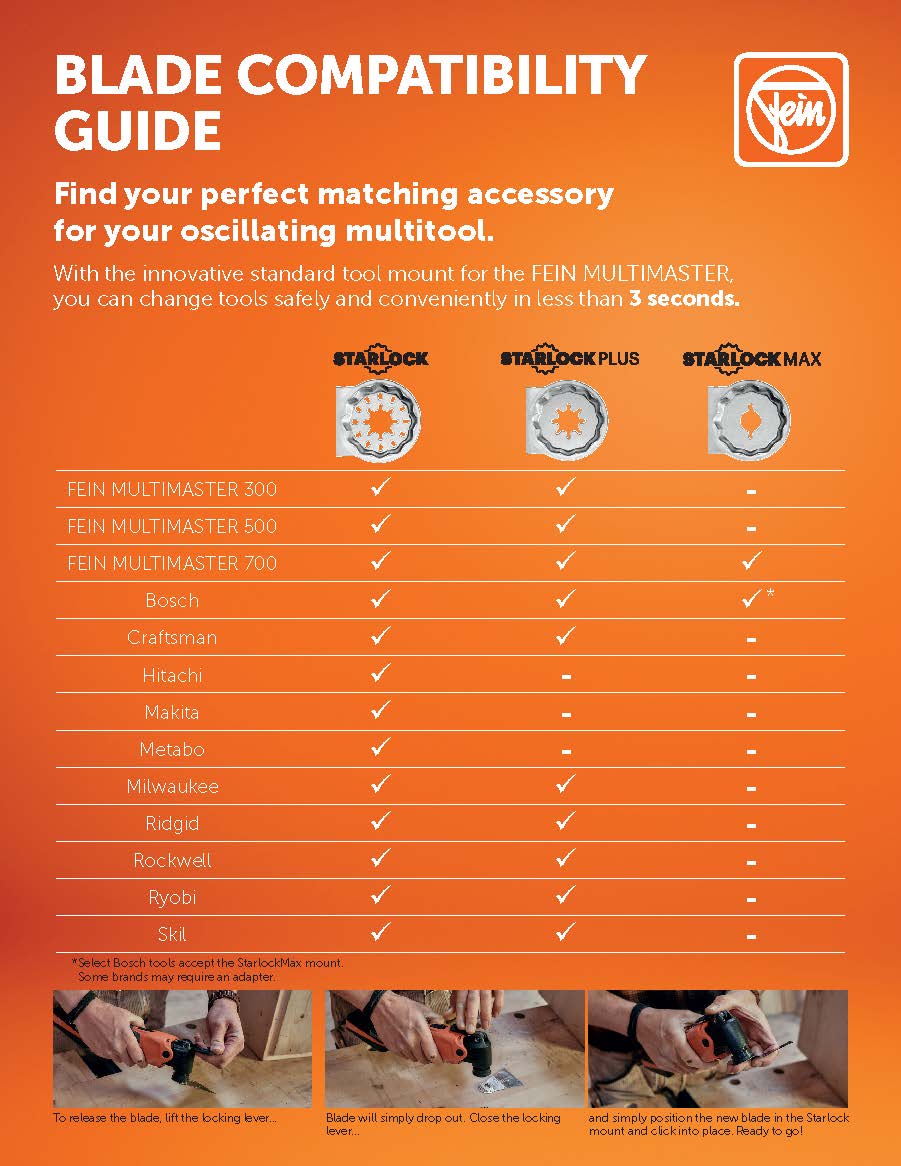 The FEIN Starlock Long-Life E-Cut 183 saw blade has an outstanding service life and excellent work progress.. The Long-Life E-Cut 183 saw blade are extremely robust and makes very clean cuts in drywall, plastics, and all wood materials. The Long-life blades will cut nails (up to approx. 4 mm dia.). Featuring the FEIN Starlock mounting system, the Long-Life E-Cut 183 saw blade fits every popular multifunction tool on the market. Even if you don’t own a FEIN oscillating multi-tool, you can affordably upgrade output by choosing a FEIN Starlock blade. FEIN originated the oscillating tool and is proud to offer innovative and durable accessories that achieve ultimate performance.