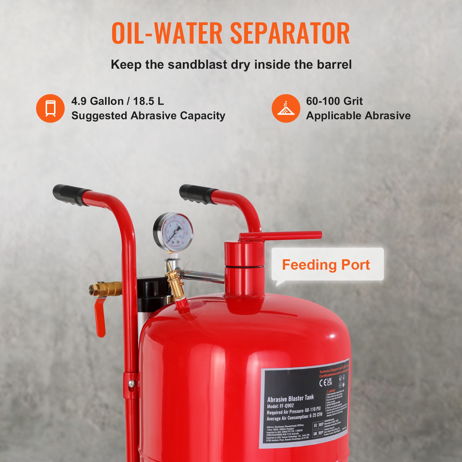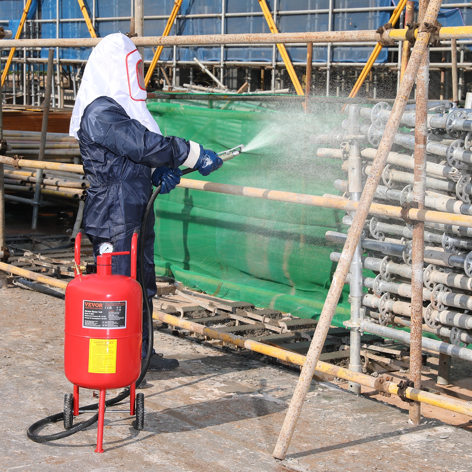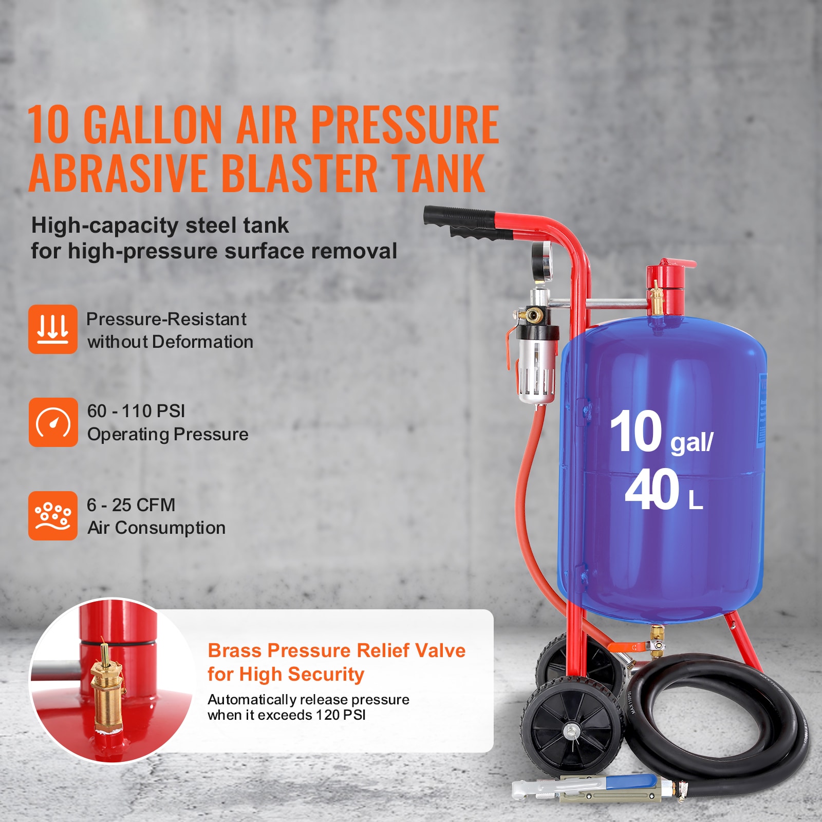 VEVOR 10 Gallon Sand Blaster: Choose VEVOR 10-gallon sandblaster and experience a simpler, more efficient, and precise surface treatment; It enables high-pressure surface treatment, effortlessly removing rust, paint, stain and polishing large areas, also performing perfect sandblasting for curved surfaces and gaps;; [Package Content] 4 x Ceramic Nozzles (2.0 mm, 2.5 mm, 3.0 mm, 3.5 mm); 1 x Sandblasting Face Mask; 1 x Seal Tape; 1 x Pressure Gauge; 1 x Hose with Handheld Sandblasting Gun; 1 x Large R-type Pin; 5 x Small R-type Pins; 5 x Bolts ( M6 x 30 ); 5 x Nuts; 5 x Washers ( Ø24 x 1.2 ); 1 x User Manua
