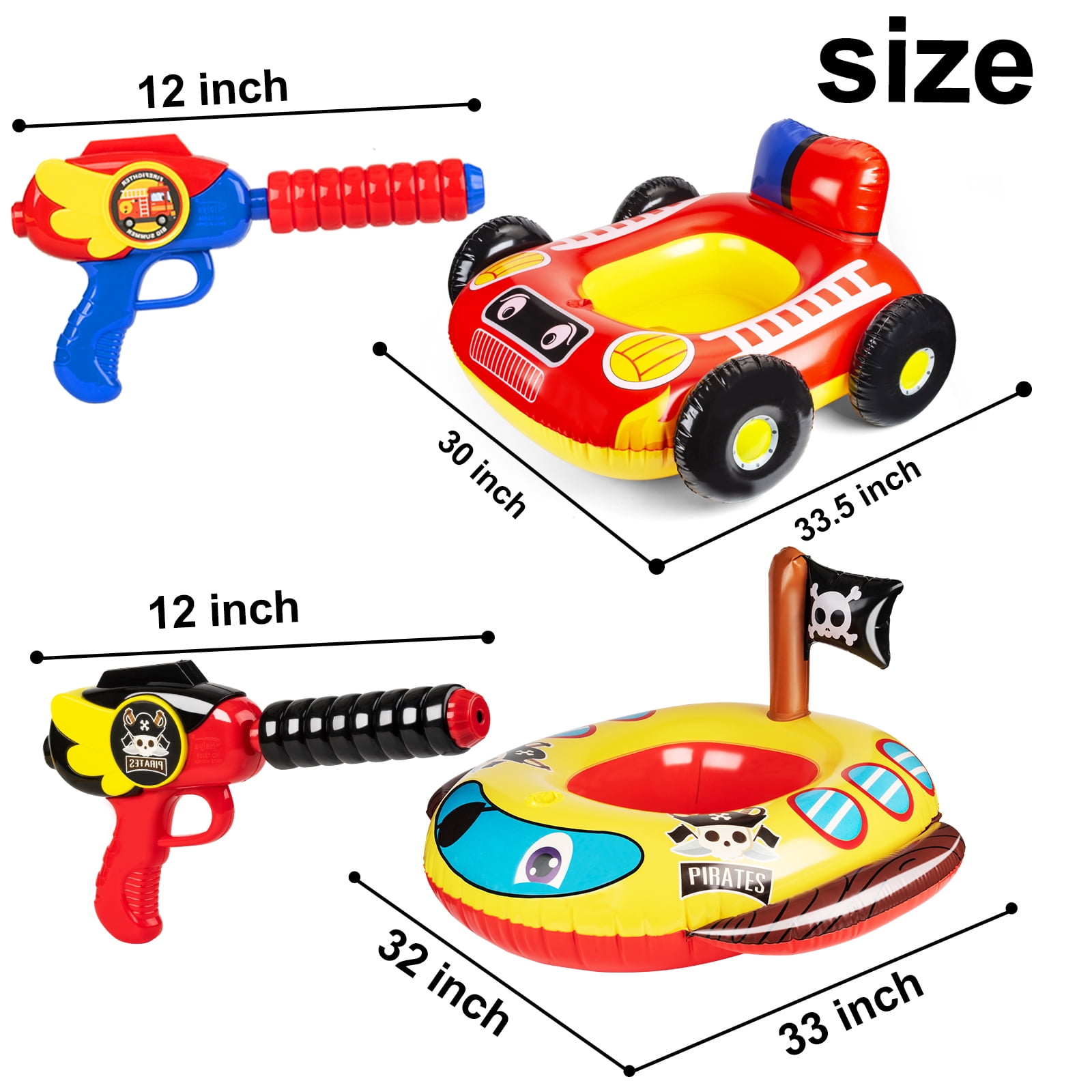 Summer is coming, are you ready? Big summer inflatable toys bring your funny pool floats for kids 3-10 and meet with three or five friends to go to the beach or the pool to play. Let’s spend a happy and cool summer together. The pirate boat pool float and the fire car pool float for kids are made of strong, non-toxic, and thickened PVC material makes your child safe when they play in the pool. Toddler, not afraid to swim around with them. The small pool floats equipped with a constant supply squirter gun, the gun is a separate attachment and can be removed if you want to use them as just a float. This product can guarantee fun time and must-have for any families with kids. Whether it’s for your own home pool or an annual family vacation, you won’t regret this purchase! UPGRADED VERSION OF STURDY MATERIAL: After modified and thickened, our pool floats for kids are of better quality and less prone to breakage. They are more sturdy and more durable than any other product in the market. INCLUDES CONSTANT TOYS WATER GUN!!: Both the Fire boat pool float and the pirate pool float are equipped with a built-in squirt gun. The squirter draws water directly from the pool for an endless water supply, so the Captain of the boat will never have to stop the fun to reload again. Kids or toddlers can play easily. Giving you an enjoyable summer pool time with your children and family. UNIQUE DESIGN AND SUITABLE SIZE FOR KIDS: The toddler pool floats feature pirate boat and fire truck shaped that are extremely attention-grabbing. The dimension of the boat pool float is 33*32 inches. The dimension of the car pool float is 34*31 inches, It’s suitable for toddlers, kids, children, boys, and girls. Recommended for children ages 3-8. NON-TOXIC AND EXCELLENT DURABLE MATERIAL: The kids floats use safe material which is BPA-free and Non-toxic. It is made using heavy-duty vinyl. Our toddler floats are 40% thicker than common products in the market and can better resist punctures. Repair patch included which can take care of your pool and will last a long time. ENDLESS SUMMER WATER FUN: Our kids’ floats for pool 2 packs are easy to take on your trip. They will be the hit of pool and beach parties for children, summer pool party decorations, swimming pool games. Your kids will happily have a water battle with their friends in the pool. It must create a summer-unique atmosphere for your great holiday. SUMMER POOL TOYS GIFT FOR KIDS: The fun pool floats make the swimming pool activities more creative and fun. It is a great summer toys present, also wonderful Easter birthday gift for boys, girls, kiddos, nephews, nieces, grandson, granddaughter. 100% SATISFACTION GUARANTEE: If at any point – for whatever reason – our pool floaties start losing air, please feel free to contact us and we will try our best to fix any issues. Even Beyond regular 30-day return window! Specification: Type: 2 pack pool tubes floats for Kids–pirate ship and fire truck design Dimensions: Pirate float: 33*32 inch Fire truck float: 34*31 inch Suitable for Children, Kids, Toddlers, infant, Boys, Girls Note: Please do not over-inflation: Each product is detected by gas. Pay attention to inflatable, do not charge too full(90% of inflating is enough) Do not use the high-pressure pump to inflate Please keep away from sharp or hot objects. If there are small holes can be repaired with patches included. This is not a lifesaving device. Do not leave the child unattended while the device is in use.