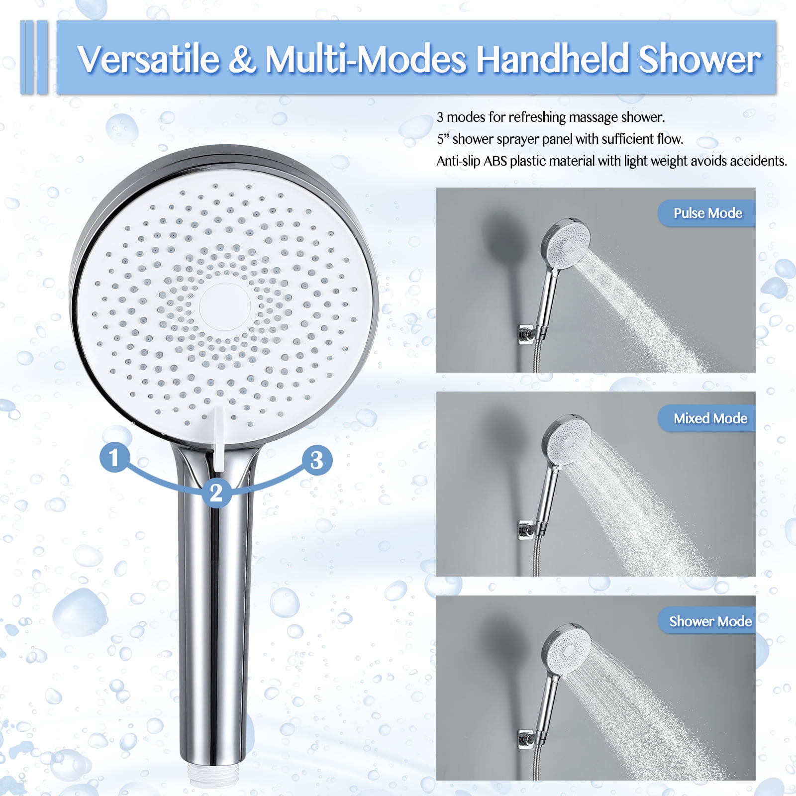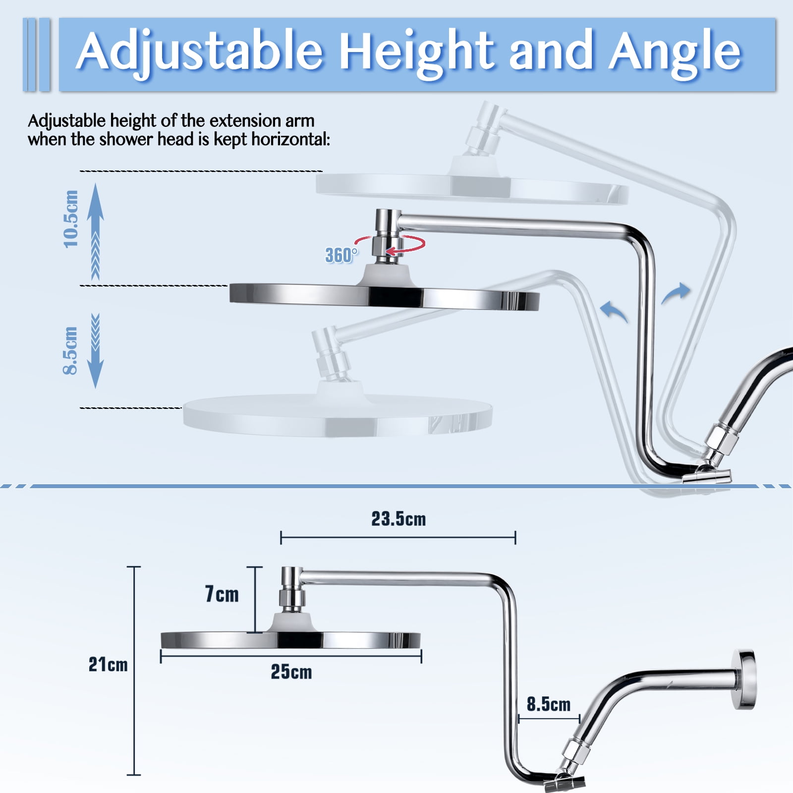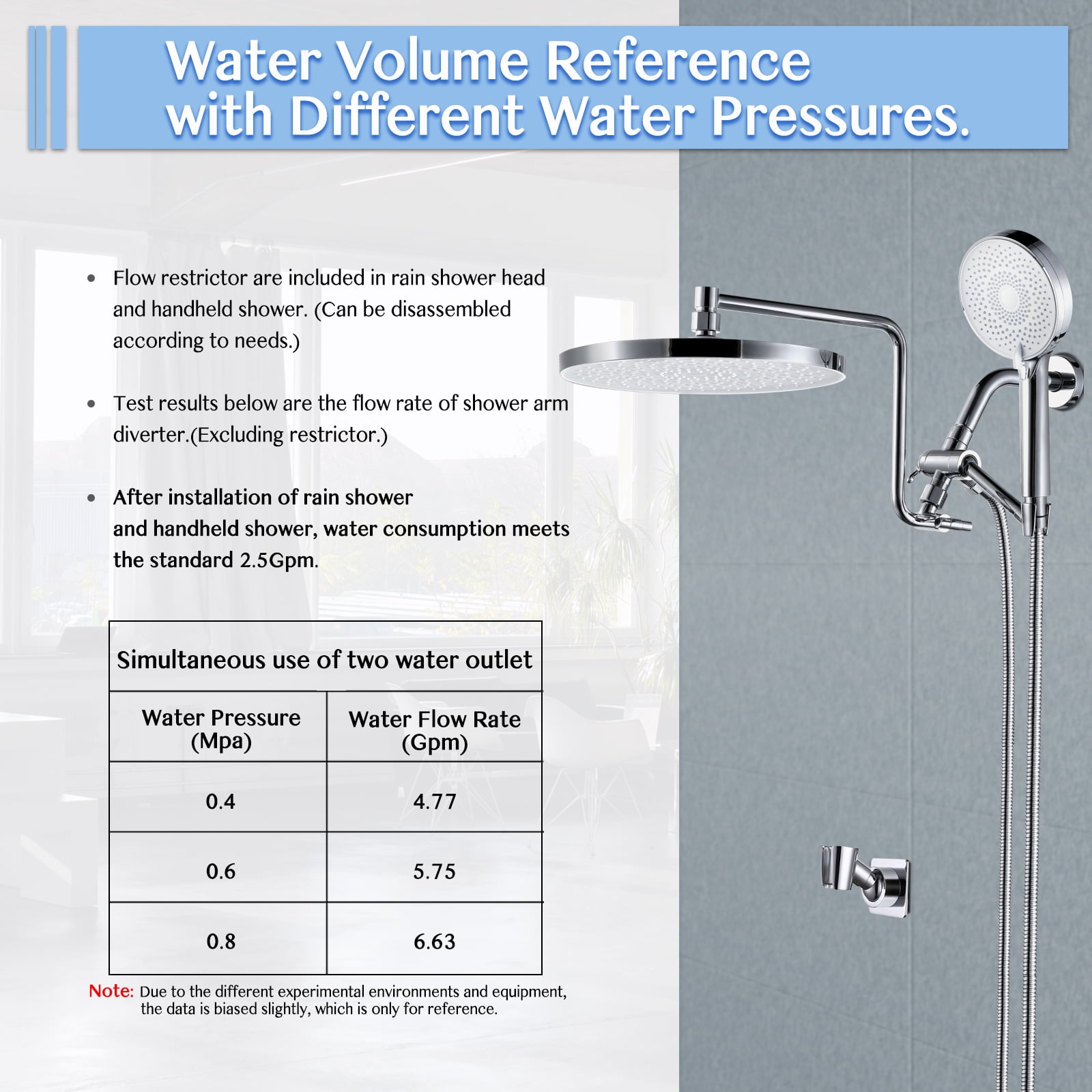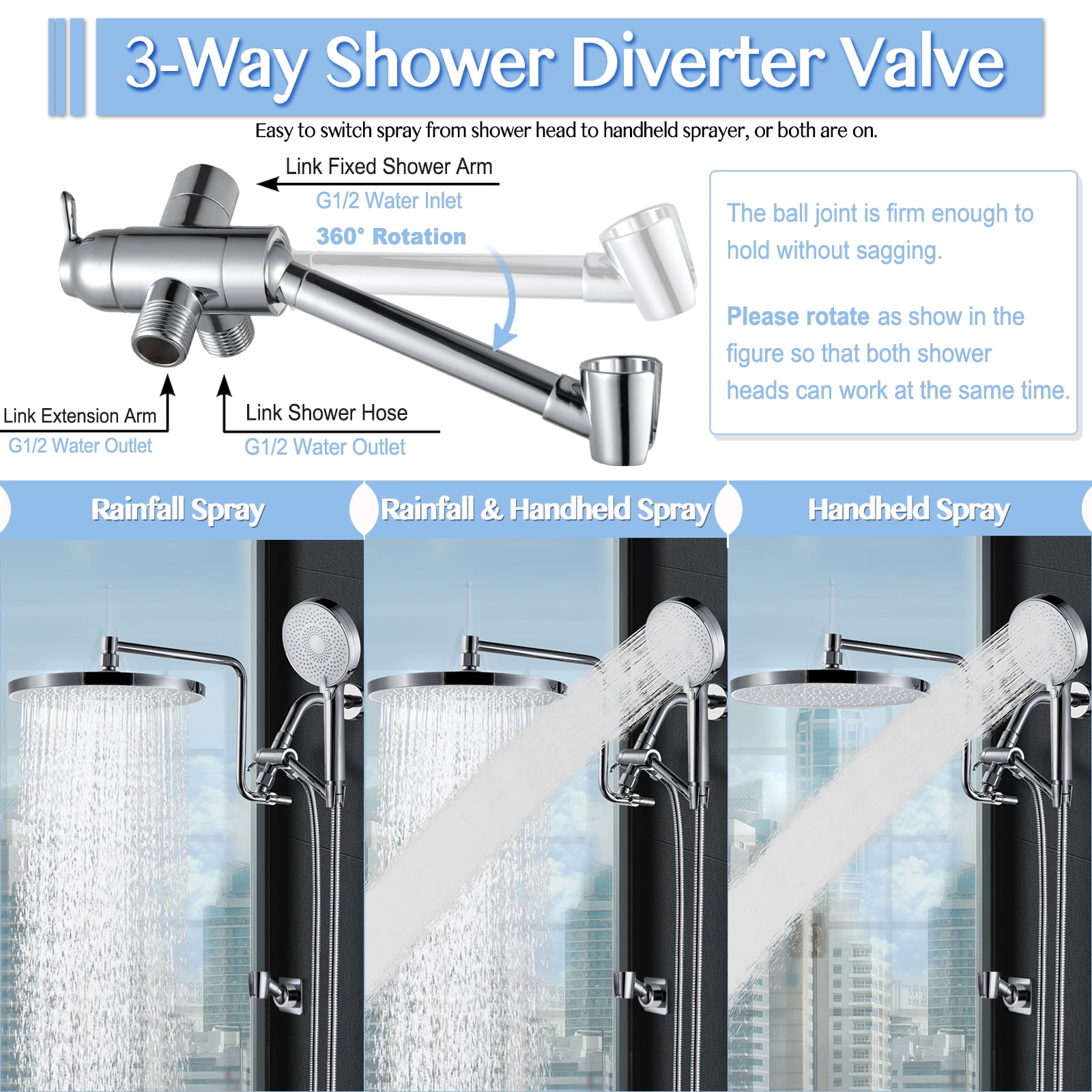 【Upgraded Adjustable 12″ Extension Arm】: Rain shower head with Z-shaped practical shower arm, its height can be adjusted up and down, so that your large size shower head is always vertical and will not hit the shower arm, instead of sloping water like ordinary straight shower arms .Made of all metal, equipped with locking screws, not easy to fall.There is only one knob to adjust the height, which reduces the number of connection points and the possibility of leakage. 【3-Way Diverter Valve with Holder】: Rainfall shower head holder is made of solid brass, heavy duty metal.The holder can put the handheld sprayer on the diverter without sticking the bracket to the wall. Please turn the holder down as shown in the picture, you can use the two showers together without overlapping each other, or use the showers separately, which is very convenient.The ball joint of the holder is very strong and will not sag all the time during use.【Shower Head Combo】: 10″ round anti-skid ABS shower head and 5″ ABS hand shower, the super large panel gives you the perfect experience of showering under the waterfall. The ball joint that provides 360°rotation is made of brass. Compared with plastic ball joint on the market, ours are stronger and will not break or leak. The hand shower provides 3 spray modes, and the beautiful water effect makes you have a pleasant and relaxing shower. 【Solid Brass Shower Holder】: All metal, no plastic, 360°free rotation. Compared to plastics on the market that are prone to cracking and falling, our heavy duty, premium quality, waterproof and rust resistant, glue mounts will never fall off. It needs to be installed on a solid and smooth surface.Once installed, it can be easily rotated using the lever action of the hand shower.Stick it anywhere on the wall for easy use by children in your family or the elderly who need a wheelchair. 【Installation & Accessories】: Waterfall shower head combo with handheld spray can be easy to install, no plumber required. Use standard 1/2” pipe threads. The water saving tablets are already installed in the shower head and hand shower and can be removed as required. Comes with 71″ extra long shower hose, gloves, pipe sealing tape. Please read our instructions carefully before installation. If you have any questions, please feel free to contact us.