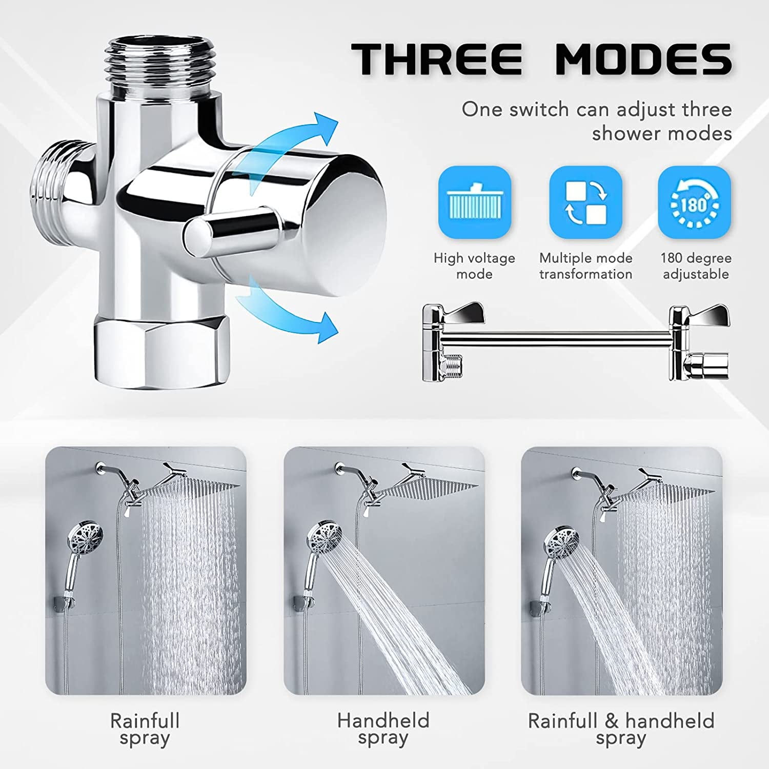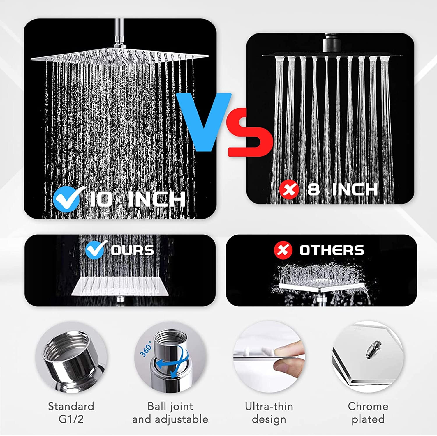 【11” Adjustable Extension Arm】11” Height & Angle adjustable shower arm fits any shower head or hand shower. Solid heavy-gauge brass with strong bearing capacity to support heavy high pressure rain shower head chrome,180 Degrees Height & Angle Adjustable, Allows you to adjust the shower head for best angle and height. 【Self Cleaning Nozzles】10” Large Square Rainfall Showerhead, 100 closely grouped self-clean silicone nozzles provide even spray and prevent lime and hard water build up,resistant to clogging, easy to clean, anti-oxidation and corrosion resistant.Works great even under low water pressure, The combination of ultra-thin and air-in technology leads to high pressure, It will save water for you. 【Installation & Accessories】All accessories are completed, Working with all standard 1/2” pipe threads. tool-free, according to the instructions or installation video in the product images to complete the installation in a few minutes.Additionally equip with 2 stainless steel hooks, 2 pipe sealant tapes and a Bath Sponge. Before you install, please read our instructions carefully. If you have any questions, please feel free to contact us 【Self Cleaning Nozzles】10” Large Square Rainfall Showerhead, 100 closely grouped self-clean silicone nozzles provide even spray and prevent lime and hard water build up,resistant to clogging, easy to clean, anti-oxidation and corrosion resistant.Works great even under low water pressure, The combination of ultra-thin and air-in technology leads to high pressure, It will save water for you. 【Installation & Accessories】All accessories are completed, Working with all standard 1/2” pipe threads. tool-free, according to the instructions or installation video in the product images to complete the installation in a few minutes.Additionally equip with 2 stainless steel hooks, 2 pipe sealant tapes and a Bath Sponge. Before you install, please read our instructions carefully. If you have any questions, please feel free to contact us Color: Silver What’s in the box 10” Rainfall Shower Head x 1 Power Wash Handheld Shower Head x 1 Shower Head Holder x 1 59” stainless steel Hose x 1 3-way Water Diverter x 1 12″ adjustable extension arm x1 water flow regulator x1 Teflon Tape x 2 Rubber Ring x 6 installation manual x 1 Hooksx2 bathballx1