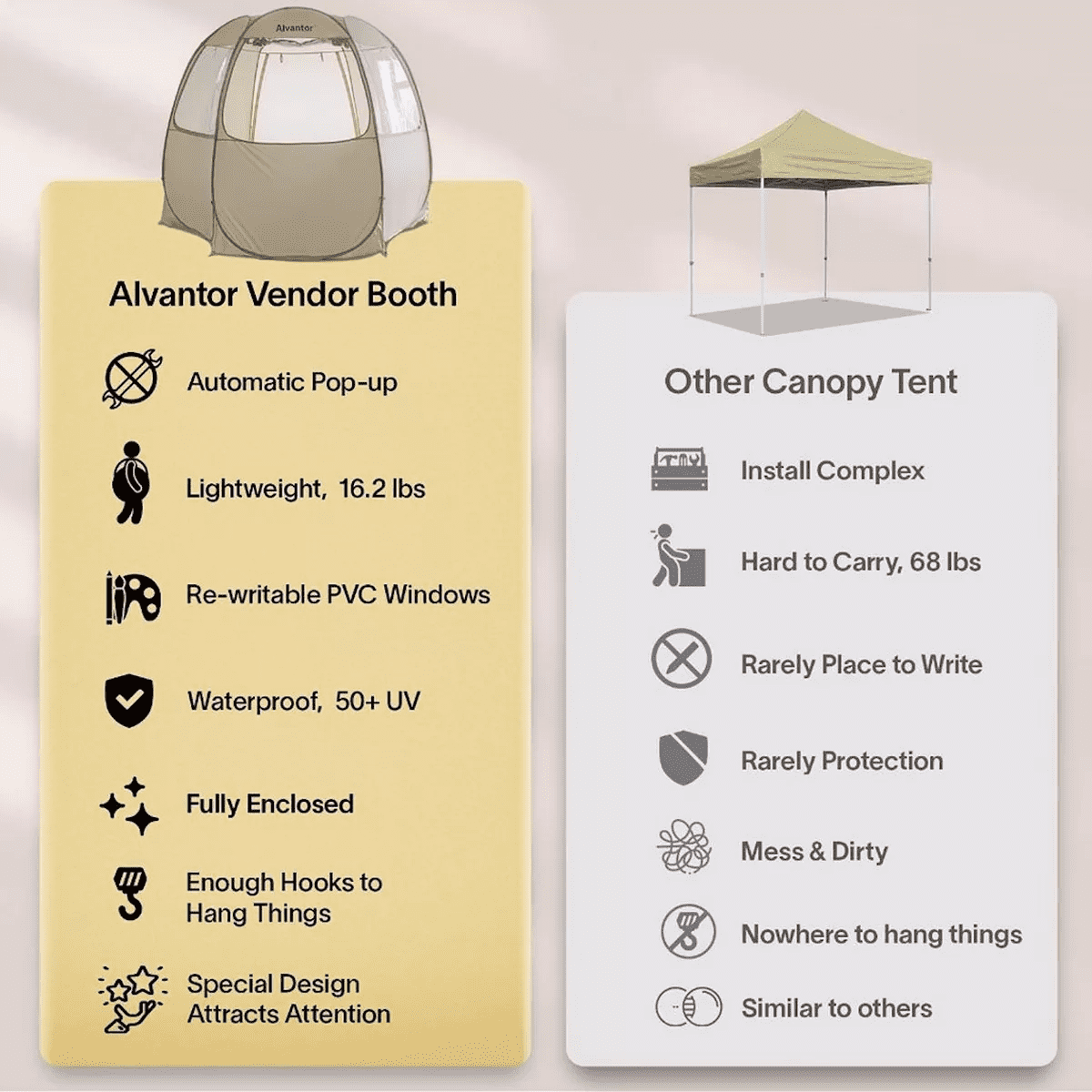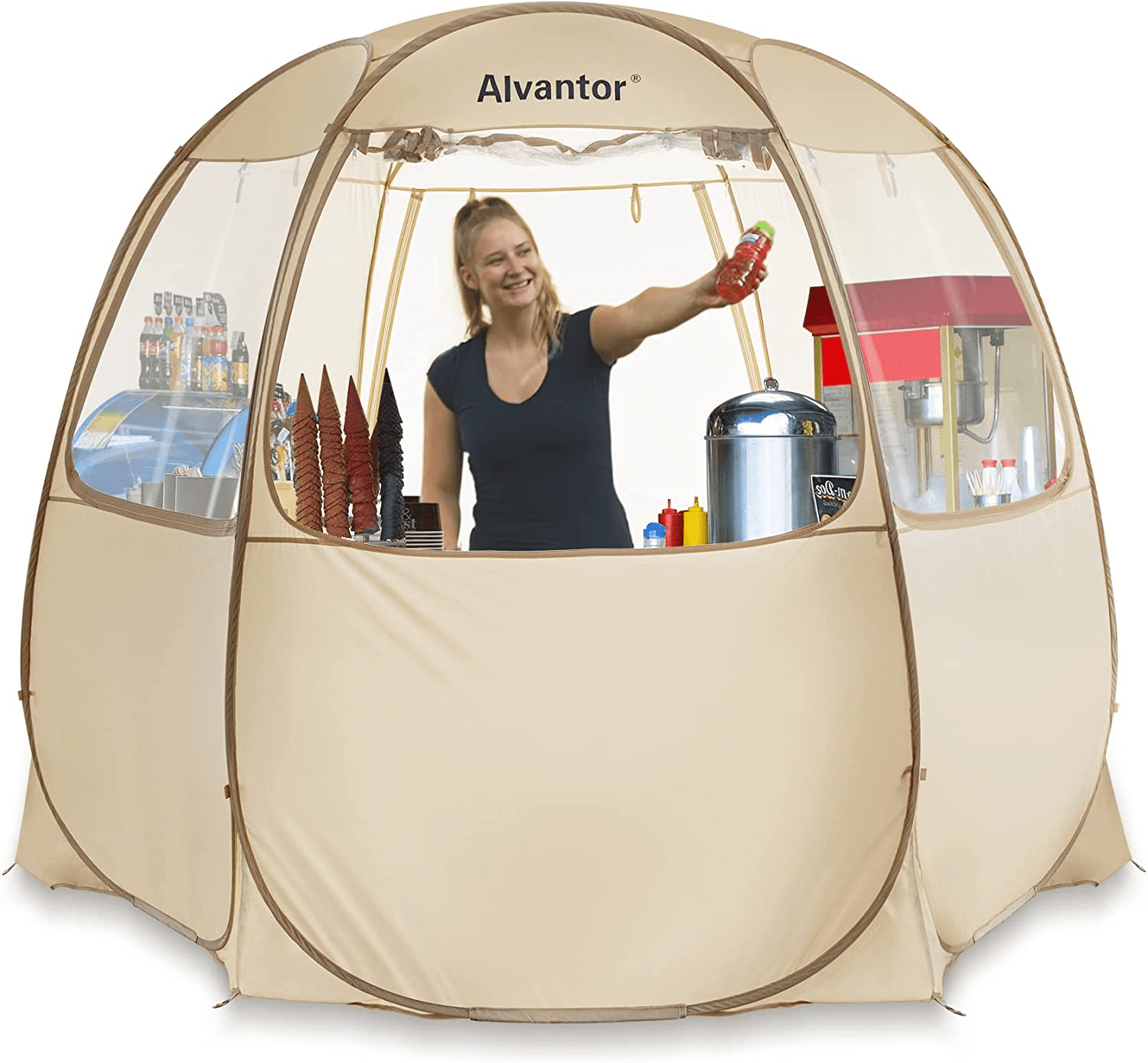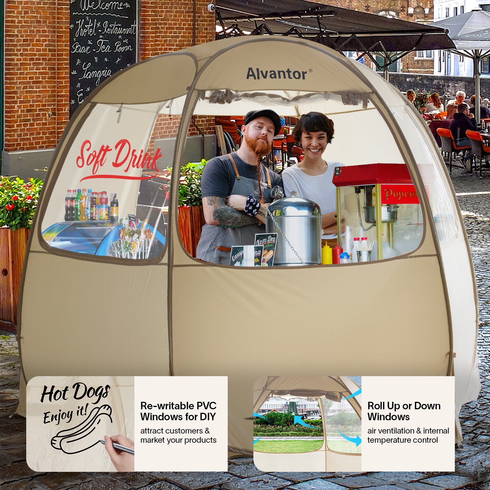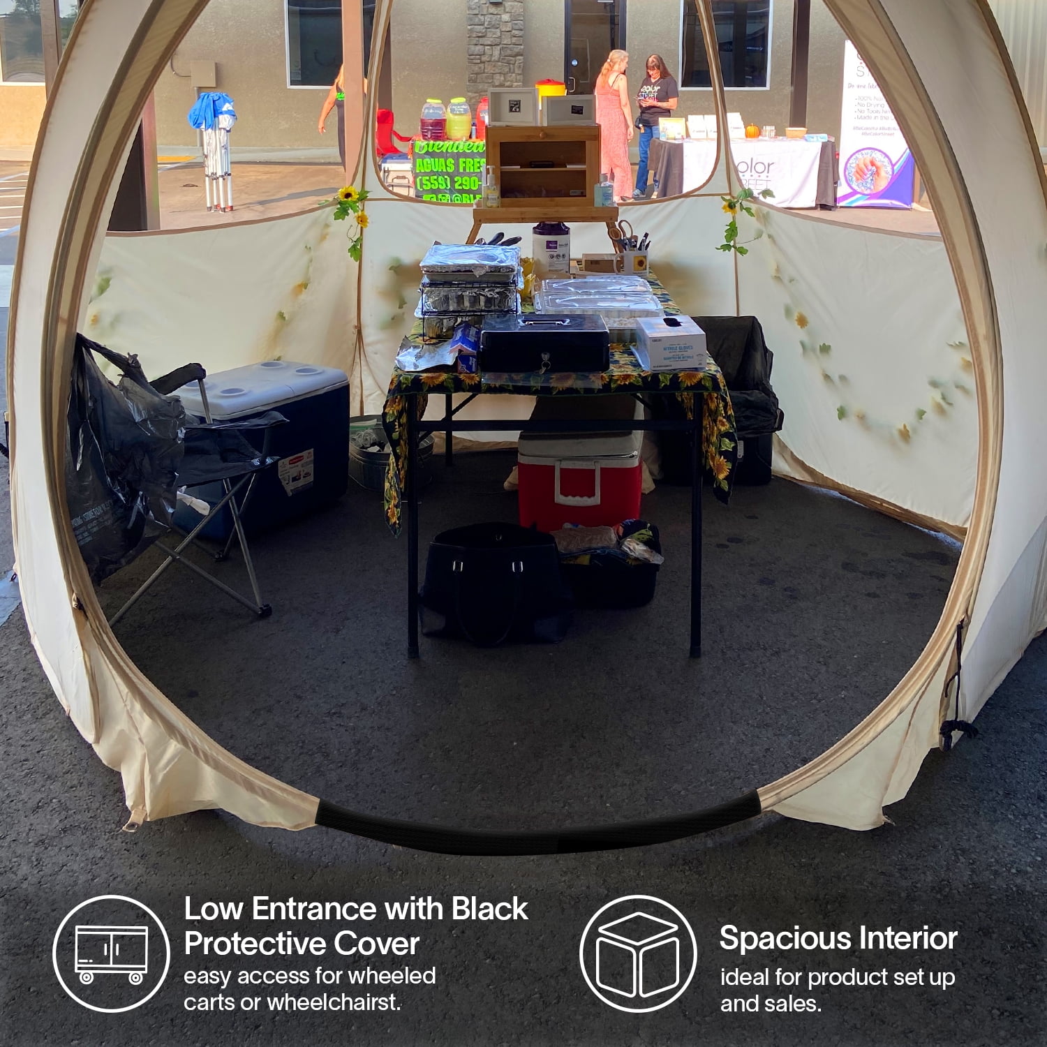 PATENT PENDING PROTECTED DESIGN — Our uniquely designed pop up canopy tent allows you to set up your vendor tent in minutes (large enough to fit 4 – 6 people plus utensils) with minimal assembly required. Our patent pending folding technique lets you fold away and store in minutes, removing the stress of a regular event tent. VERSATILE AND PORTABLE — Set up your mobile vendor booth in many locations with passing trade (zoos, parks, beach, sporting events, markets, etc) effortlessly. One of the lightest options on the market (16.2 lbs) and setup in minutes, your outdoor canopy tent is ready to go with you anywhere. DRY ERASE WINDOWS — Write on the PVC windows with wet/dry erase markers to attract customers, advertise your products, and promote sales inside your mobile store. Roll the windows up or down in your canopy tent with sidewalls for full control over the internal temperatures depending on body heat or equipment usage. QUALITY MATERIALS — The 10×10 pop up canopy fabric is made from 150D Oxford to provide all-day UPF 50+ UV protection from the sun. Fibreglass ribs help keep the event tent sturdy, with further structural integrity available from the included 12 stakes, 6 sandbags, and 12 guylines.