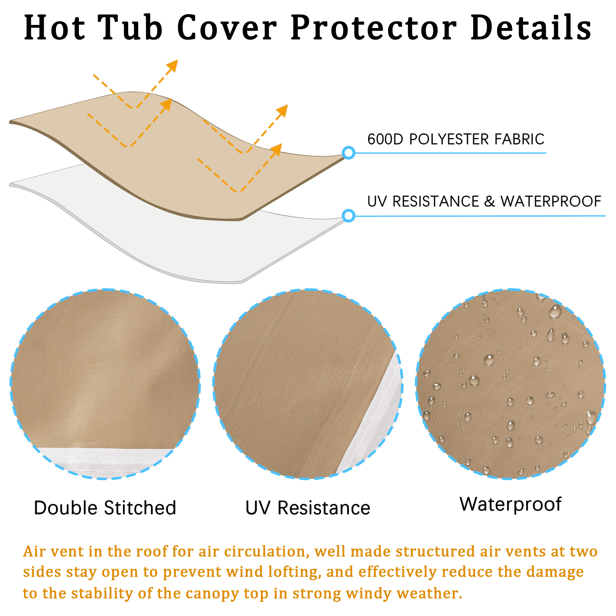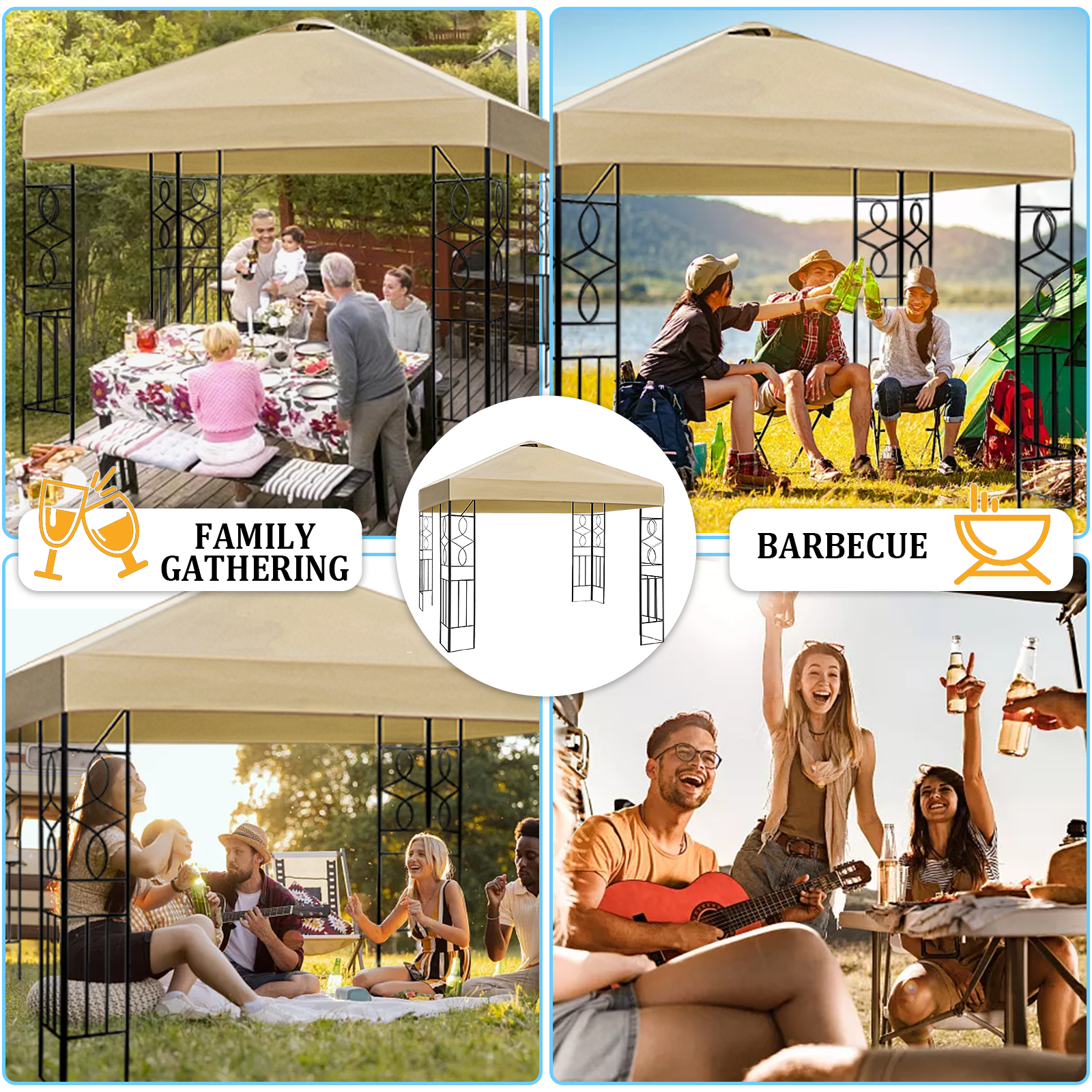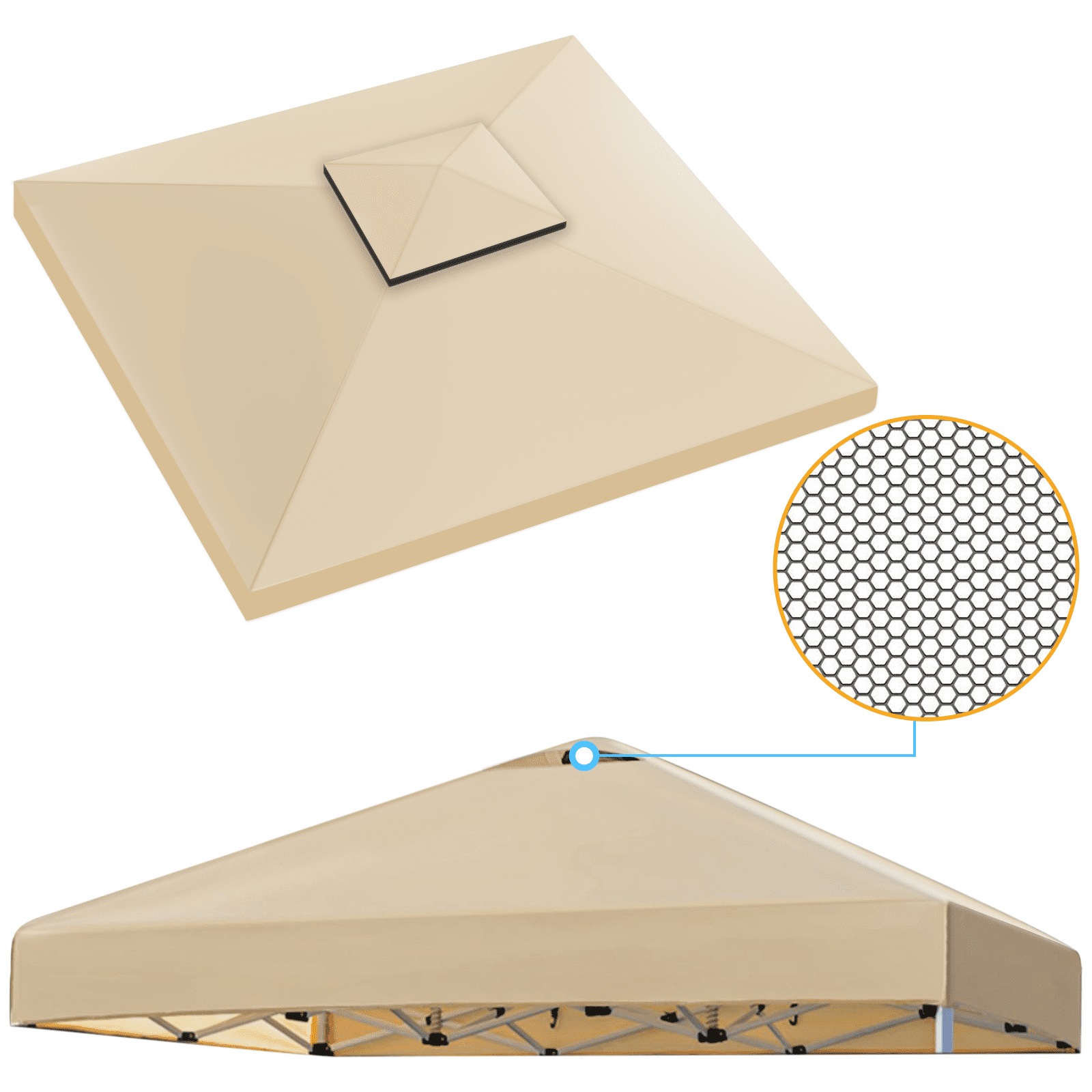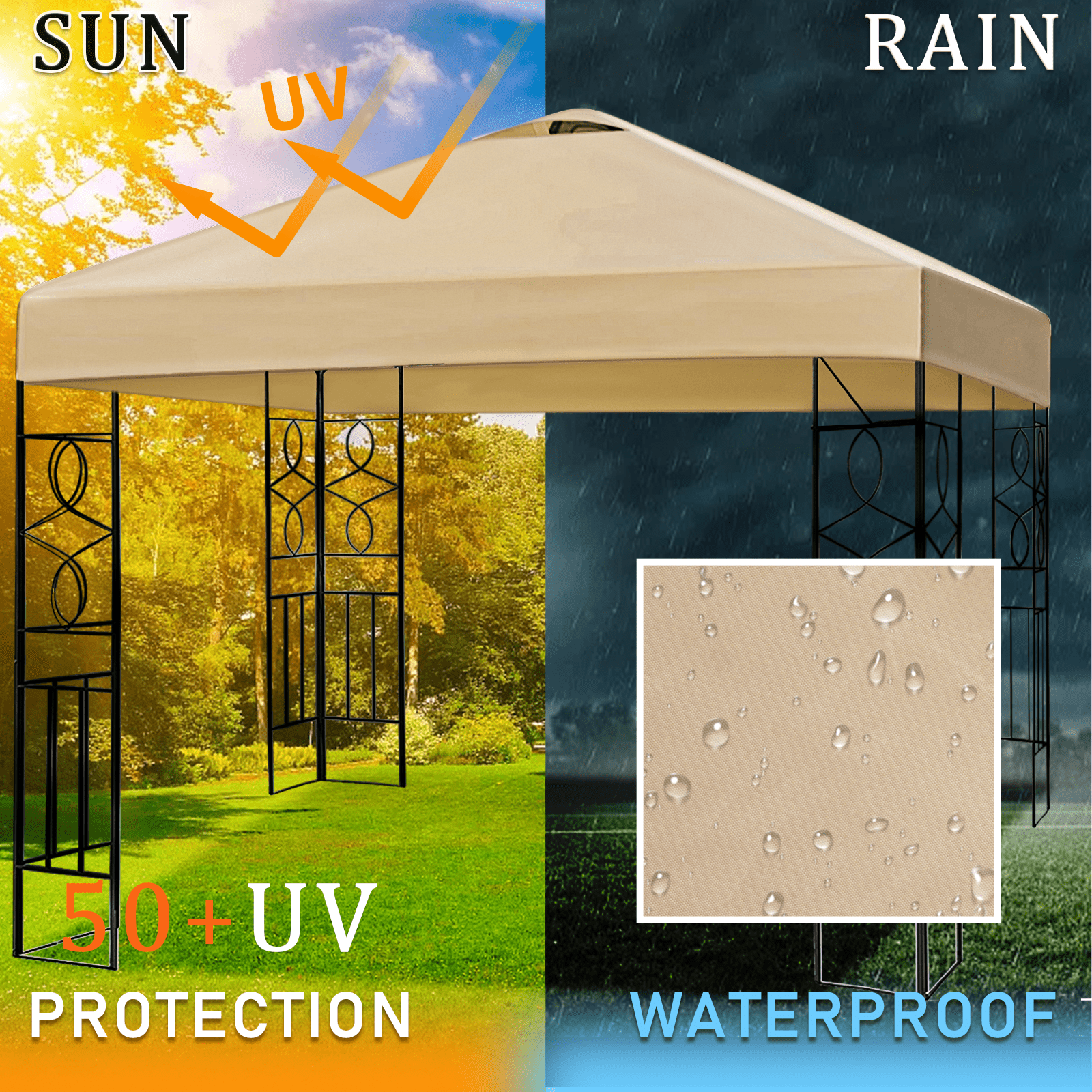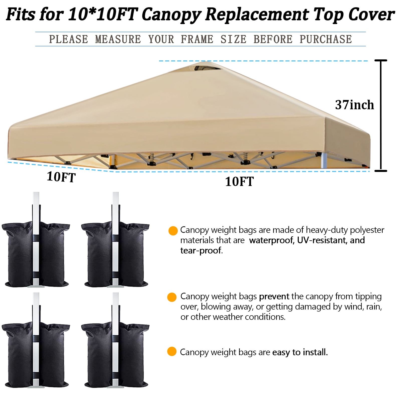 Anti-UV and Waterproof : Our canopy tent top replacement cover is made of premium UV 50 resistance and waterproof 600D durable polyester and PU coating, single tiered design which can effectively block up to 99% of the suns UV Rays, UV resistance and waterproof, provide a healthy environment for your family. Easy to Install : Our 10*10FT canopy tent top cover perfectly fit for 10*10FT double tiered gazebo frame, lightweight, foldable, durable & sturdy, waterproof and UV resistance, made of environmentally friendly materials, easy to use and store. The top air vent in the roof increase air circulation and allows the wind and barbecue smoke to pass through quickly. Single Tiered Replacement Canopy : The 10*10FT canopy tent top cover compatible with most of standard canopy frames, perfect for your broken one or buy it as a backup. Single-tiered air vents canopy enhances stability against wind and provide a better air circulation. Widely Application : Only include canopy tent top cover, canopy frames and curtains are not included. The canopy replacement cover are widely used in outdoor events, BBQ, sporting events, trade shows, commercial business, picnics, birthday party, arts, etc. Please measure your frame size before purchase. With 4 Pack Canopy Weight Bags : The canopy replacement cover with bonus 4 pack canopy weight bags, which can provide increased stability to canopy on hard surface. Canopy weight bags have multiple compartments which can be filled with sand or other types of heavy materials. This allows you to adjust the weight according to your needs.