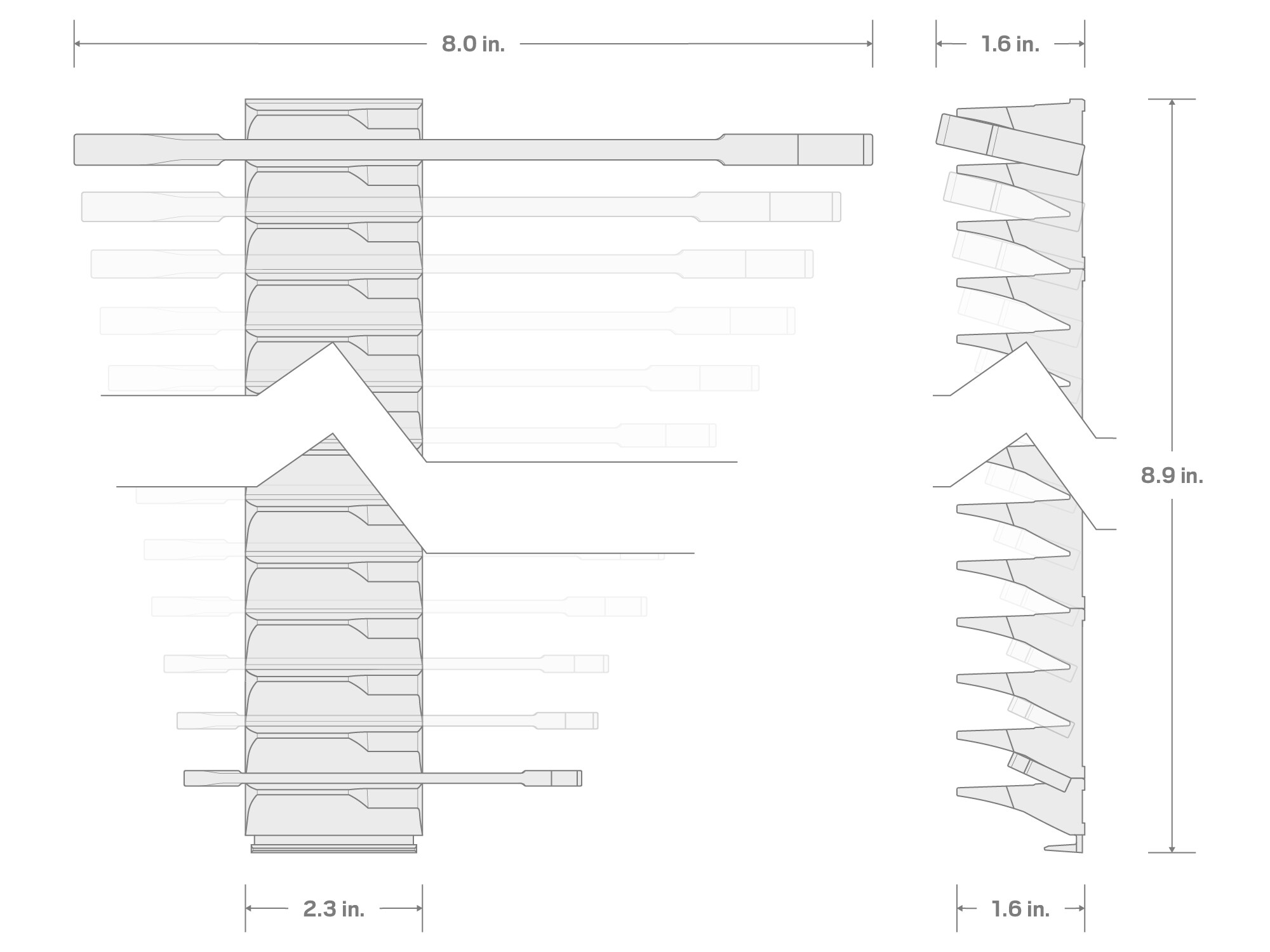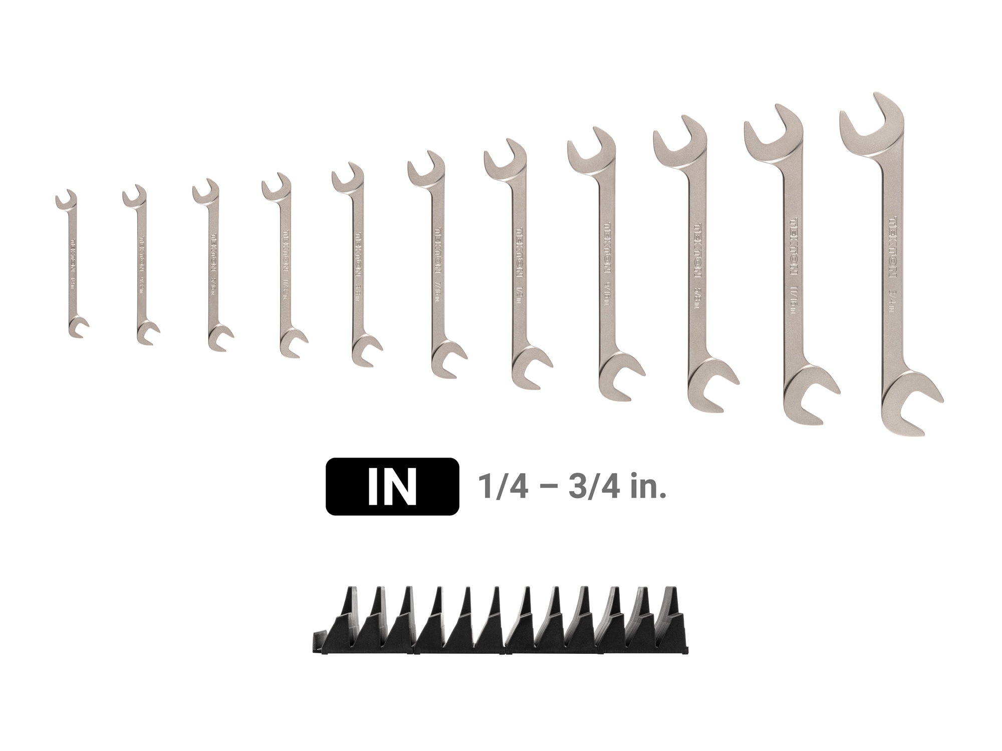 Tekton Angle Head Open End Wrenches allow you to progressively turn fasteners and fittings in confined spaces, saving you time because you can continue to work without disconnecting or dismantling equipment to access hard-to-reach areas. The 30 and 60 degree angled heads provide greater coverage with fewer blind spots in limited access situations, and the beam is shifted up and out of the way to achieve the greatest range of motion in confined spaces. The shape of the head is also optimized for access and strength while also preventing jaw spread. We make our angle wrenches from 4140 chromium-molybdenum steel and harden them to 50–53 HRC. The wrenches are abrasive-blasted to create a finely textured satin finish and then plated with corrosion-resistant nickel. The wrenches have laser-engraved size markings and (with the exception of the smallest wrench sizes) chamfered handles. Our angle wrenches are manufactured entirely in the USA with USA-made materials. Machining, engraving, vibration polishing, abrasive-blasting, and plating take place at our Grand Rapids, Michigan manufacturing facility. This set includes modular wrench organizers that fit most toolbox drawers, keeping your wrenches neatly arranged with consistent spacing.