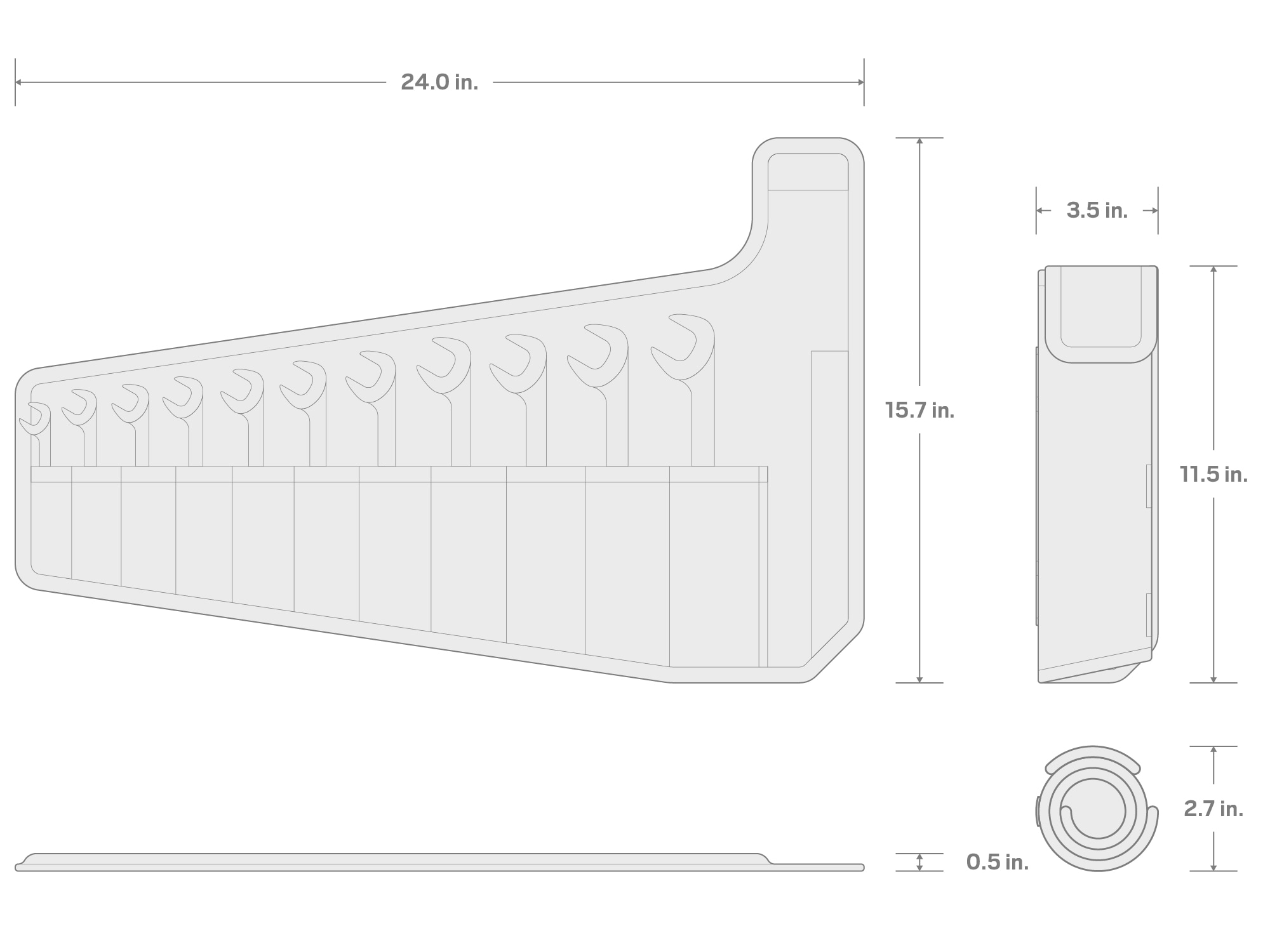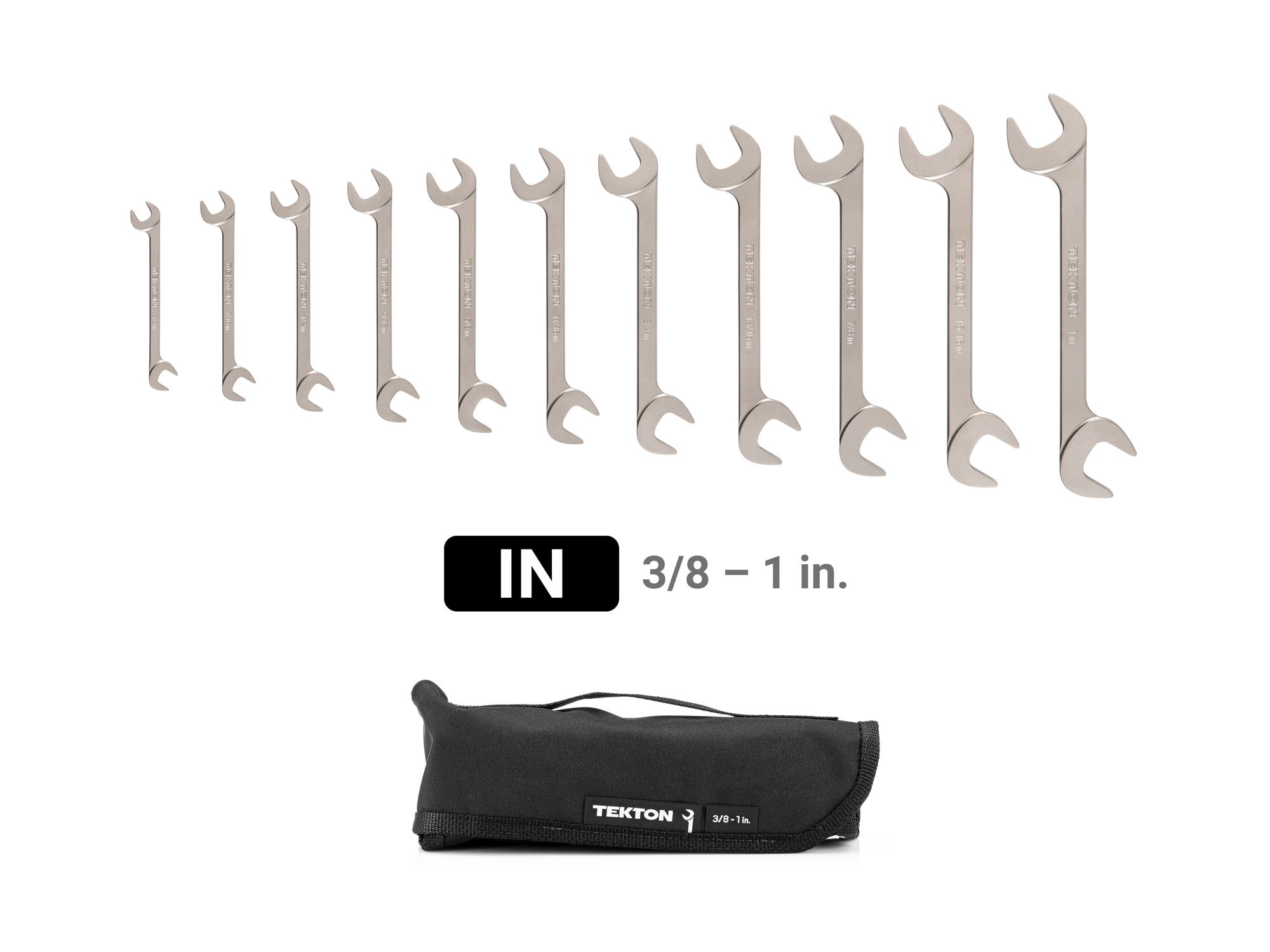 Tekton Angle Head Open End Wrenches allow you to progressively turn fasteners and fittings in confined spaces, saving you time because you can continue to work without disconnecting or dismantling equipment to access hard-to-reach areas. The 30 and 60 degree angled heads provide greater coverage with fewer blind spots in limited access situations, and the beam is shifted up and out of the way to achieve the greatest range of motion in confined spaces. The shape of the head is also optimized for access and strength while also preventing jaw spread. We make our angle wrenches from 4140 chromium-molybdenum steel and harden them to 50–53 HRC. The wrenches are abrasive-blasted to create a finely textured satin finish and then plated with corrosion-resistant nickel. The wrenches have laser-engraved size markings and (with the exception of the smallest wrench sizes) chamfered handles. Our angle wrenches are manufactured entirely in the USA with USA-made materials. Machining, engraving, vibration polishing, abrasive-blasting, and plating take place at our Grand Rapids, Michigan manufacturing facility. This set includes a compact roll-up pouch that keeps wrenches well-packed and unable to slide out.