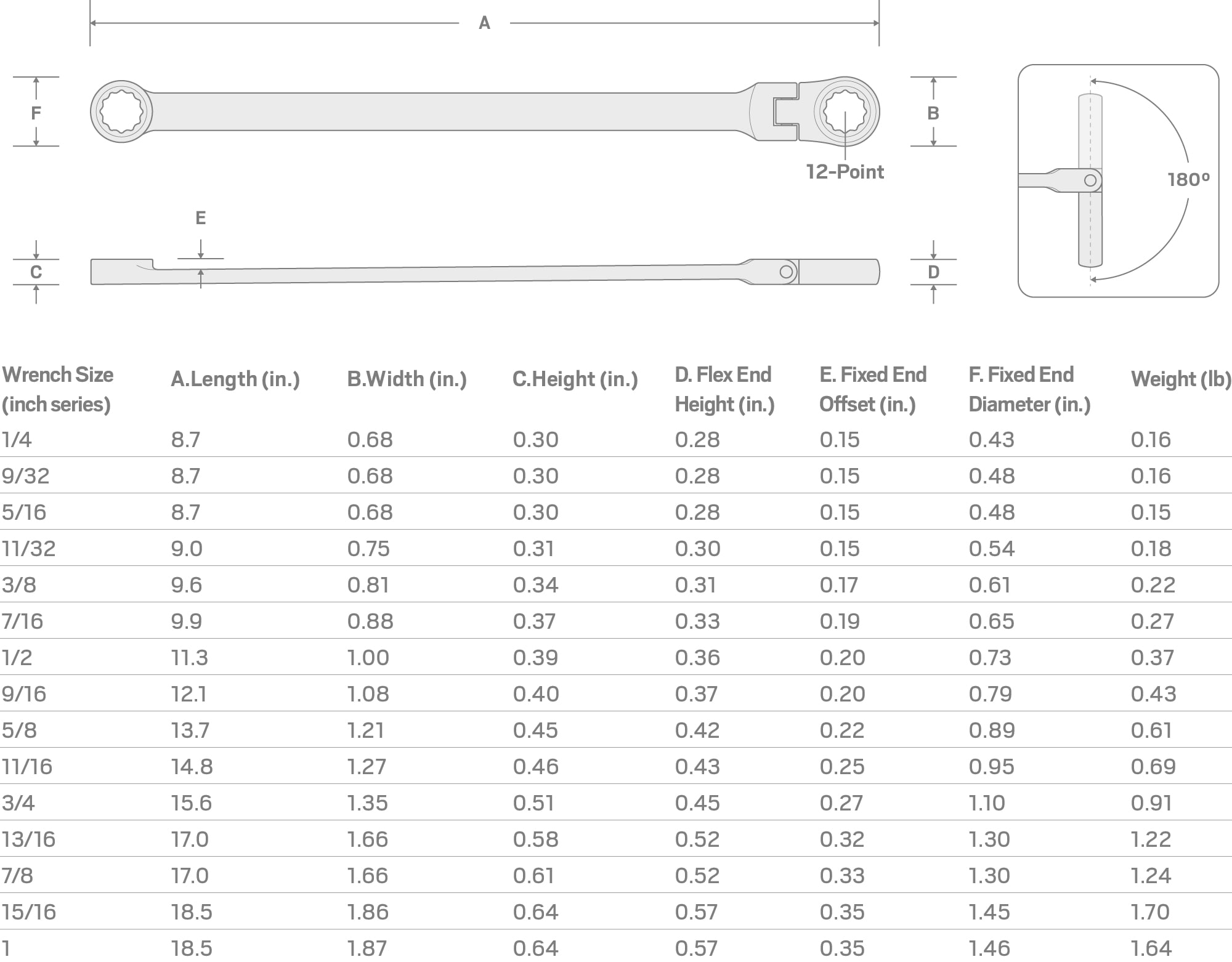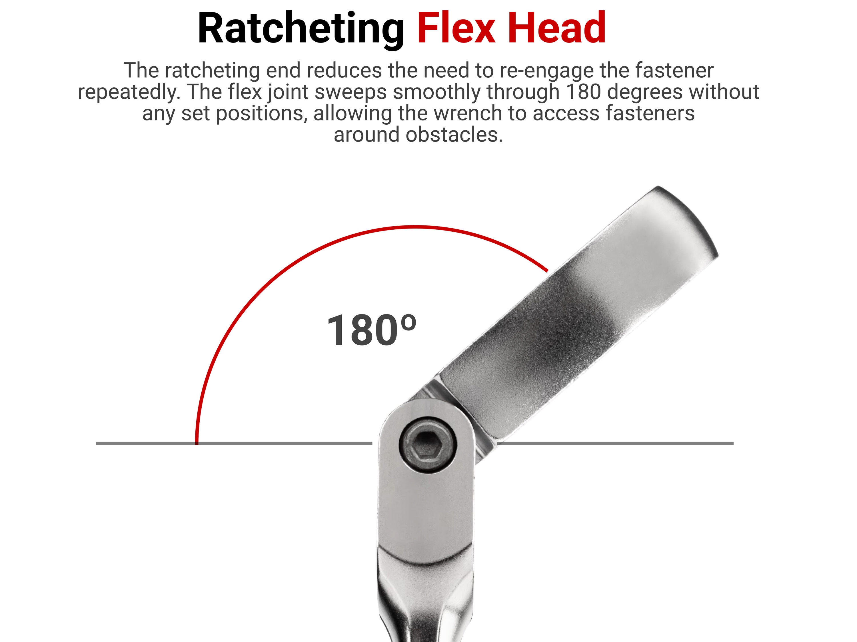 Tekton Long Fixed/Flex Head 12-Point Ratcheting Box End Wrenches each have one wrench size and two head styles. The double box ends are the same size and both are 12-point, but one side features a raised fixed head while the other has a ratcheting flex head. The fixed box end has a flush side to maximize surface contact with a fastener as well as a raised side for finger clearance and to fit into recessed areas. The ratcheting end reduces the need to re-engage the fastener repeatedly. The flex joint sweeps smoothly through 180 degrees without any set positions, allowing the wrench to access fasteners around obstacles. The 12-point box ends fit multiple types of fasteners, including 6-point, 12-point, and square. Tekton fixed/flex head ratcheting wrenches are permanently marked in two ways: a high-visibility laser marking and a stamped marking. We make these wrench bodies from 6140 chromium-vanadium steel and heat-treat them to 42–49 HRC. The wrenches are abrasive-blasted to create a finely textured finish and then plated with a trivalent chrome process.