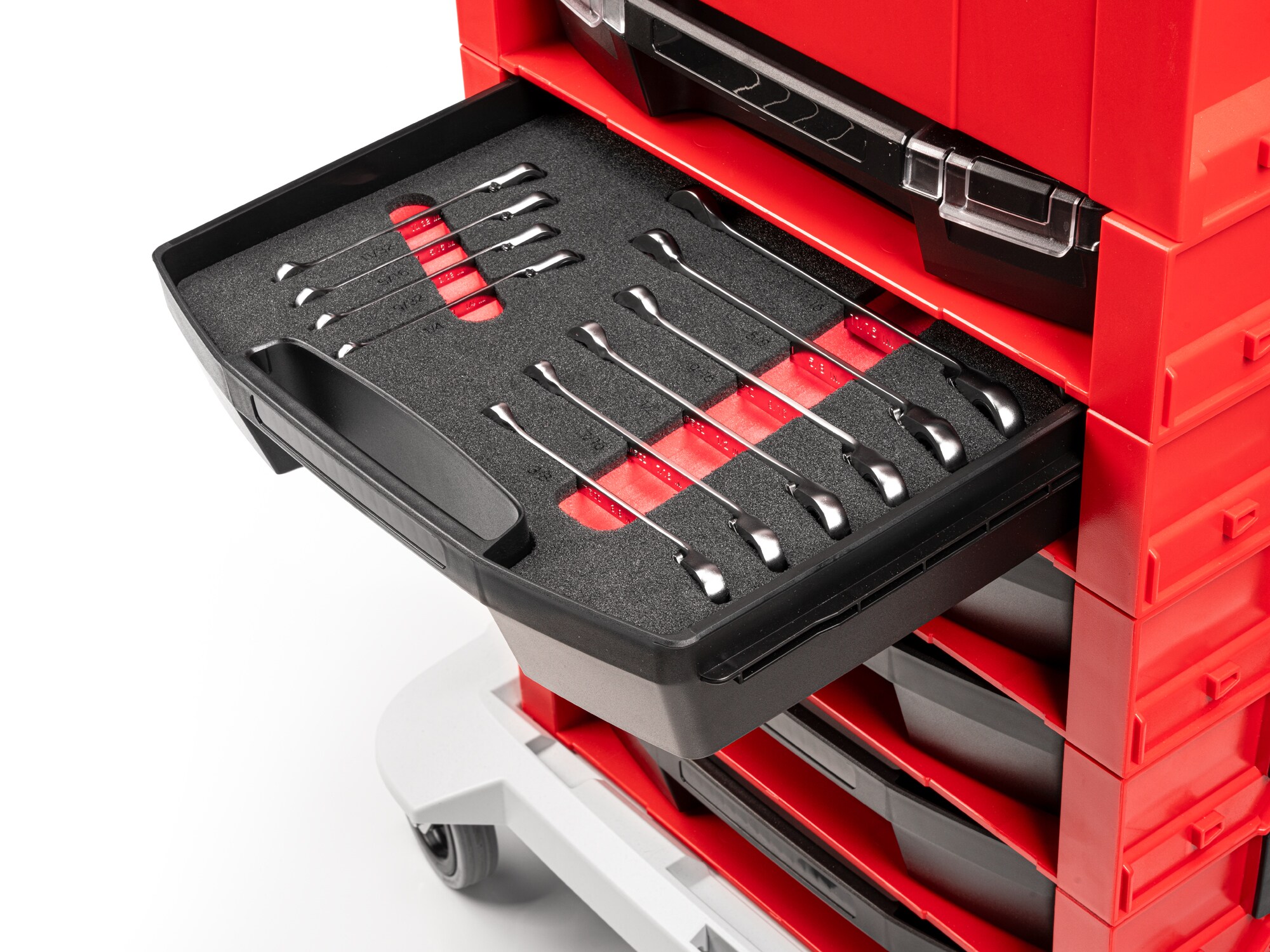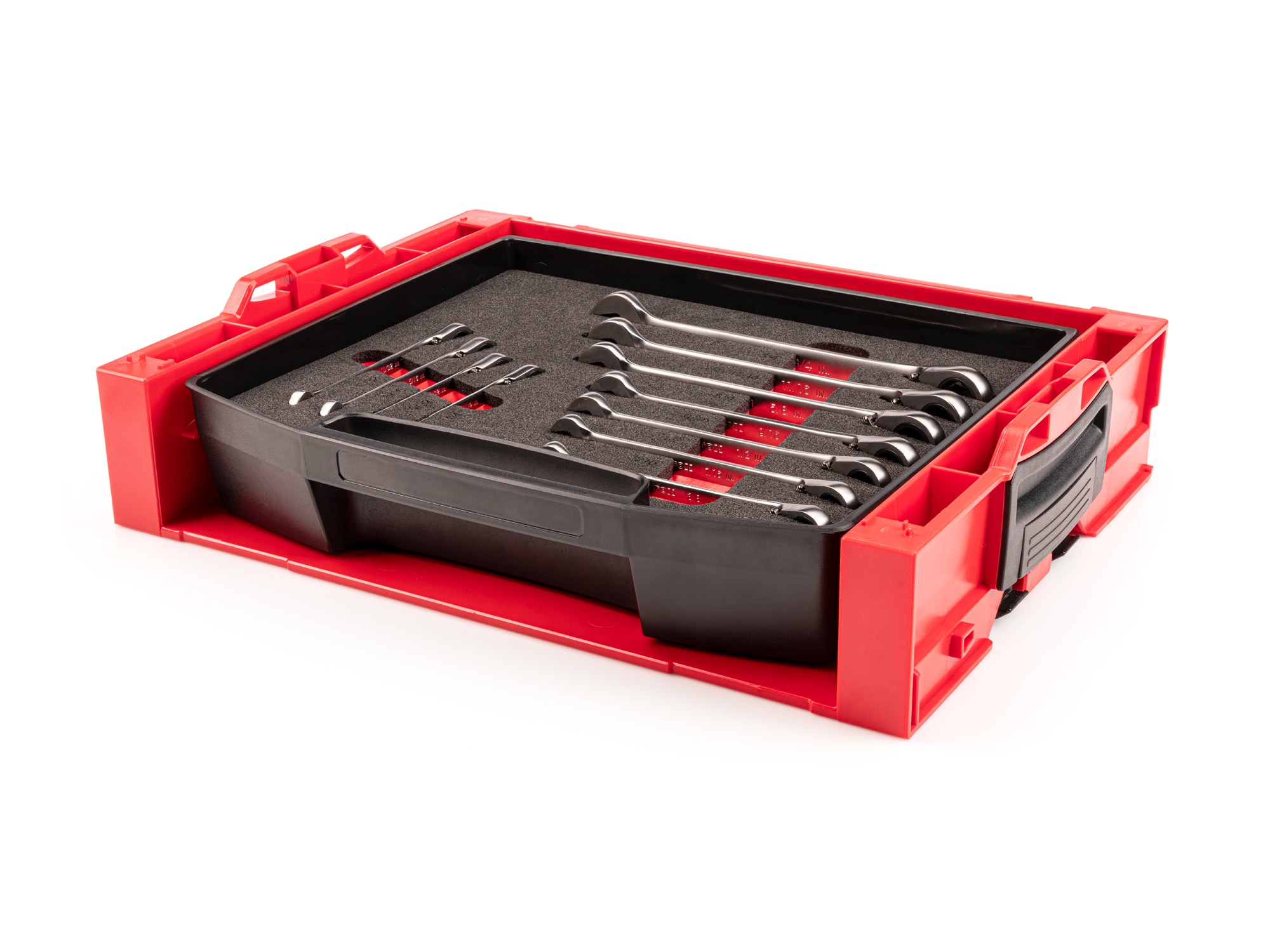 This Tekton reversible ratcheting combination wrench set is part of the L-BOXX® Stacking Organization System and connects with all other components in the L-BOXX family of products, providing virtually infinite options for configuring your own custom organization system. The set includes a range of inch reversible ratcheting combination wrenches in an open top drawer and stacking drawer rack. The handles on the side of the stacking drawer rack provide stability when latching components together. Press both side handles in and lift up to remove the drawer from the stack. The open top drawer offers quick access to drawer contents without taking apart your organization stack. Included write-on labels allow for easy identification of drawer contents. The laser-marked foam layouts are designed and cut in our Grand Rapids, Michigan manufacturing facility to optimize for high density, easy access, and secure fit. The foam is made of two color-contrasting layers that are permanently bonded together with a heat lamination process, making any missing tools immediately visible.