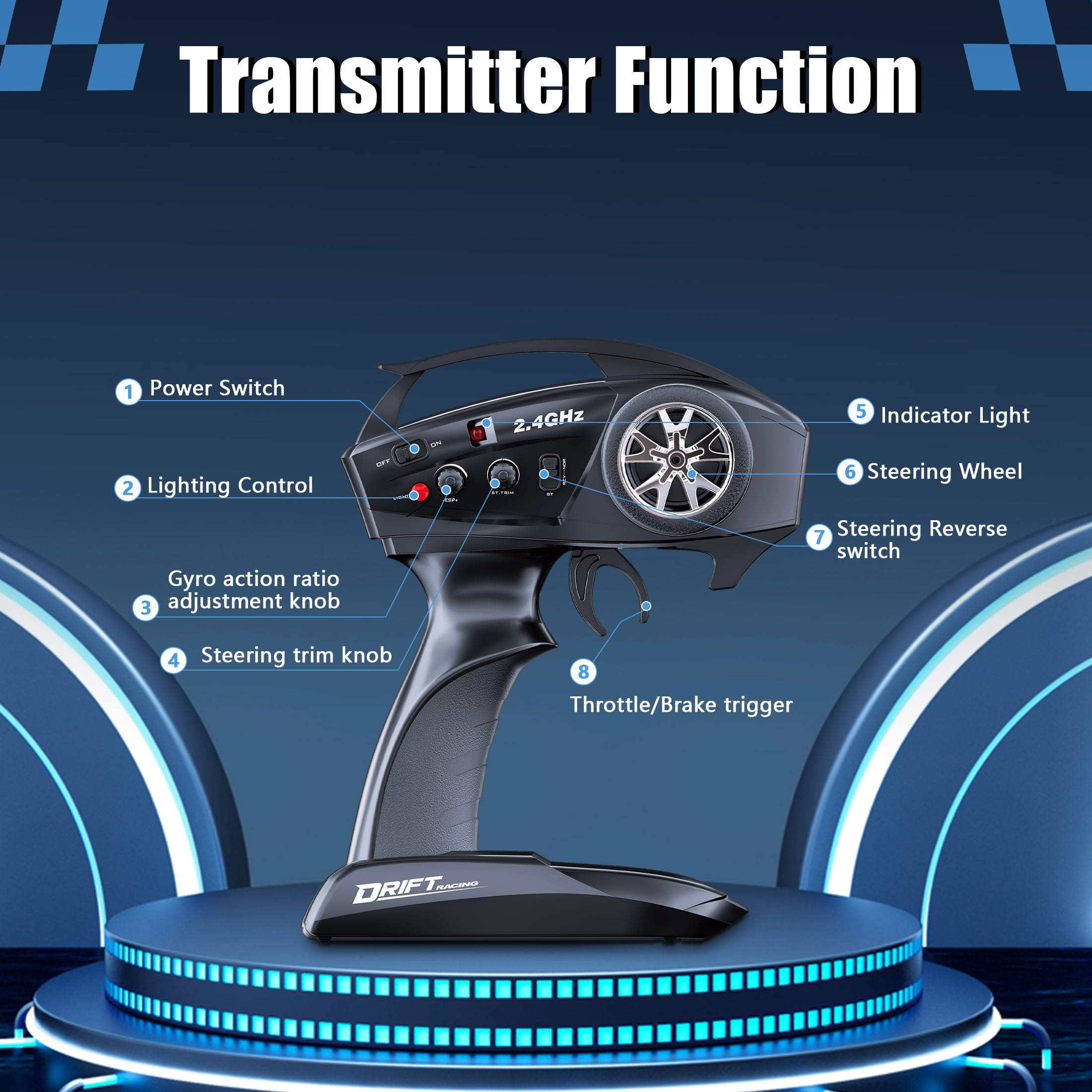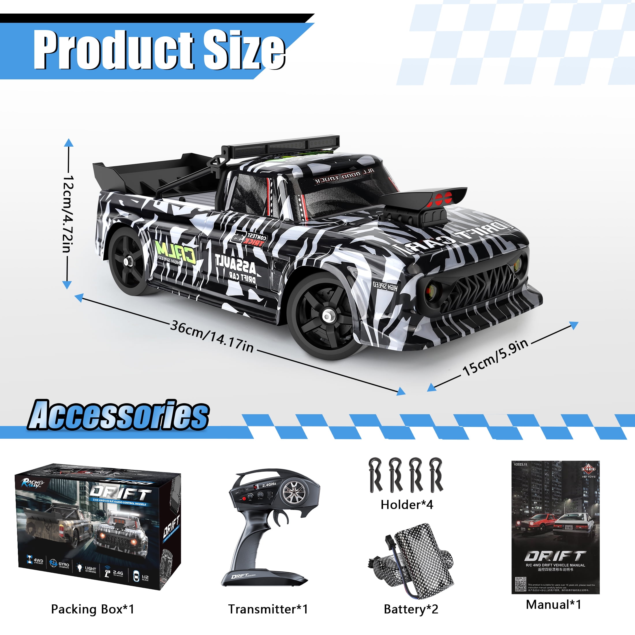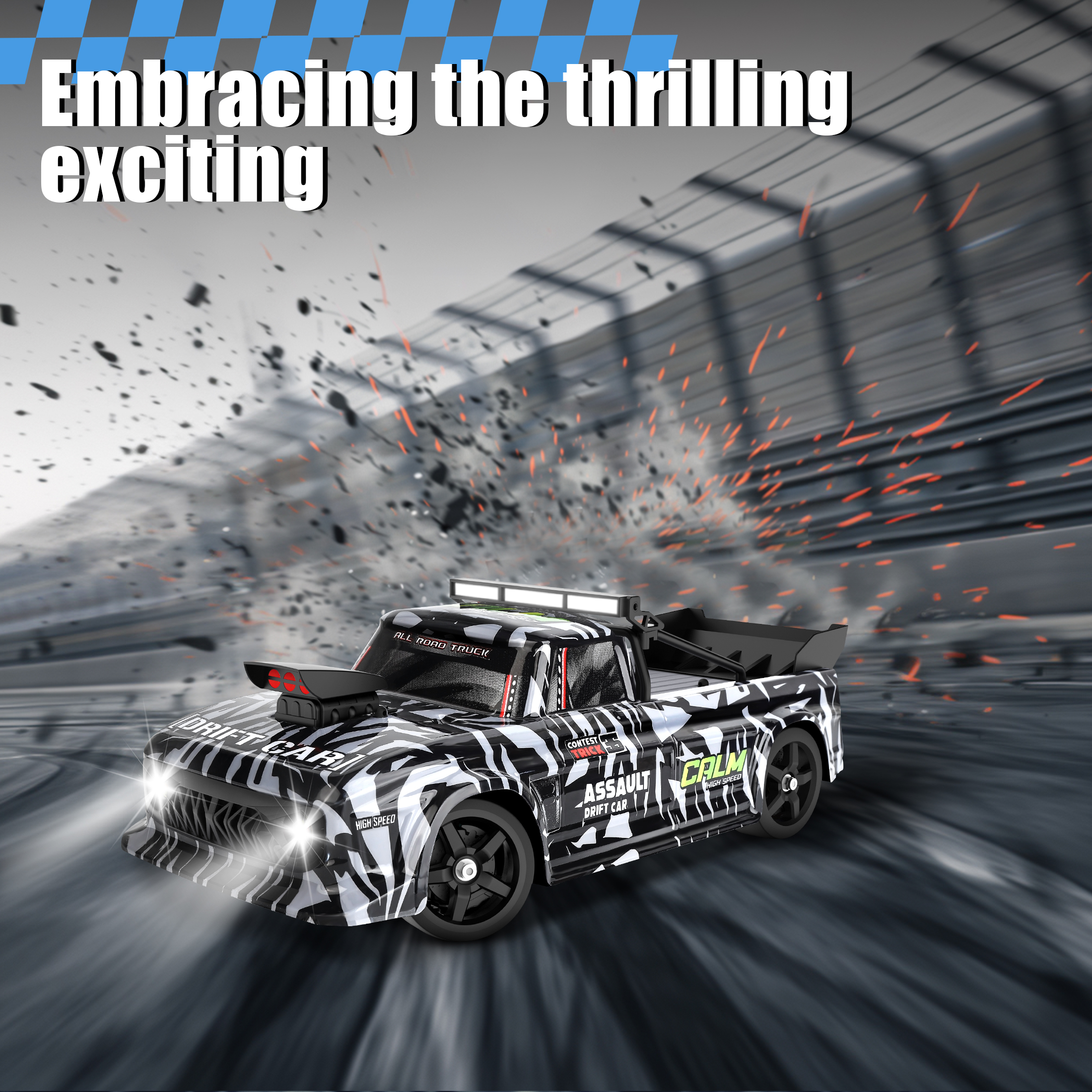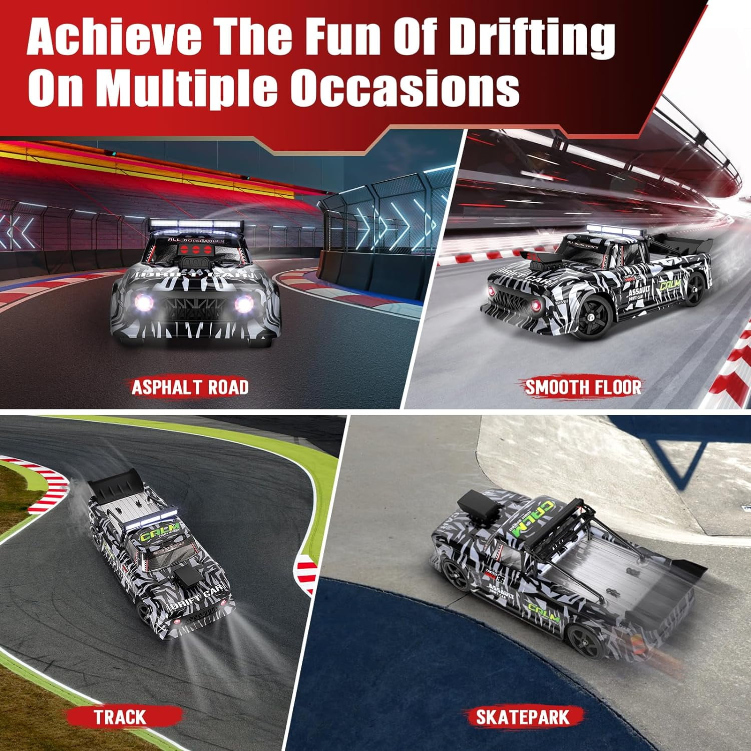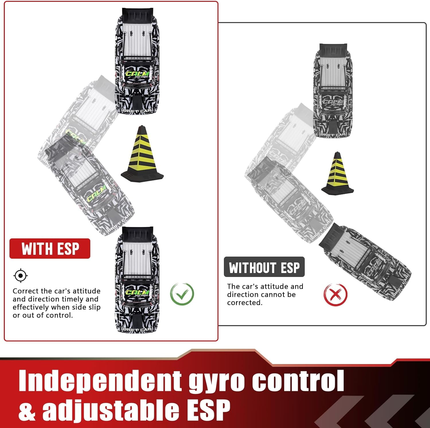 ????【Independent Gyroscope for Control】This remote control drift car features an adjustable gyroscope for high-speed stability and precise steering. Easily flick the rear to achieve impressive drifts and leave others behind. ????【Upgraded Drift Performance】This rc car boasts a 2.4GHz control system and RC390 motor, reaching speeds up to 35+ km/h (21mph). Metal bearings and anti-collision housing ensure durability during high-speed drifts. ????【All-Terrain Tires】Equipped with adaptable drift tires, this car conquers various surfaces from asphalt to dirt. Four lighting modes add cool effects, and transmitter-controlled lights allow for personalized settings. ????【Ultra-Sturdy Construction】Built for intense drifting, it features a wearable chassis, strong metal support, and metal gears. Sixteen ball bearings ensure smooth performance and exceptional durability. ????【Long Battery Life】Enjoy extended drifting time with two lithium batteries, providing up to 40 minutes of runtime. This high-speed RC car is perfect for racing fans and makes a great gift for any occasion.