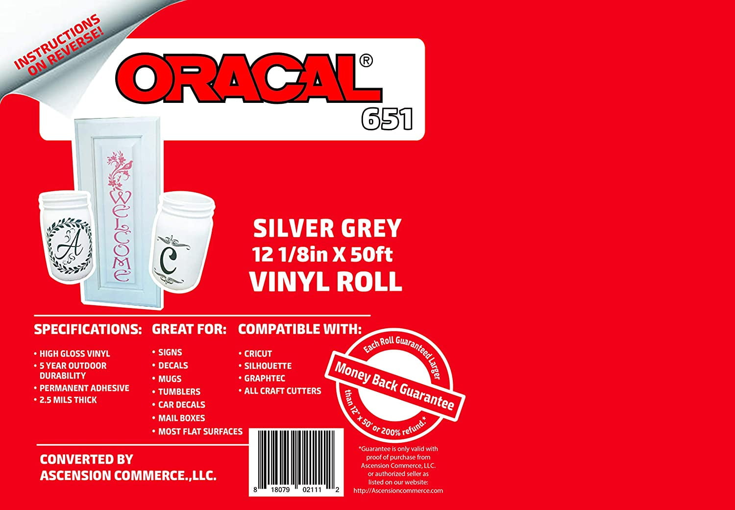 High quality Oracal 651 Craft Vinyl Roll Perfect for Crafting Oracal 651 vinyl is perfect for your crafting needs. Oracal film is compatible with all craft cutters, including the Cricut, Silhouette, Xyron, Craft ROBO, Graphtec, and more. It is a intermediate calendared vinyl, measuring at 2.5 mils in thickness. Manufactured in the United States, this is a high quality vinyl with consistent results. Easy to weed and durable, Oracal 651 is ideal for use on tumblers, window decals, car decals, signs, stencils, scrapbooking, or any other permanent application with a semi-smooth surface. The repositionable, pressure-sensitive adhesive means the media can be moved during a dry application and lightly repositioned it until it’s just right. This vinyl has a gloss finish that truly stands out from the competition. Features The vinyl comes on a 2.5″ diameter core, making for easy storage and reduced damage during shipping – All rolls are heat sealed Includes full color instruction sheets Finish: Glossy Rated for 5 years outdoor durability Waterproof Handwash safe Compatible with all craft cutters: Cricut, Silhouette, Xyron, Craft ROBO, Graphtec, and more Adhesive: Solvent-based, Permanent Roll Size: 12″ x 50′
