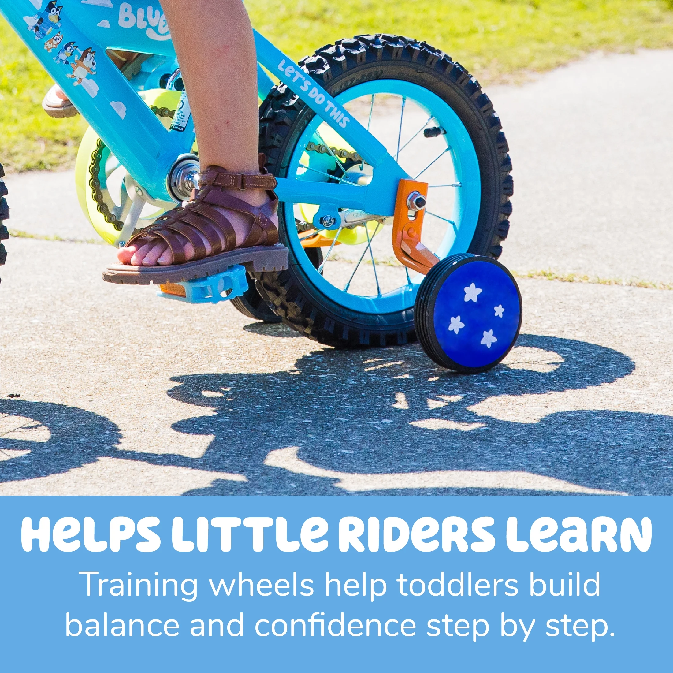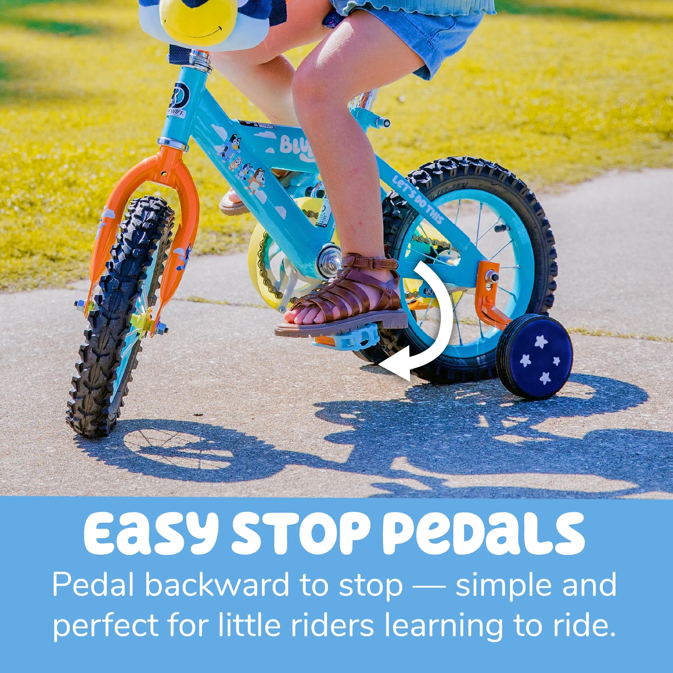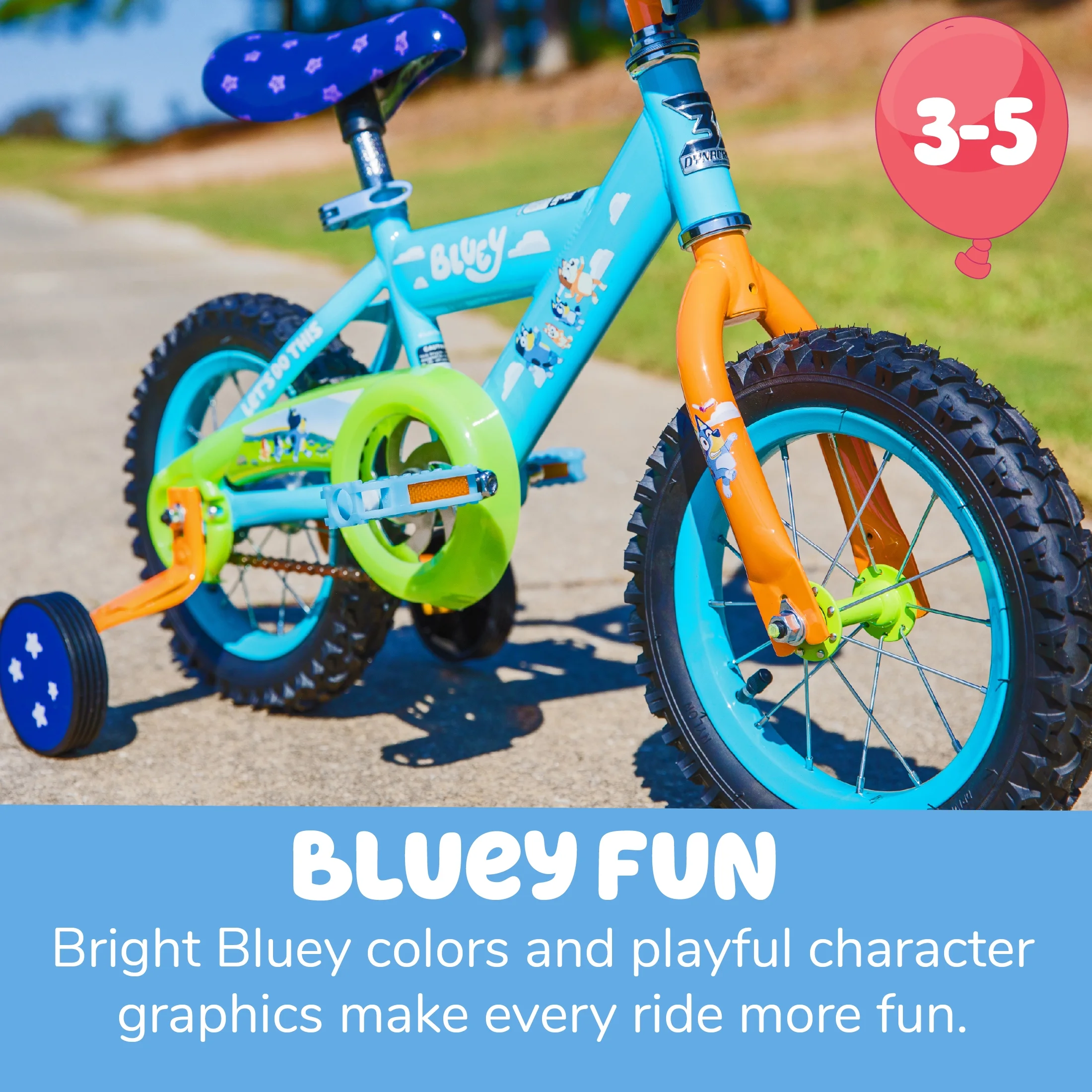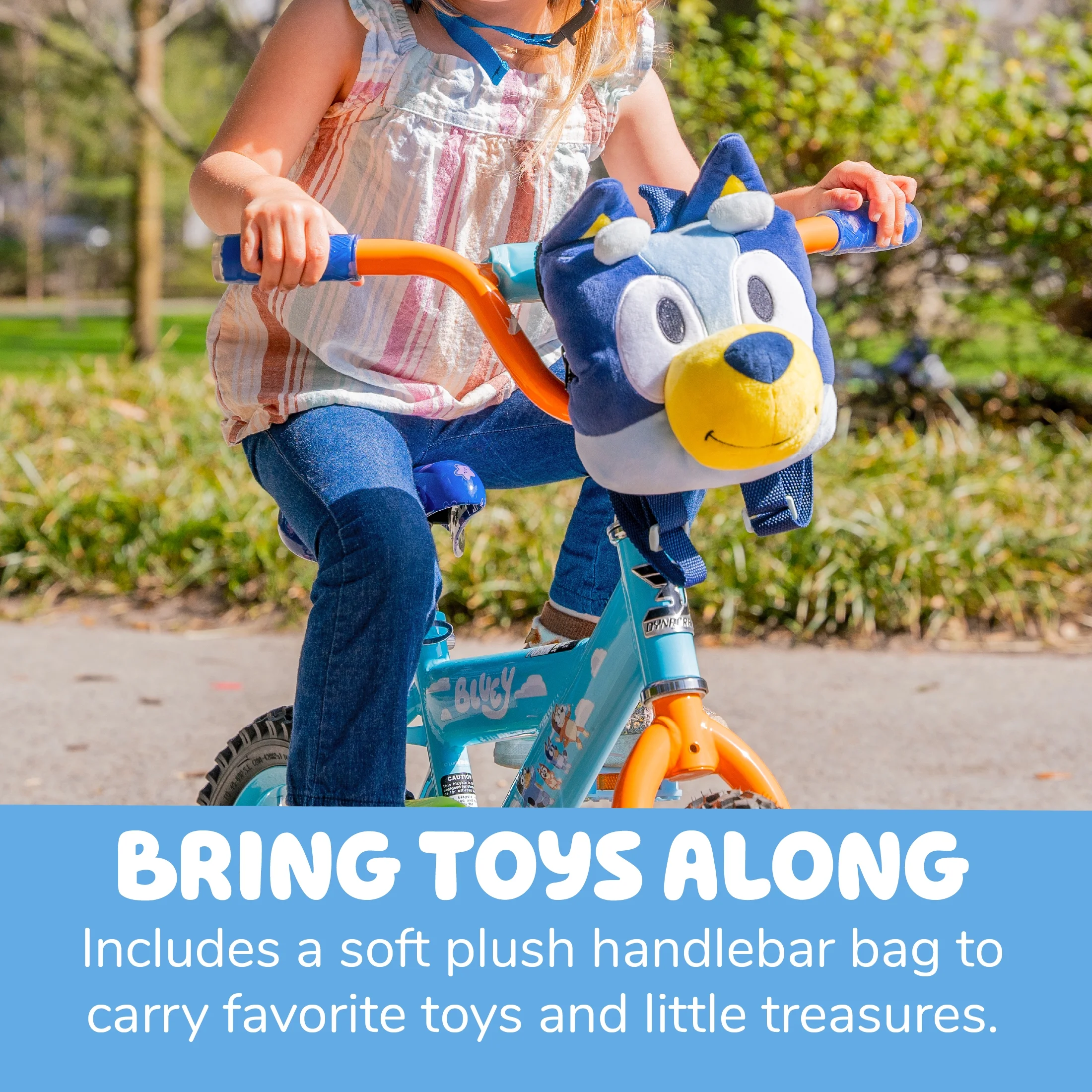 Imagination Encouragement: Designed to inspire creativity in kids ages 3-5 years. Exclusive Accessory: Comes with a Bluey plush bag attached to the handlebars for carrying toys and treasures. Custom Graphics: Features bright and fun Bluey-themed graphics. Deluxe Paint Finish: Ensures the bike maintains its attractive appearance over time. Coaster Brakes: Provides easy and safe stopping power suitable for young riders. Build Quality: Crafted with care by Dynacraft for durability and functionality. Target Audience: Ideal for young Bluey fans ready for adventure.