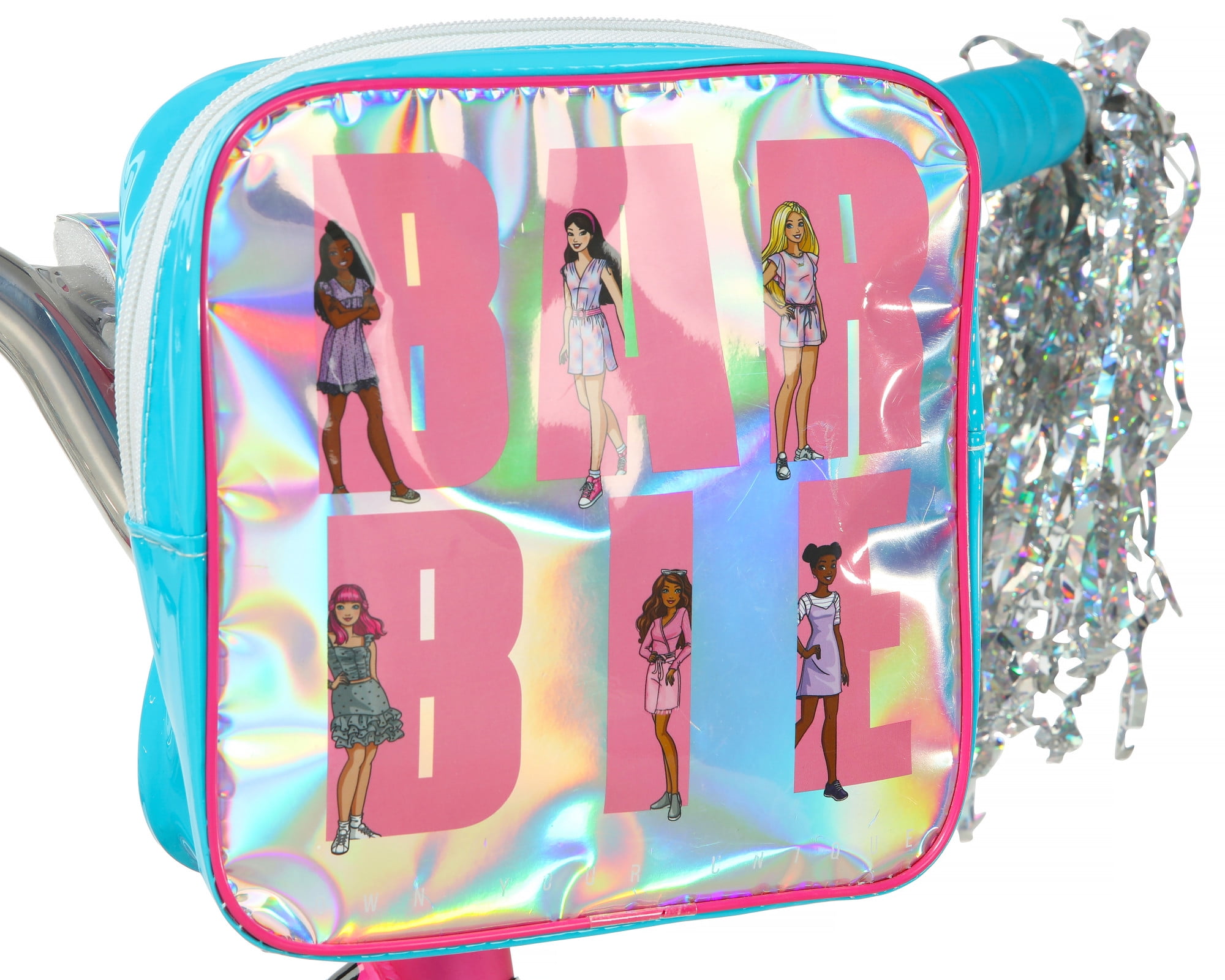 Removable handlebar bag for Child Custom Barbie graphics Shimmering streamers Rear coaster brake Alloy quick release seat post for your Girl Adjustable and removable training wheels Lifetime warranty on Frame and Fork