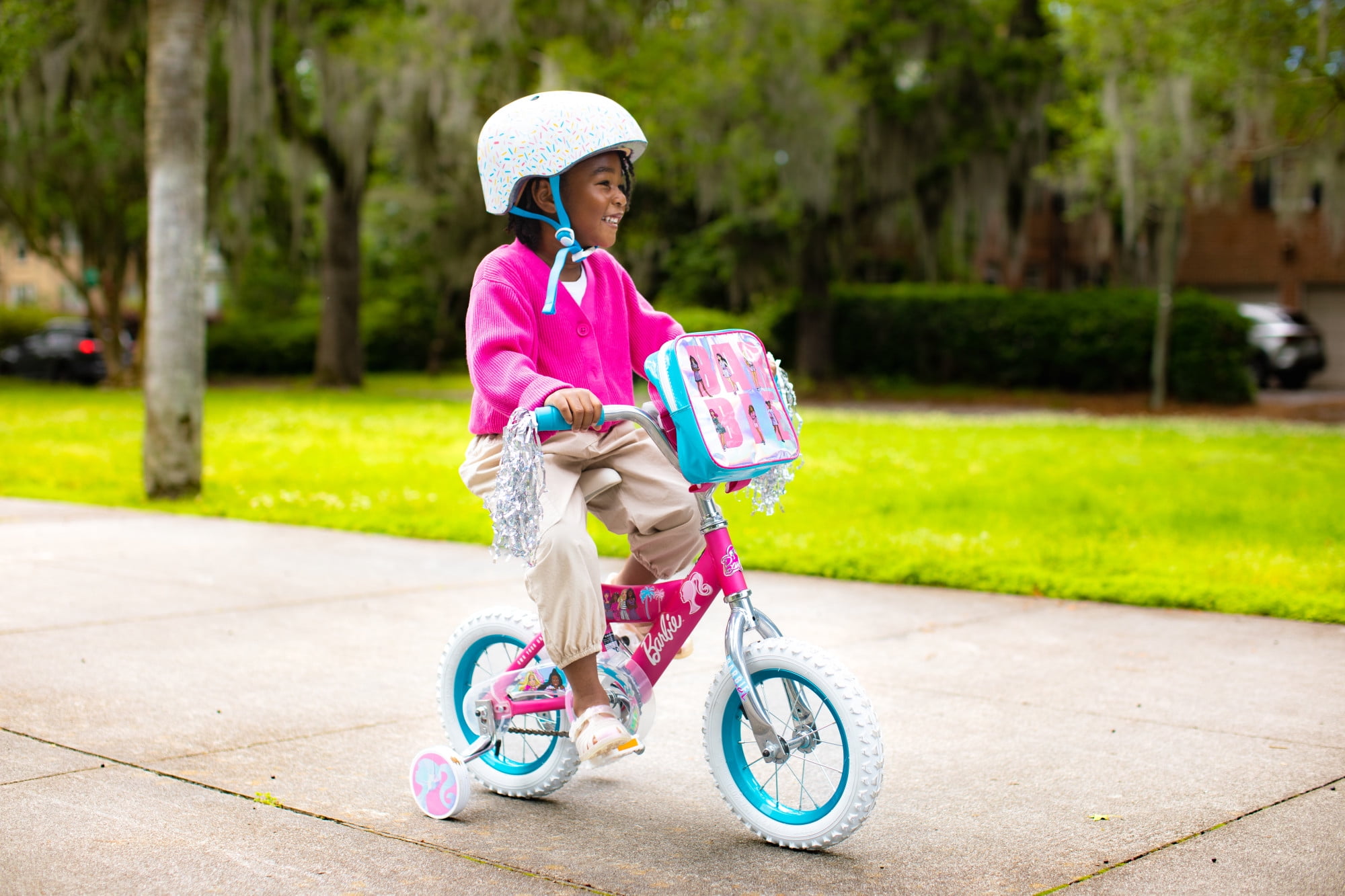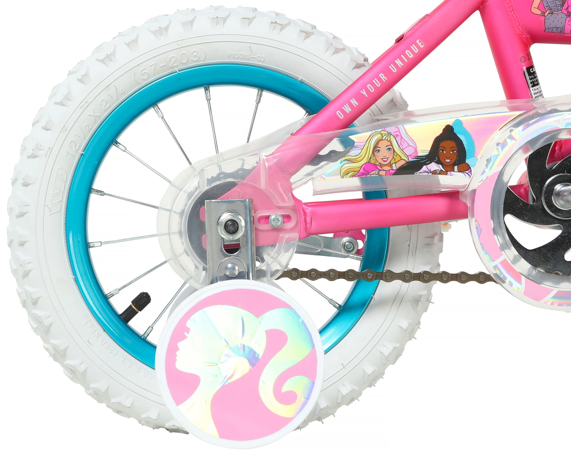The 12-inch Barbie Girls Bike by Dynacraft is bringing all the fashionable Malibu vibes. The Barbie friend group runs deep, so your little one will feel like part of the crew as she rides this beautiful bike featuring Barbie and her friends on the frame and handlebar pad. With a chic, iridescent handlebar bag, she can store her favorite accessories and ride confidently around the neighborhood. The classic “Barbie Pink,” yellow, and blue details make for an enticing color combo; while the inspirational catchphrase, “Own Your Unique” printed throughout the bike keeps young riders feeling self-assured. The vibrant, stylish designs featured throughout the frame, chain guard, and training wheels add some extra fun to this trendy children’s bike. Accessible features such as easy-to-control coaster brakes and an adjustable seat post make this a great option for kids just learning to ride. Live fabulously like Barbie on the 12-inch Barbie Girls Bike!