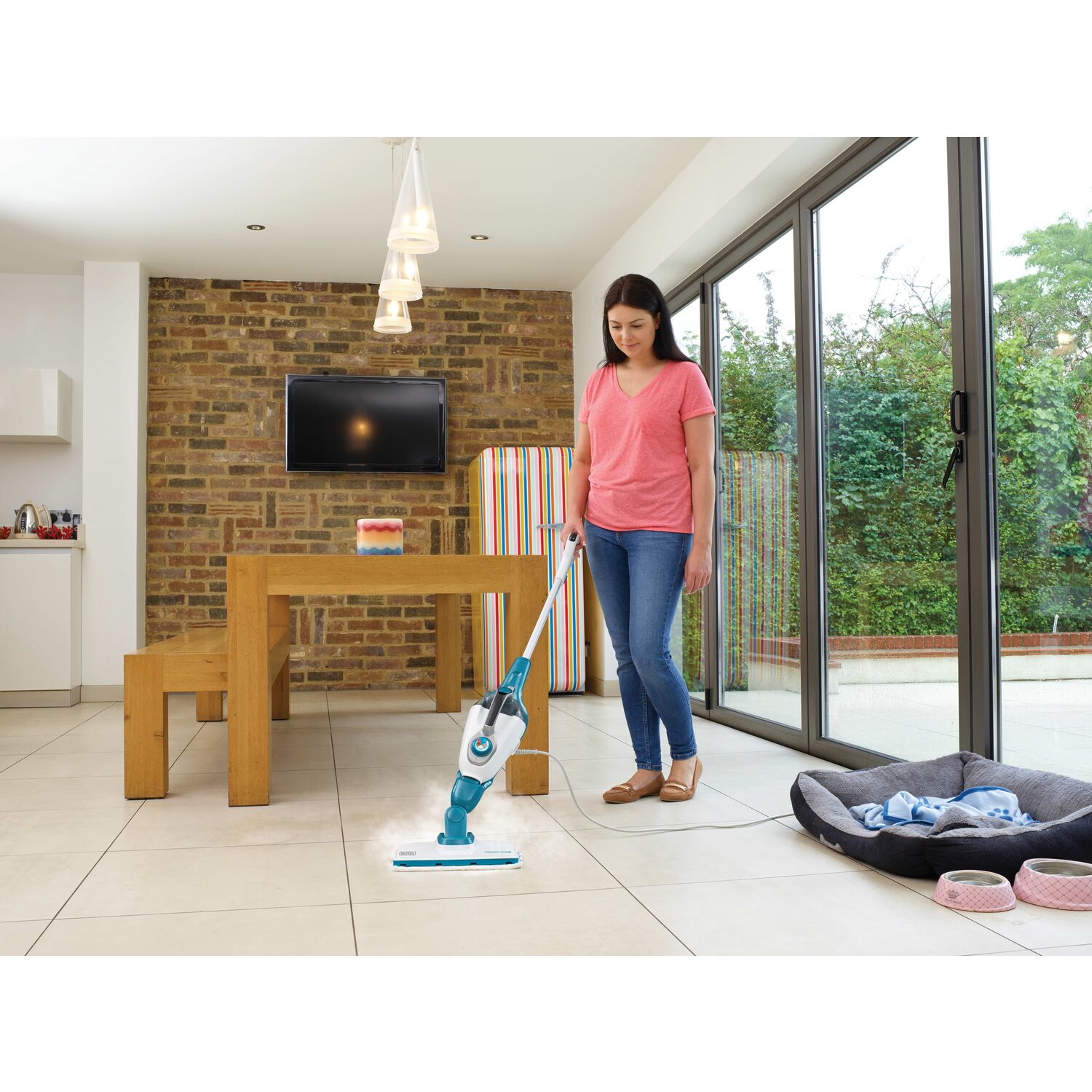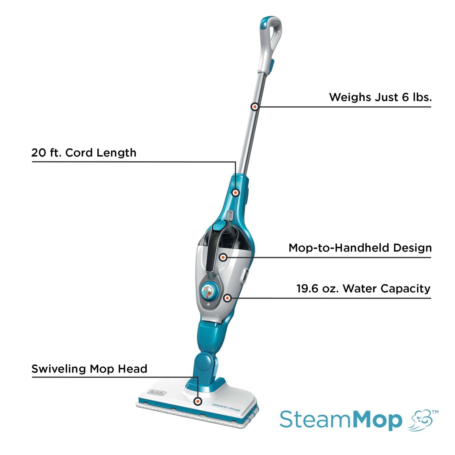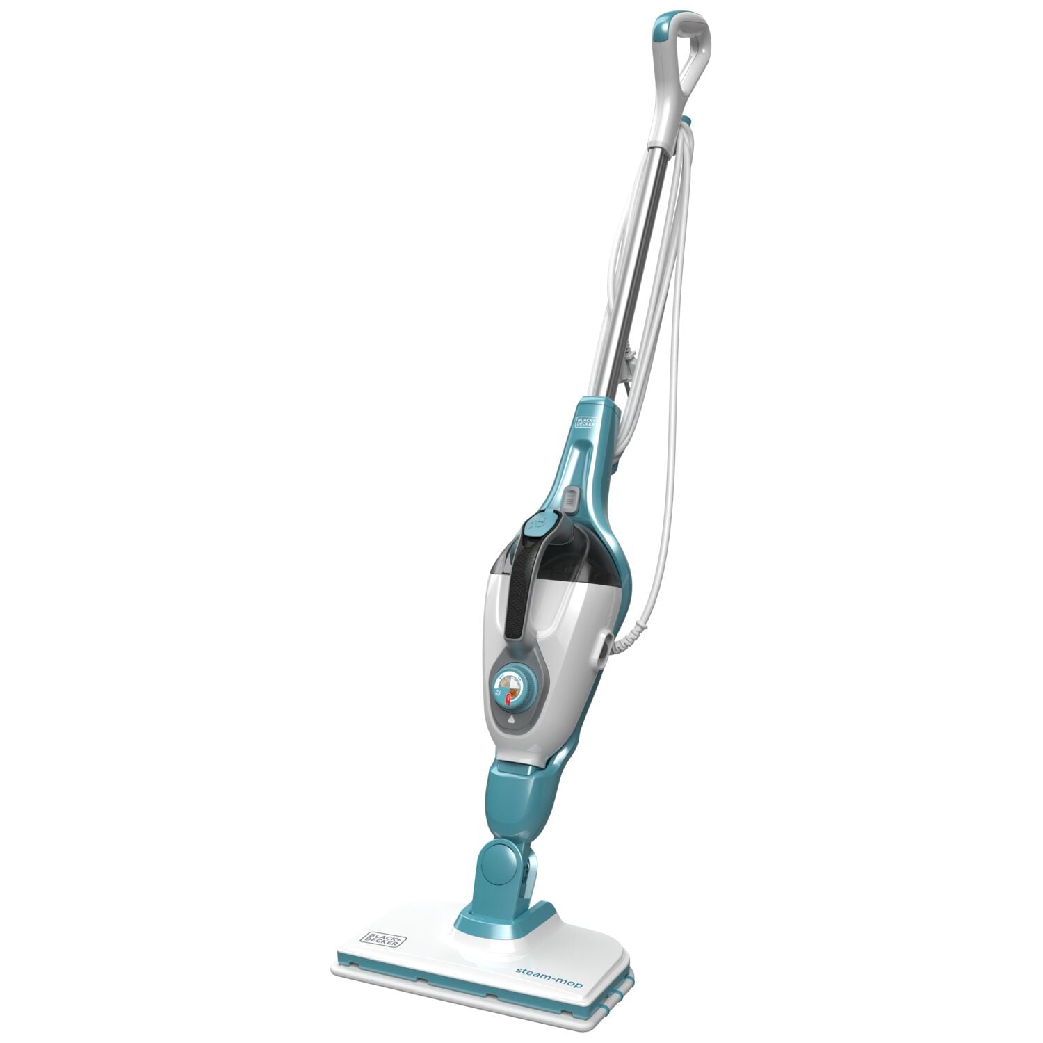 Harness the cleaning power of steam with the BLACK+DECKER® 5in1 Steam-Mop. Simply plug it in and it’ll be ready to go in just 20 seconds. The versatile design lets you use it as a mop or handheld steamer for maximum portability, even when going up and down the stairs. The swiveling mop head allows for effortless maneuverability around objects and access to cramped spaces. Clean a variety of surfaces in your home and remove stuck-on dirt and grime from sealed hardwood floors, grill grates, and glass shower doors, around faucets, within sealed grout lines, and more. The Steam-Mop’s large-capacity water tank helps ensure you won’t run out before the job is done. Plus, it’s equipped with SmartSelect variable steam control technology, so you can easily regulate steam for the task at hand. And the steam always flows continuously without needing to hold down the trigger. Multiple interchangeable attachments and accessories help you take on a variety of cleaning to-dos.