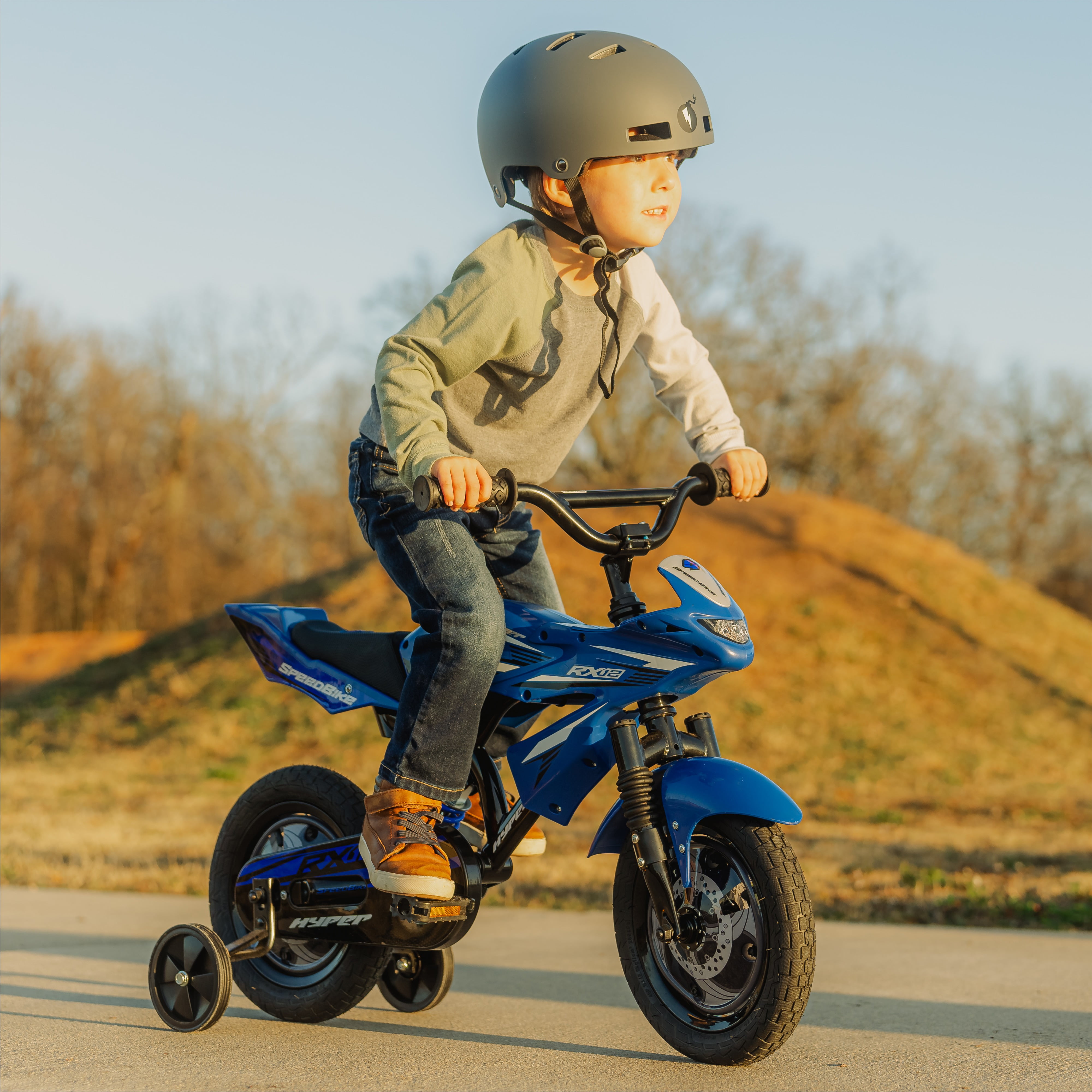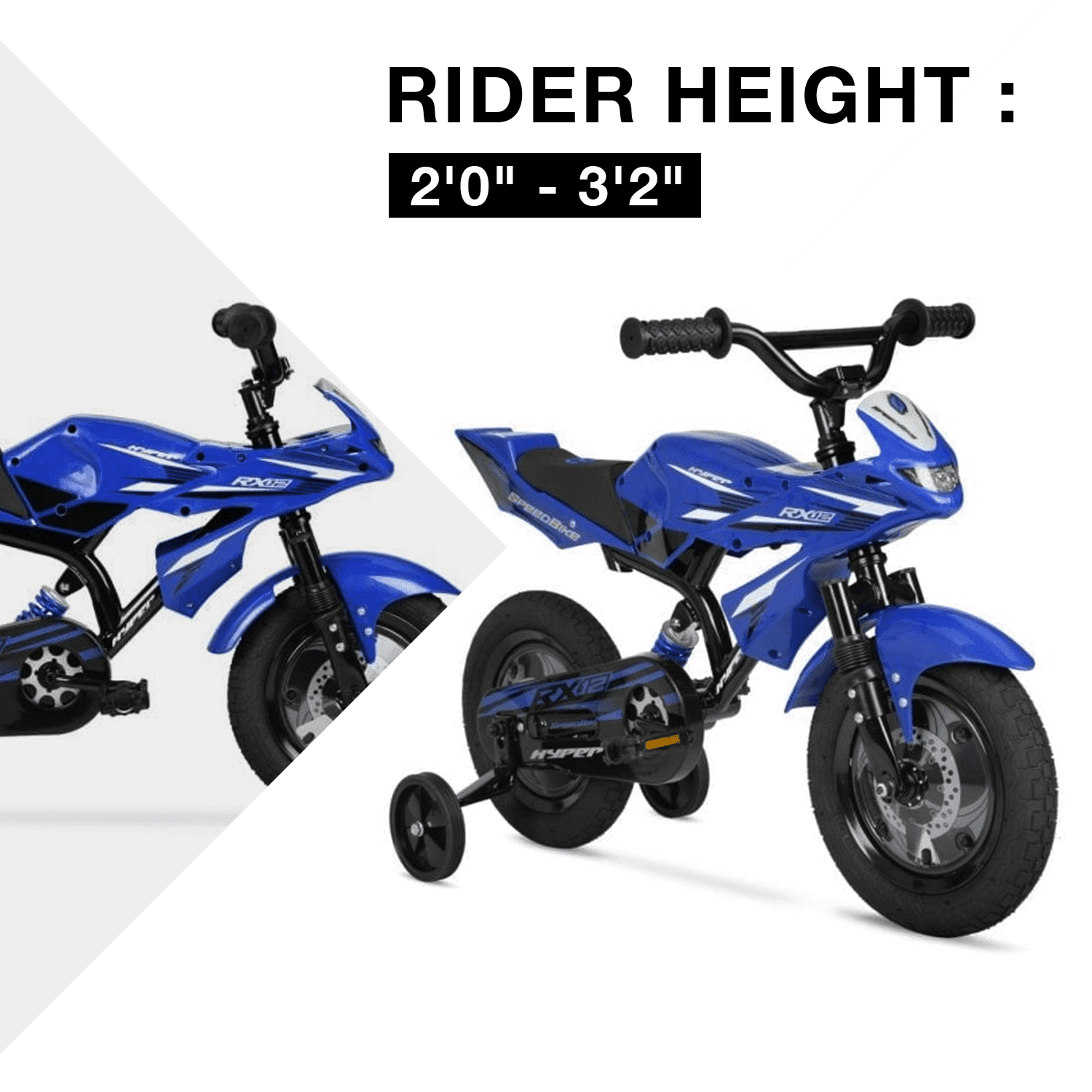 Superbike style fenders and saddle 12-inch Child’s bike Multi-surface tires Authentic Hyper graphics Rider Height: 2’0″ – 3’2″ Max Weight: 75 lbs Bicycle Wheel Diameter: 12″ Bicycle Frame Size: 12 in Number of Speeds: 1 Speed Character Group: Speed