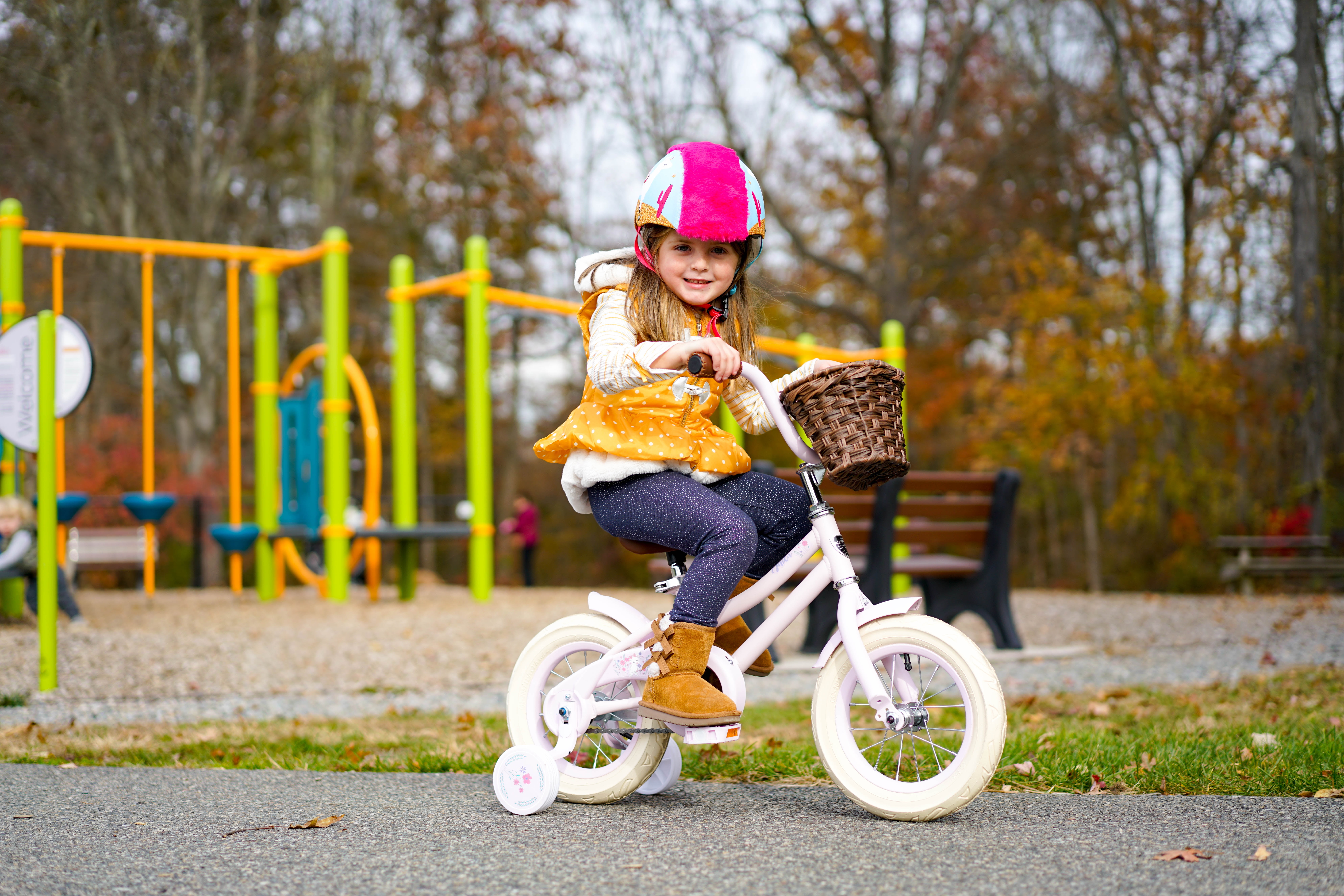 The Kent 12″ Mila bicycle comes with a basket in the front and is reminiscent of an adult cruiser style bike because of the brown seat, brown grips, traditional brown color basket, and super cute cream color tires. This cute little steel frame bike also has front and rear fenders, color-matched pink wheels, a quick release seat-post, BMX style handlebars, and removable training wheels for added convenience.