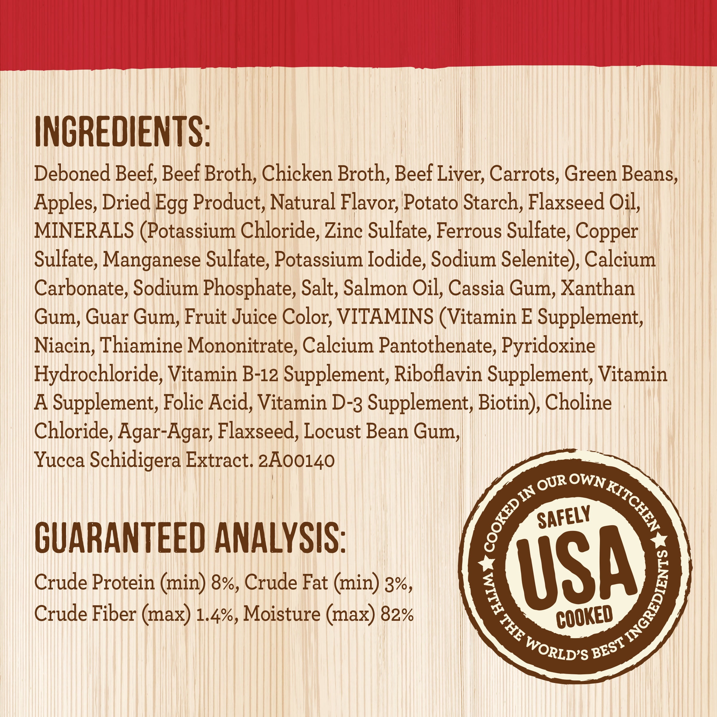 The first ingredient in Merrick Grain Free Wet Dog Food, Cowboy Cookout Canned Dog Food is real USDA-inspected deboned beef. This real meat dog food grain free recipe also contains carrots, green beans and granny smith apples, to lend wholesome goodness and variety for a healthy dog food menu. A savory gravy made with beef broth adds even more flavor and moisture to daily meals in this grain free dog food. This wet food for dogs features deboned beef and vegetables, and contains no artificial colors, flavors, preservatives or by-products. Use this moist dog food canned recipe as a topper for your dog’s dry kibble, or serve this canned dog food as a nutritious standalone meal. Merrick wet dog food comes in a convenient pull-tab can that makes preparing your dog’s meal quick and easy. Merrick dog food recipes are crafted in our Hereford, TX kitchen.