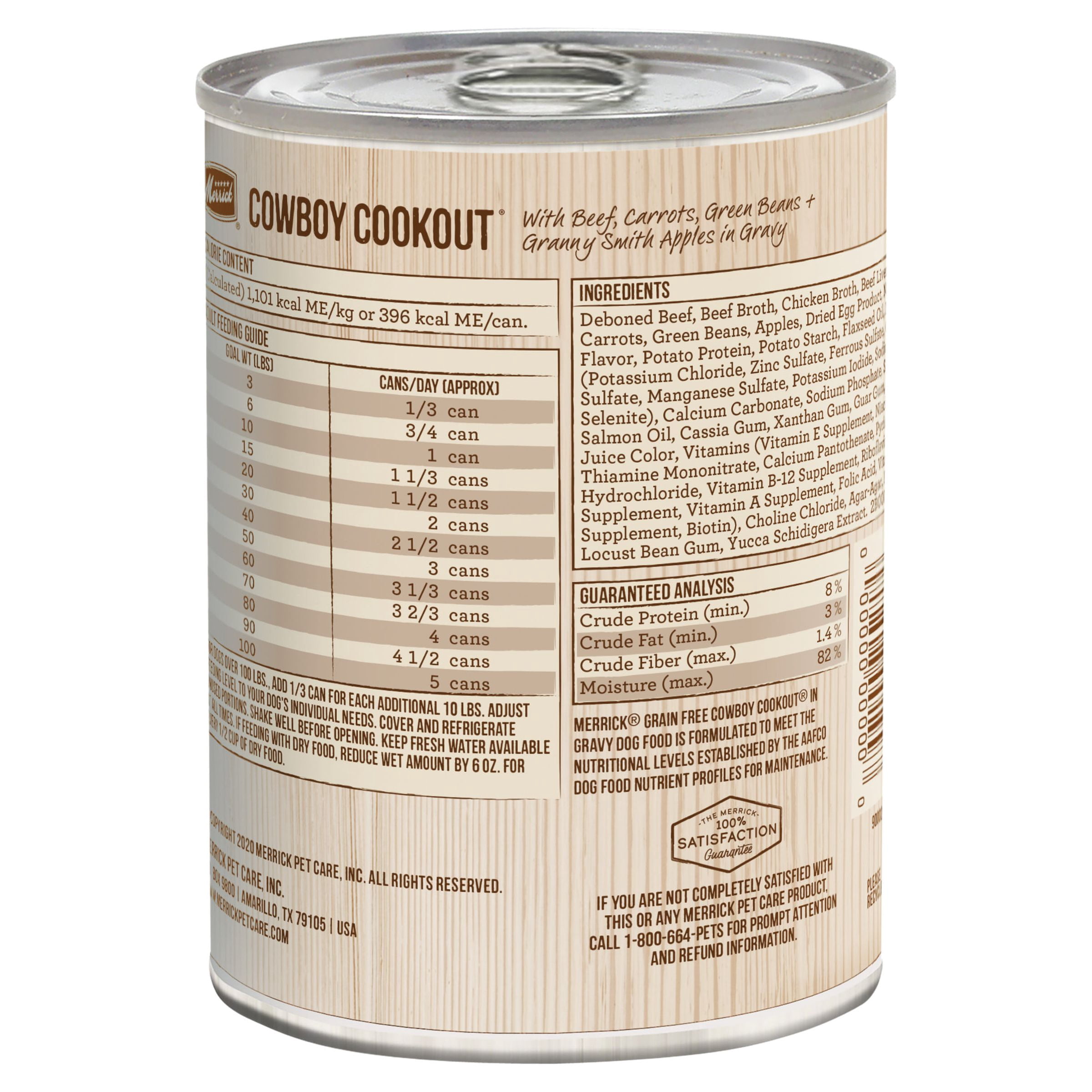 Merrick Grain Free Wet Dog Food, Cowboy Cookout Canned Dog Food Real deboned beef is the first ingredient in this healthy dog food recipe This grain free dog food also contains carrots and green beans Merrick dog wet food recipes are made without artificial colors, flavors, preservatives or by-products This natural dog food can features a pull-tab for easy opening and fast serving of this can dog food wet recipe