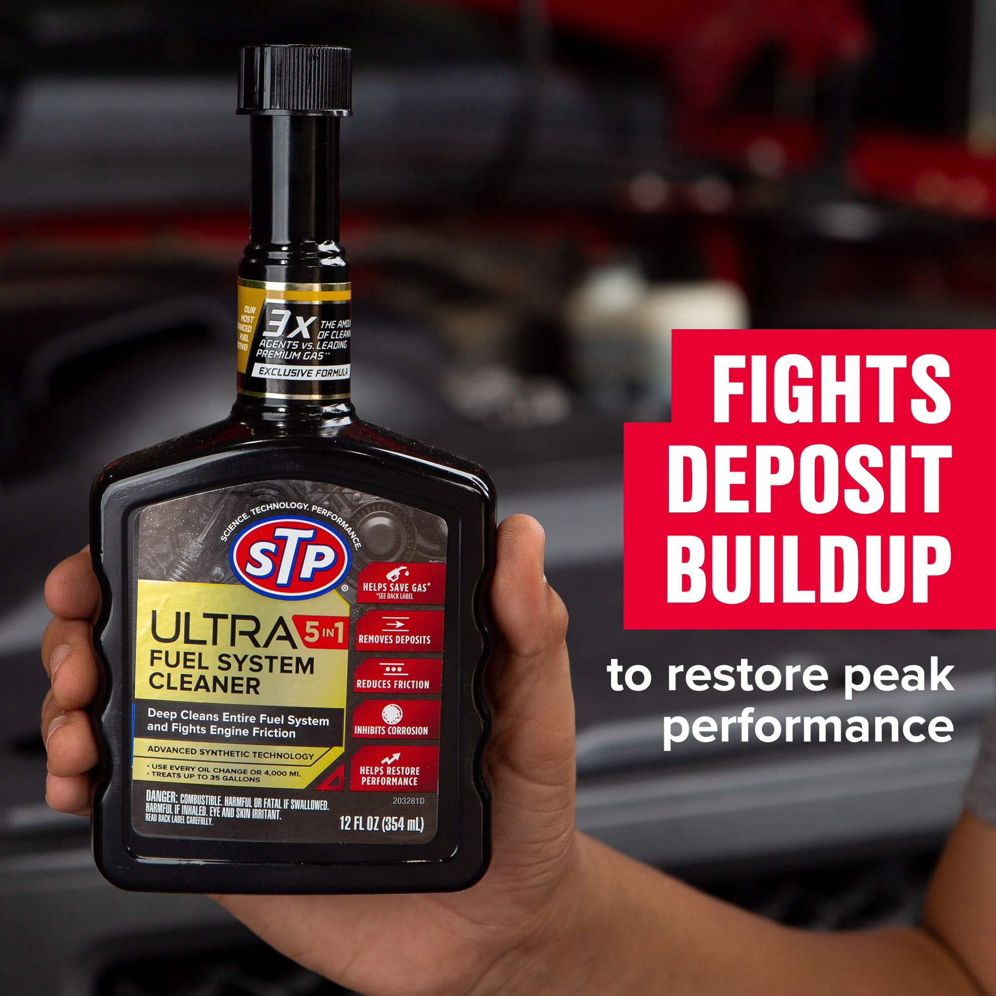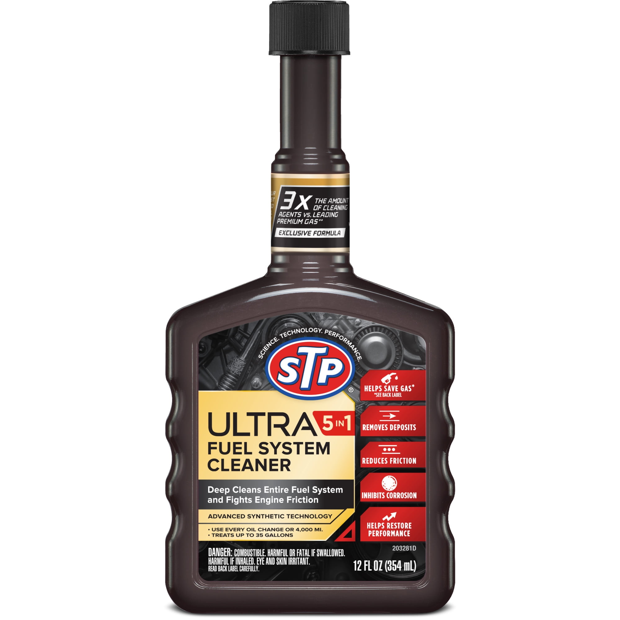 One 12 oz bottle of STP (R) Ultra 5 in 1 Fuel System Cleaner deep cleans entire fuel system Features a blend of PEA and PIBA detergents to help remove harmful deposits and fight engine friction in any gasoline engine 3x the amount of cleaning agents compared to the leading premium gasoline (1) STP (R) Ultra 5 in 1 Fuel System Cleaner helps you save gas by keeping your vehicle’s fuel intake system clean Pour the entire bottle of fuel treatment into a vehicle gas tank that is at least half full Use STP (R) fuel additive every 4,000 miles for best vehicle performance Treat Rate: 12 FL. oz. bottle treats up to 35 gallons of gasoline