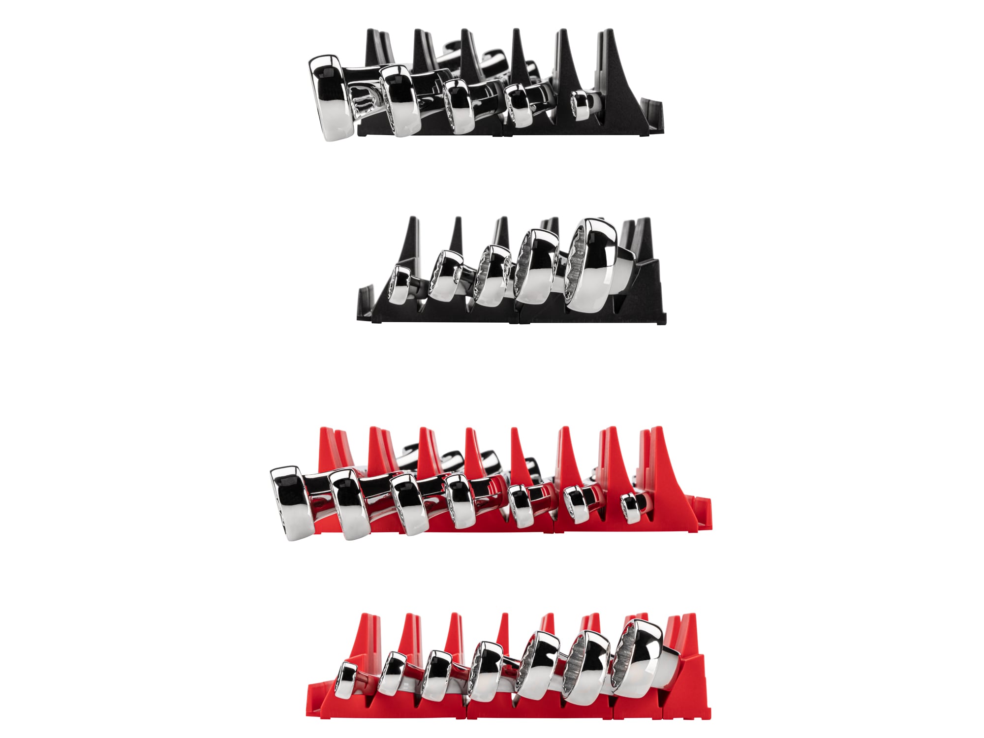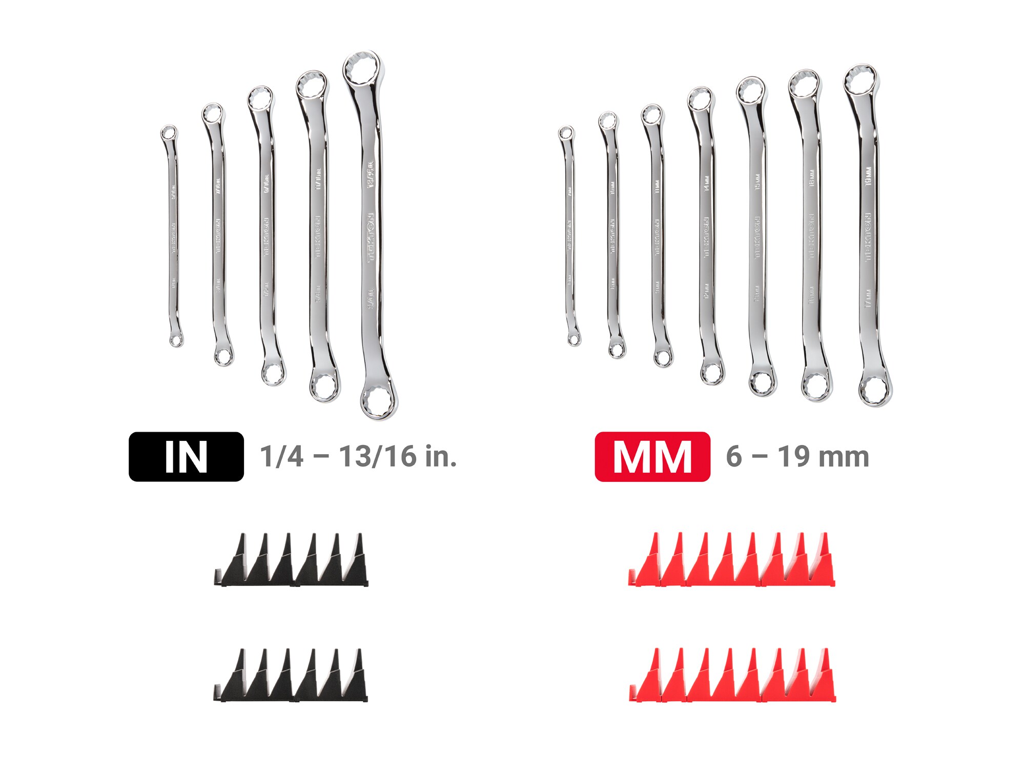 Tekton offset box end wrenches have 45 degree offset box ends, creating clearance for your fingers and making it easier to reach around obstructions. The 12-point box ends fit multiple types of fasteners including 6-point, 12-point, and square. Radiused corners in the box ends apply force to a fastener’s flat sides, rather than its corners, preventing fastener round-off. Each wrench is permanently marked with a stamped marking for easy size identification. The wrenches are made from 6140 chromium-vanadium steel and are heat-treated to 42–48 HRC. Chrome plating on the wrenches provide resistance to corrosion. This set includes a modular wrench organizer that fits most toolbox drawers, keeping your wrenches neatly arranged with consistent spacing.