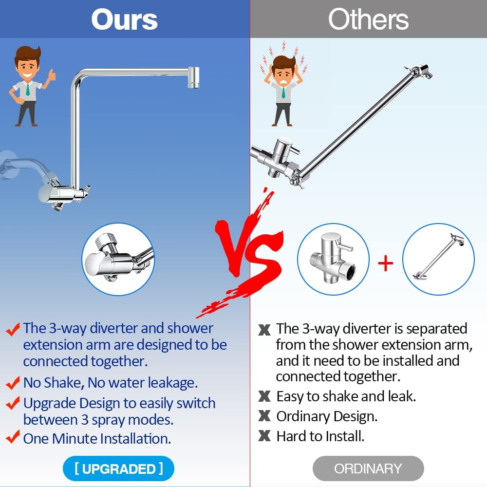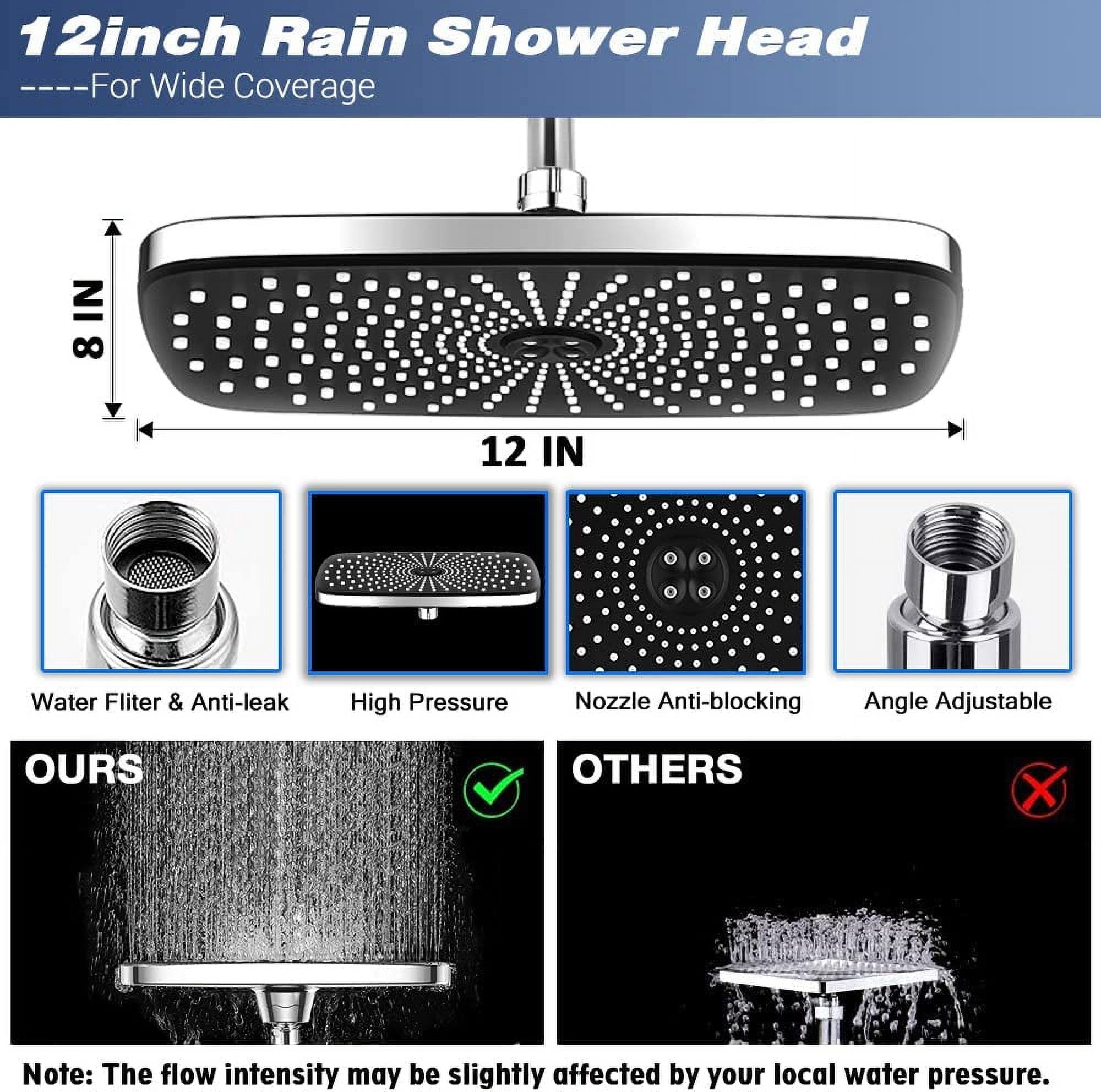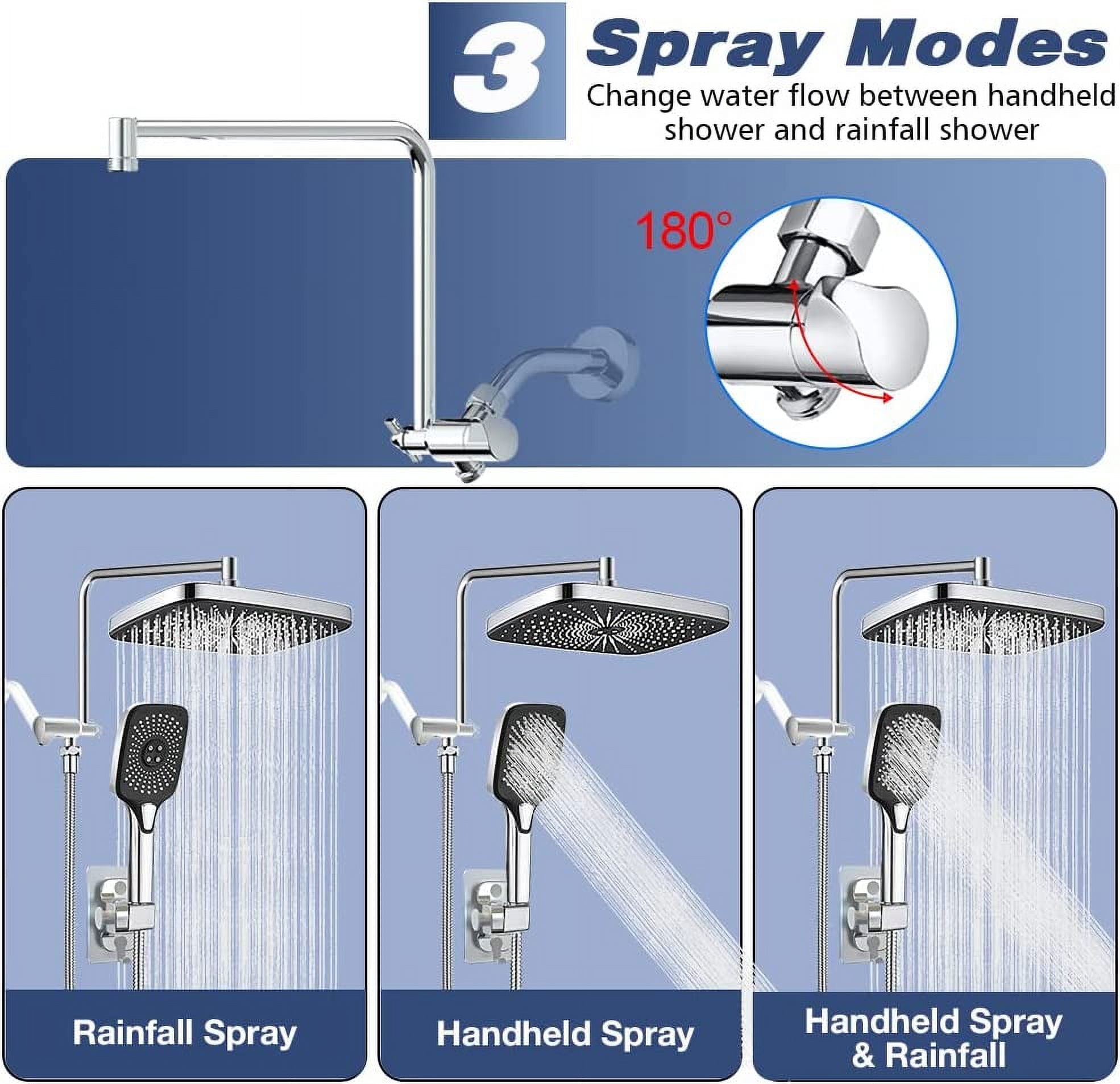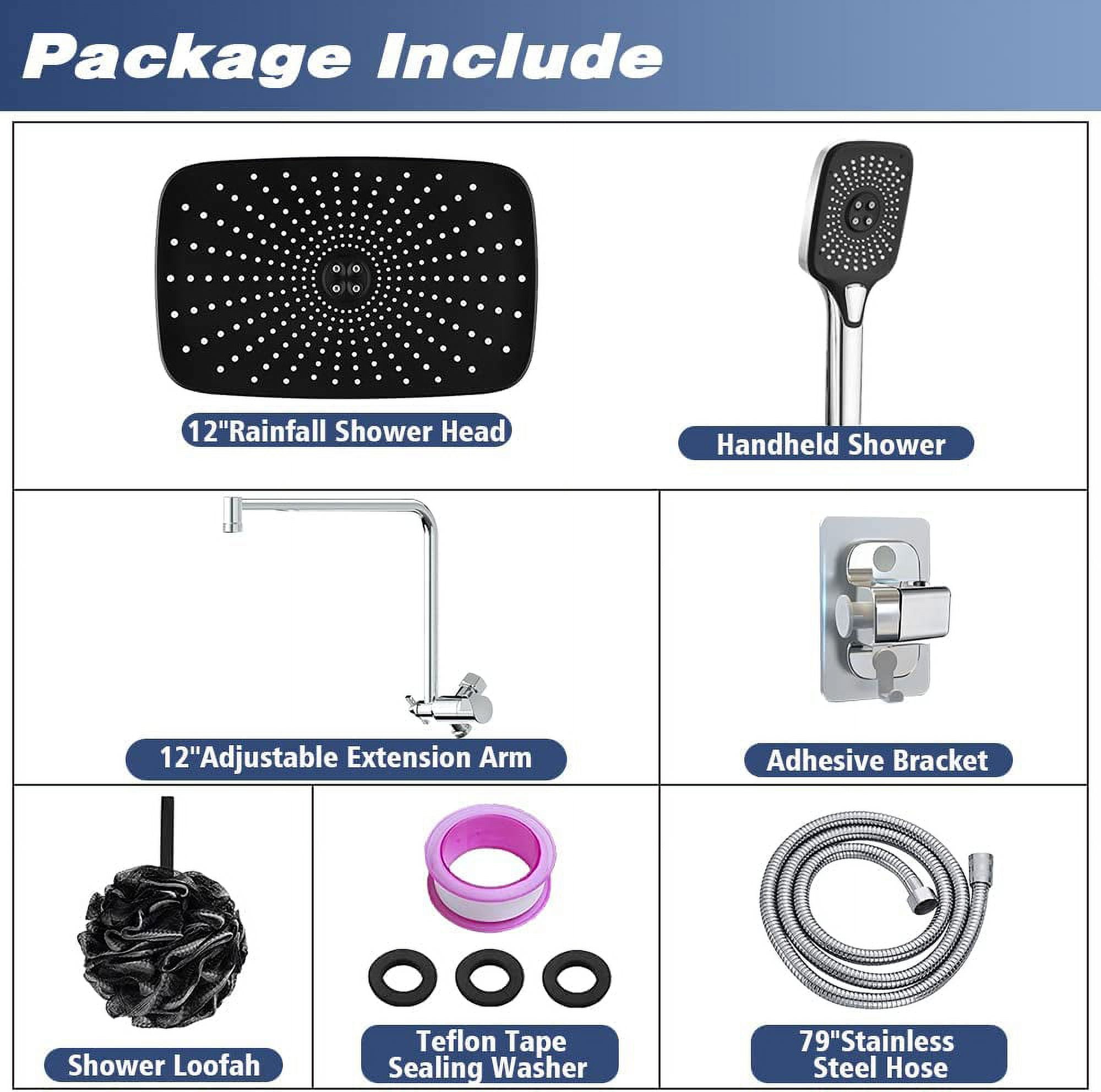 【Shower Head Combo】- If there is any issues with shower head, be free to contact us first so we can help to fix it asap. The combination of 12″ rectangle shower head with handheld shower head, 79 inch shower hose and shower head holder allows you to choose different bath experiences at any time, with upgraded L-shaped shower head extension arm to prevent water leakage and high rise your shower head. 【Upgraded 12″ Shower Head Extension Arm】-New upgraded! The shower extension arm is integrated with the 3 way shower diverter to prevent leaking and shaking. Reduce installation steps of shower head combo and make the entire hand shower combination more stable. The shower head arm extension is made of sturdy brass and stainless steel. Unique L-shaped designs enhances its bearing capacity, high rise your shower head, and can achieve vertical water. 【Premium Waterfall Showerhead】- 12 inch large rain shower head, full body coverage waterfall showerhead.The rainfall shower head body is made of high quality ABS, lightweight, durability, and long service life. Deliver a high pressure stream of water and the angle and height are fully adjustable. The perfect affordable rainfall shower head for any shower or tub! 【4 Settings Handheld Shower Head】- High quality ABS hand held shower head, comes with 4 different spray modes, including:Power Rain, Pulsating Massage, Rain, and Power Wash. Suitable for adults, baby, pets and meet different shower needs. 【EASY TO INSTALL】- This shower head combo is very easy to install, no need to call a plumber, just 4 manually tightened connections can be installed in a few minutes. Each product has passed our tests to prevent its leakage and ensure that they can work normally under any circumstances. Showerheads & handheld showers can be used with a shower head/rainfall shower head alone, or with two showers at the same time. The flow intensity may be slightly affected by your local water pressure.