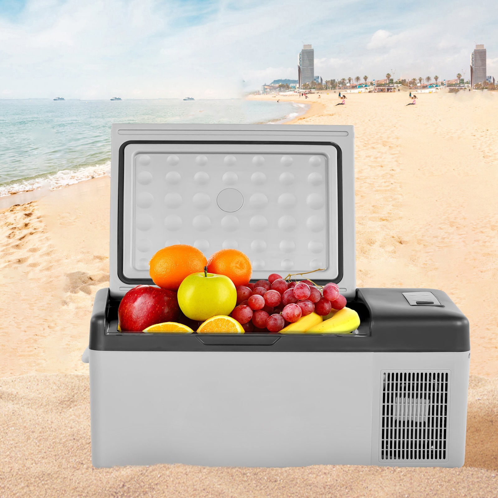 16Qt Car Refrigerator: This superior portable small car refrigerator has a modern appearance with a simple black and silver color assortment; A compact design, digital control panel, and two power cables are ideal for indoor and outdoor fridge use—the perfect choice for you to enjoy fresh food and cold drinks at home or on the journey;; [Package Content] 1 x Car Refrigerator; 1 x DC Power Cord; 1 x Adapter for AC Power; 1 x User Manual