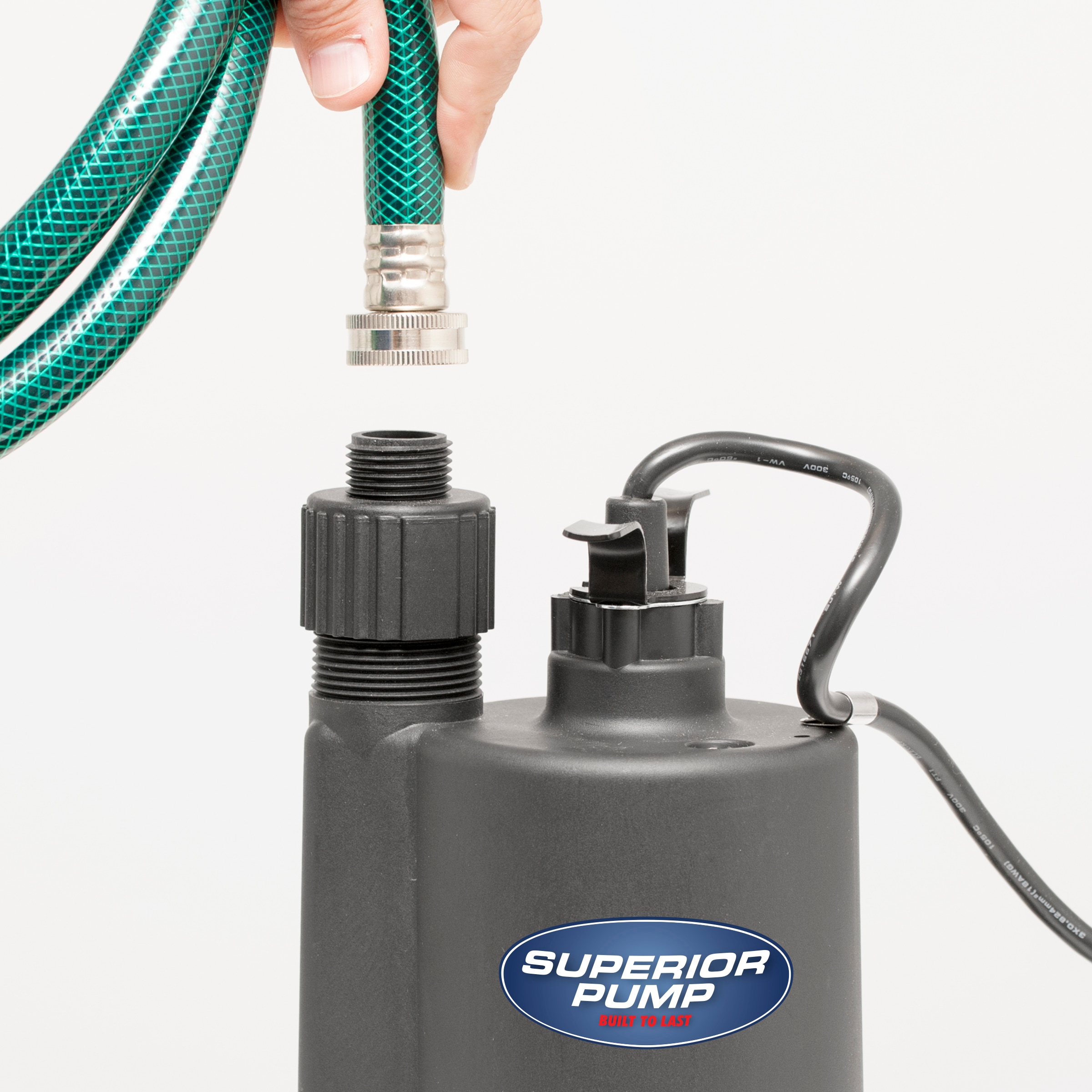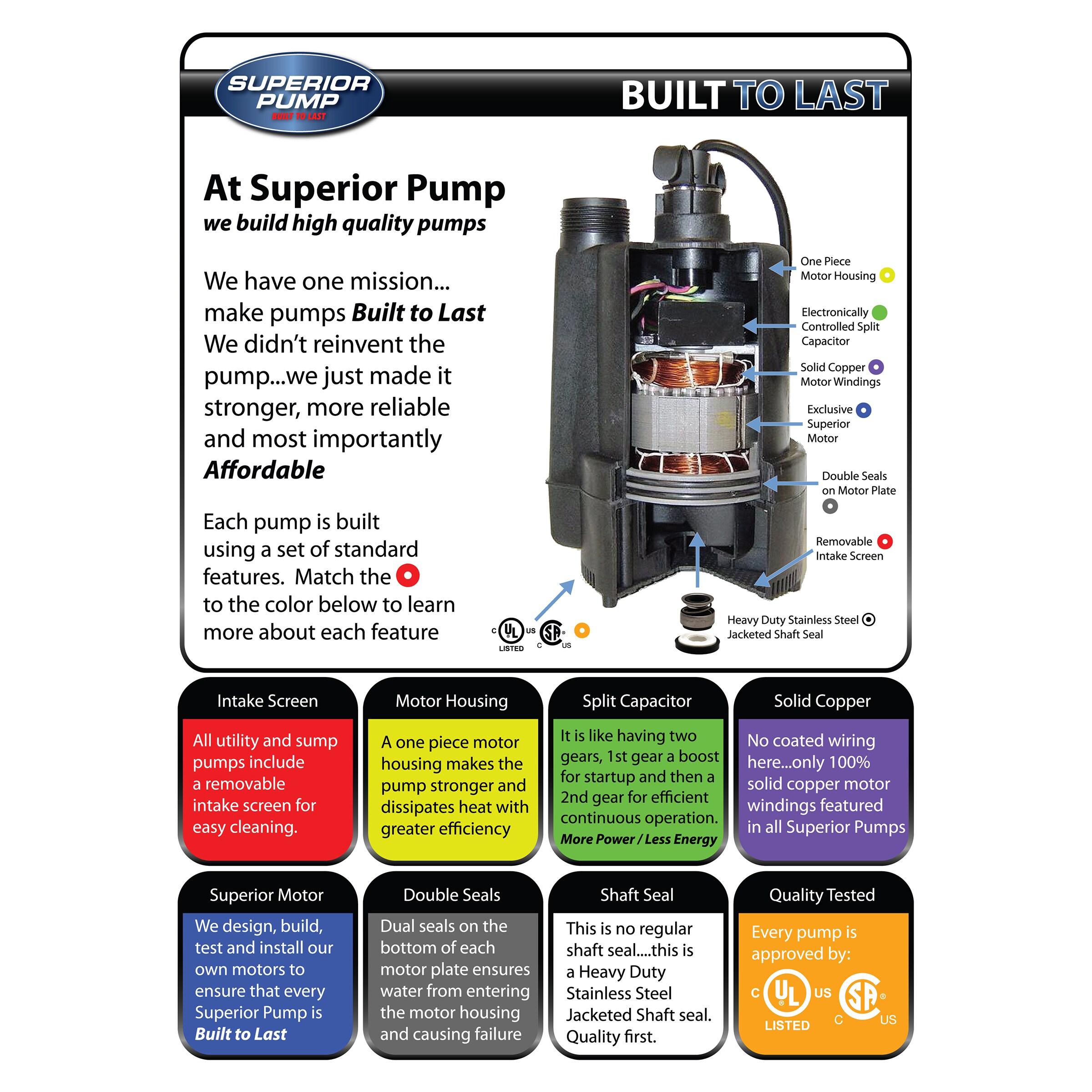 Superior Pump builds pumps that are truly built to last and are 100 percent factory tested. Superior Pump uses quality components including solid copper motor windings, heavy duty stainless steel jacketed shaft seals, double o-ring seals on motor plate, and electronically controlled split capacitors. Superior Pump model 91012, 12 Volt submersible utility pump, will move water up to 1380 gallons per hour. Pump water virtually anywhere using a 12 Volt battery. This versatile pump can be used for camping, hunting, fishing, as a backup boat bilge pump, cabins, basements, or other general water transfer applications. This pump is backed by a 1 year warranty battery not included. Battery not included.