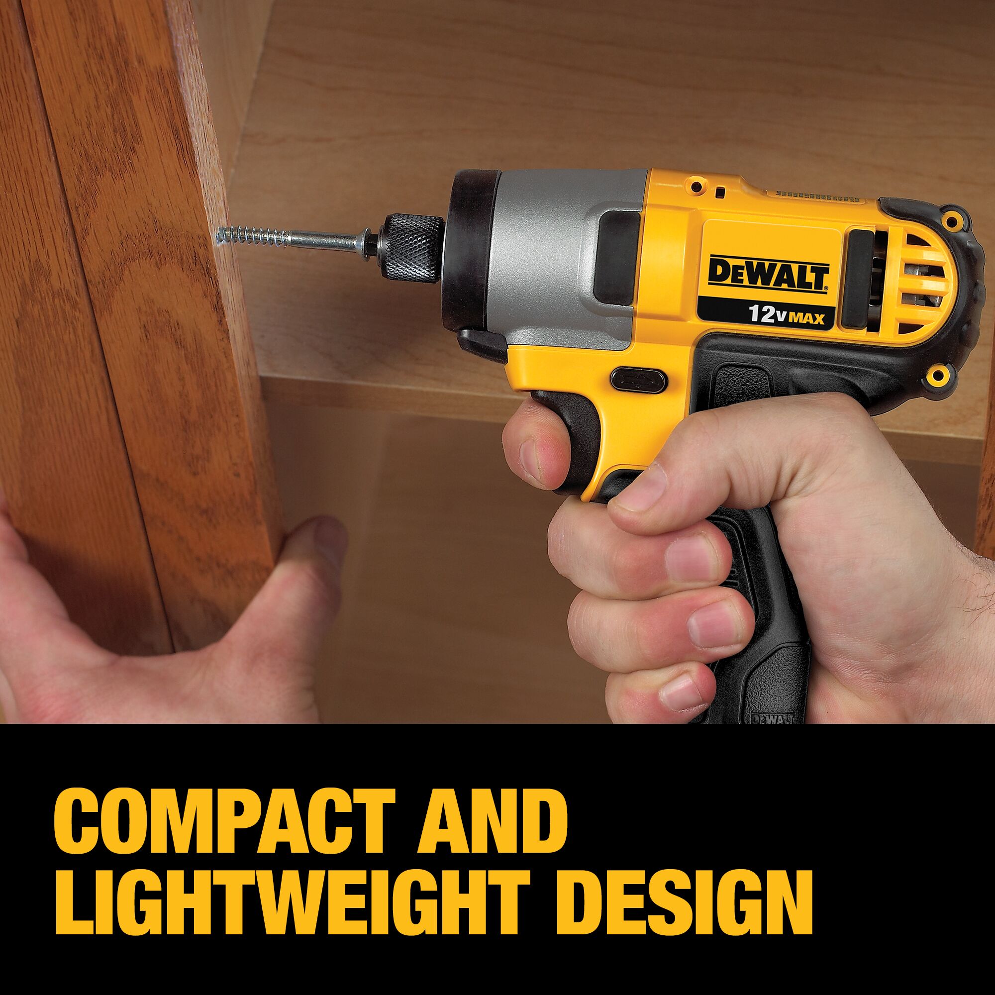 DEWALT®’s 12V MAX* lithium ion impact driver and impact wrench. At just over two pounds, the small, lightweight design of these tools is ideal for cabinetmakers and HVAC professionals, as well as electrical, mechanical and general contractors who perform overhead fastening applications. Both products incorporate a contoured handle design and three LED lights that eliminate shadows on work surfaces. Maximum initial battery pack voltage (Measured without a workload) is 12V measured under a workload, nominal voltage is 10.8.